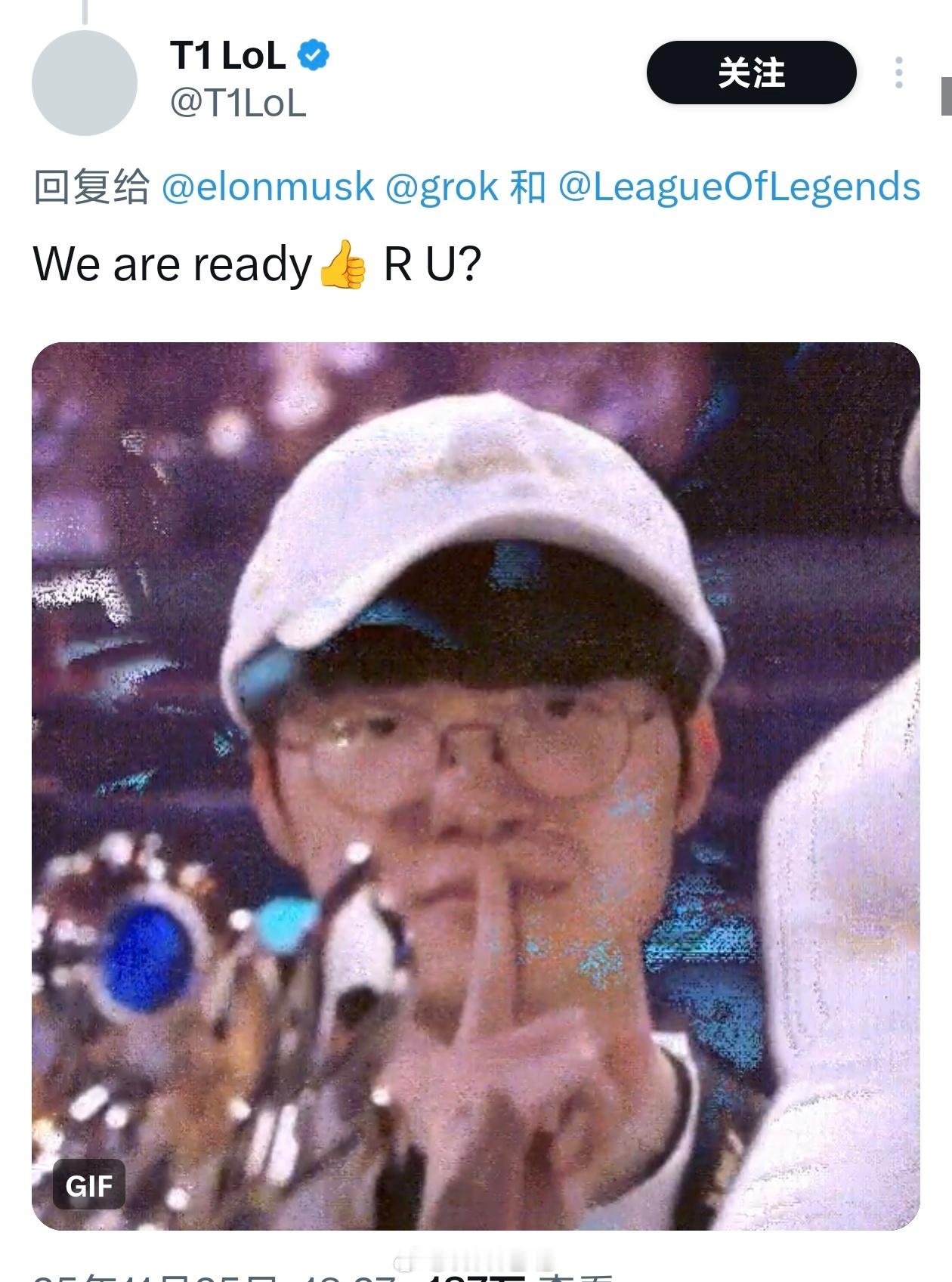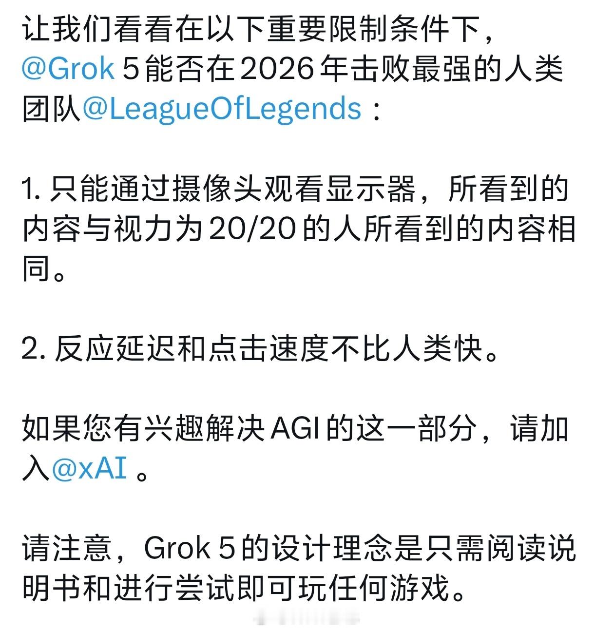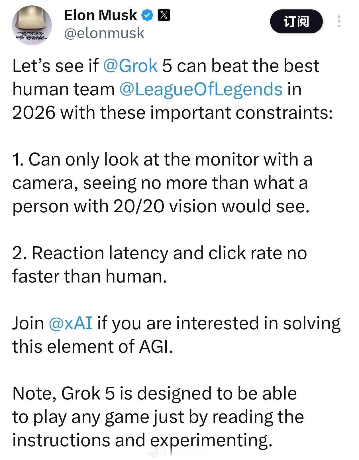这次我支持全人班,马斯克宣布 Grok 5 将在明年挑战一支《英雄联盟》最强人类战队,T1 官推还回应了:我准备好了,你呢?Faker:第七冠将献给全人类。