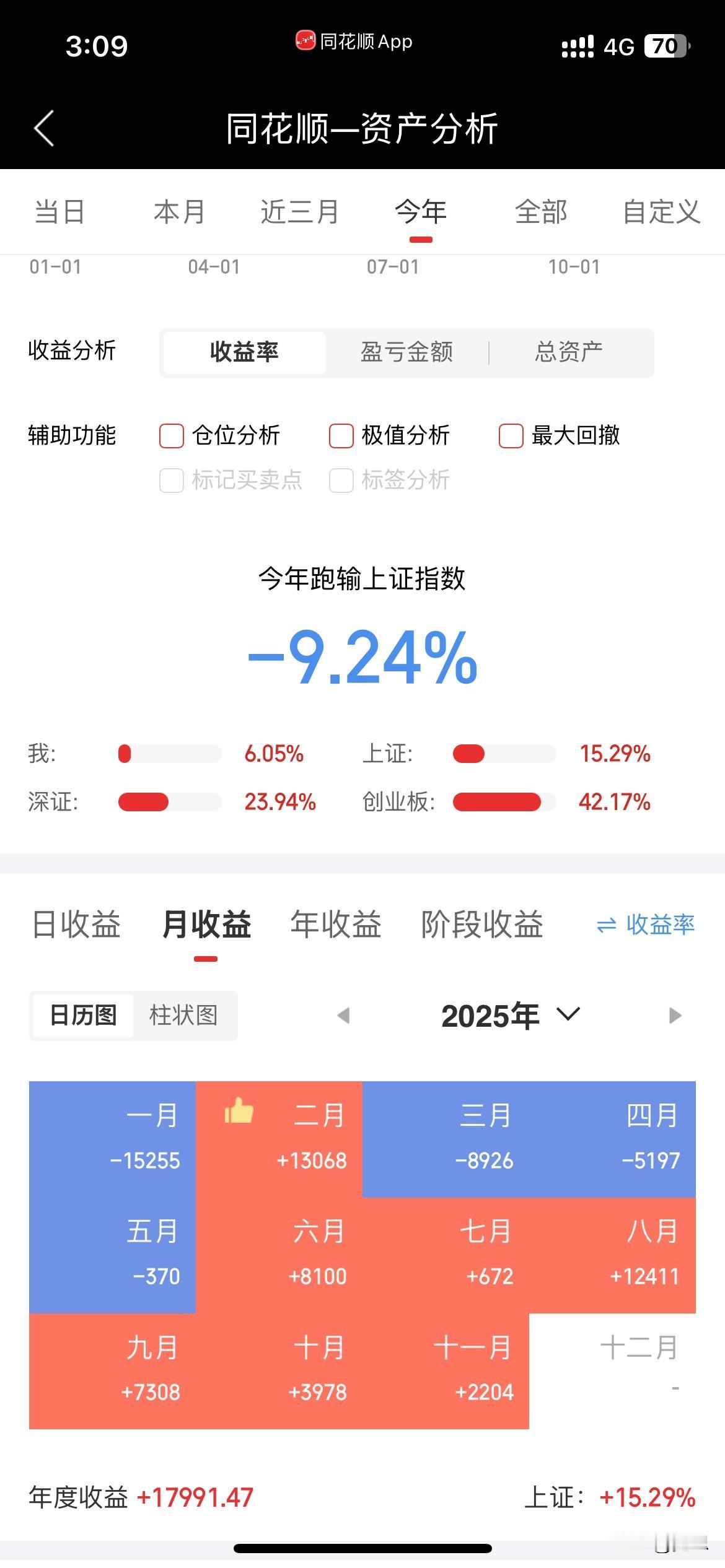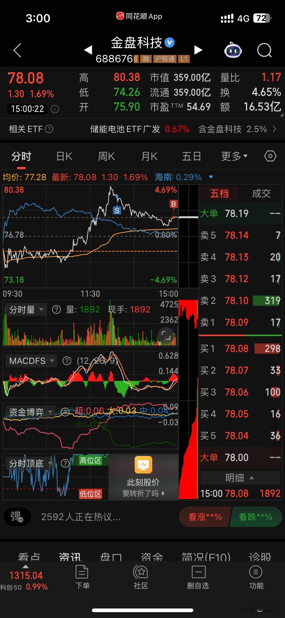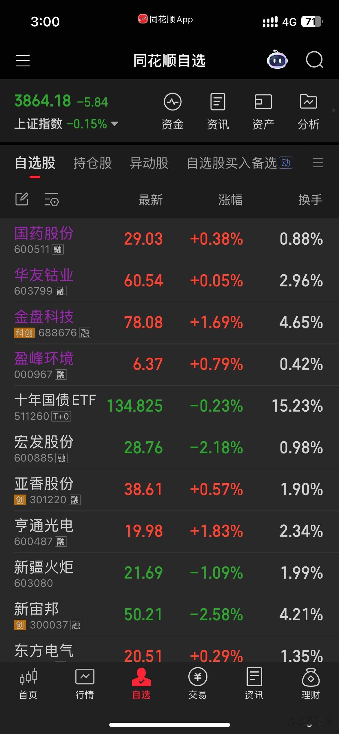 收盘了,下午大盘果然弱势回落。2点左右沪指翻绿了。其实只要看大盘成交量下午继续萎靡不振就能猜到顶不住要跌了。今天金盘又做了个T。收盘账户红了不到1千。少量出了点华友。目前持有国药,盈峰,金盘和华友。3成多仓位。继续维持低仓位,还有2个交易日,希望11月继续红盘。这样就达到连续6个月红盘了[害羞]。现在不求大赚,只求稳定微利就可以了。