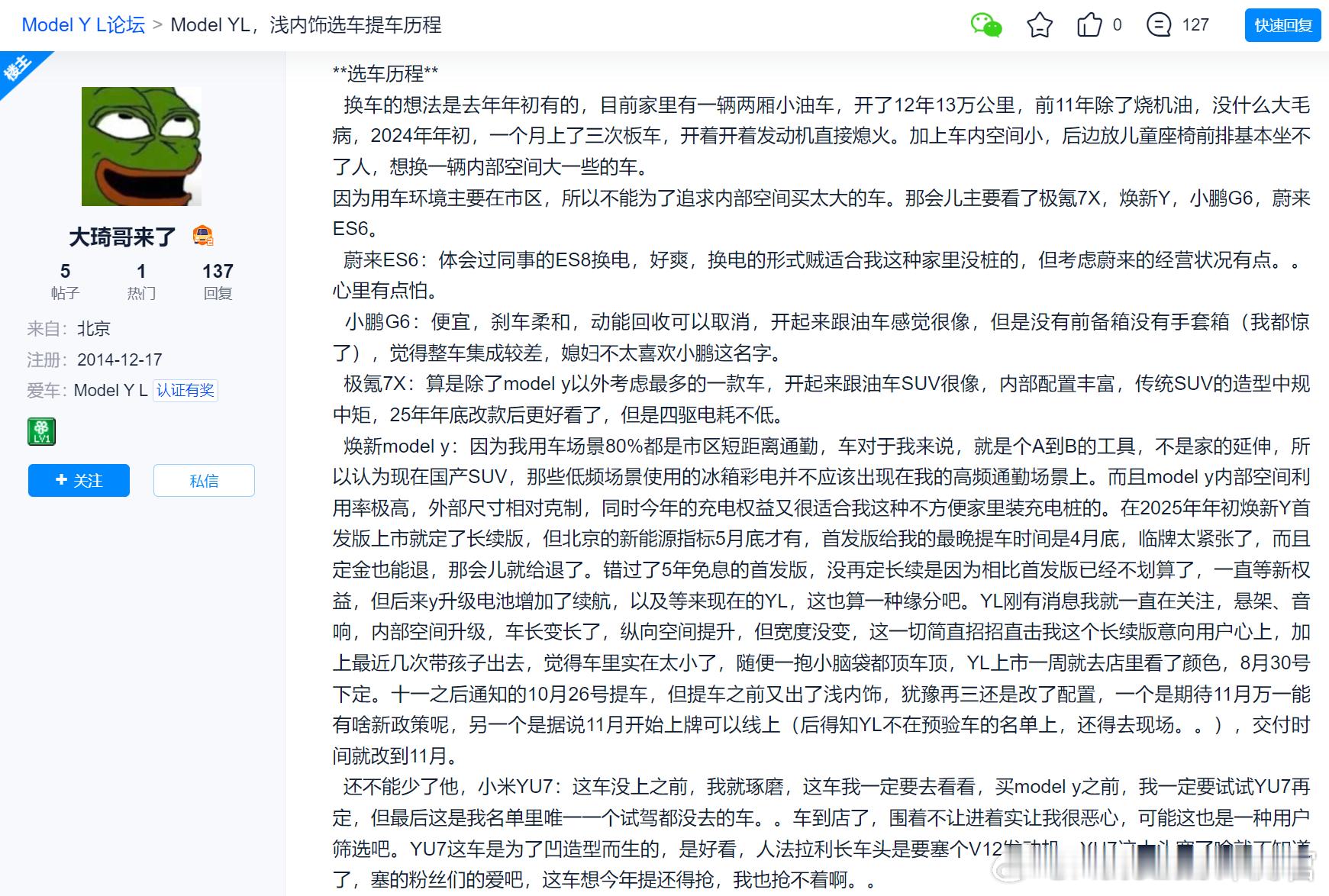 看到一位网友体验完极氪7X、小鹏G6、蔚来ES6,最后选了Model YL,原因还挺有意思。他认为车就是个A到B的工具,不是家的延伸,国产的彩电、冰箱不如送特斯拉送充电权益。大家在买电车的时候,会特别关注充电权益吗