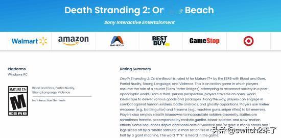 《死亡搁浅2》PC版已正式通过ESRB评级!被划分为M级(17+)。评级信息显示,这是一款以后末世社会重建为背景的动作游戏,玩家将扮演快递员山姆在开放世界中完成物资运送任务。 游戏采用第三人称视角,玩家在执行派送任务过程中将与人类士兵、机械单位及灵体生物交战。战斗系统包含使用战斗吉他等近战武器与机枪、狙击步枪等枪械击杀敌人,也可通过潜行制服对手。交战过程中会呈现逼真的枪火特效及慢动作镜头,部分场景包含更具冲击力的暴力刻画。