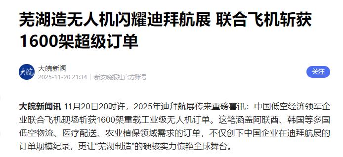 此次,迪拜航展中国斩获1600架订单位居榜首,印度0订单无缘榜单! 这1600架订单的来头,这可不是某一款"爆款"撑场面,而是整个航空产业链集体发力的结果,其中工业级无人机绝对是挑大梁的角色。 现在中国早就是全球第一大民用无人机出口国,相关专利申请量占了全球70%以上,技术硬实力摆在那儿。 就像联合飞机集团带来的那些"大家伙",从沙漠里的物流配送,到农田的植保作业,再到油田的电力巡检,全是中东市场急需的本事。 美团无人机更是早就拿到了迪拜的运营资质,在硅谷绿洲区天天给当地人送快餐、应急药,当地人都用习惯了。 TD550无人直升机,在中东油田里拉着重物穿梭自如,阿联酋和韩国的客户看完现场演示,当场就签了合同。 不光是小个头的无人机,咱们的大飞机这次也在迪拜赚足了目光。C919这还是头一回飞到中东,空中表演时姿态又稳又灵活。 作为咱们自主研发的干线客机,它对标波音737和空客A320,商业运营两年多,开了30多条国内航线,载了超200万人次,从没出过安全问题,准点率在国内都是靠前的。 以前中东航司都是波音、空客的死忠粉,现在主动找上门,这就是对中国智造最实在的认可。截至目前,C919的累计订单已经突破1000架,交付也有26架了,发展势头特别稳。 印度航空产业的问题,根子就在急功近利又不肯下苦功。总想着靠买技术"攒"出先进装备,不愿意花时间搞自主研发。 就说无人机领域,印度去年才推出一款国产无人机,续航只有20分钟,载重不到1公斤,别说工业作业了,连简单的侦察都费劲,性能还不如咱们十年前的产品。 而咱们国家从无人机的芯片、发动机到控制系统,全都是自己造的,形成了完整的产业链,成本能控制住,性能有保障,出了问题还能快速改进。 就像大疆的农业无人机,卖到全球100多个国家,美国农民买一台才3.5万美元,比当地传统设备便宜多了,效率还高不少,这就是全产业链的优势。 其实这1600架订单不是天上掉下来的,是咱们十几年一步一个脚印攒出来的。 从2009年翼龙首次出口,到现在畅销几十个国家;从C919立项,到今天累计订单破千架,每一步都走得特别扎实。 咱们的航空企业知道,国际市场只认实力,所以在研发上从不吝啬,翼龙系列迭代好几代,每次都根据客户的实战反馈升级。而印度总想着走捷径,结果越急越慢,越赶越落后。 1600架订单的背后,是无数科研人员的日夜攻关,是中国制造业的全面升级;印度的零订单,则是急功近利发展模式的一记警钟。 看着咱们的飞机一架架签下订单,真的让人热血沸腾。以前咱们买别人的飞机要看脸色,现在轮到别人抢着买咱们的产品,这就是大国崛起的底气。 印度要是不改变思路,继续在"组装"路上走下去,下次航展恐怕还是只能当看客。而中国航空业的路会越走越宽,因为我们清楚,只有靠自己的双手,才能真正掌握话语权。
