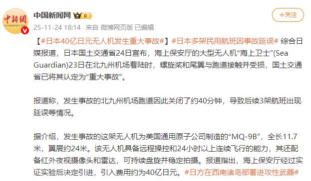 日本宣布了! 11月24日,综合日媒报道,日本海上保安厅的大型无人机“海上卫士”23日在北九州机场着陆时,螺旋桨和尾翼与跑道接触并受损,国土交通省已将其认定为“重大事故”。 日本海上保安厅那架刚从东海巡航回来的“海上卫士”无人机,本想稳稳落地交差,结果硬生生给跑道磕了个响头,上演了一出教科书级别的“脸刹”大戏。 这架全长11.7米、翼展能到24米的大家伙,一头歪在跑道边,螺旋桨叶片弯得跟麻花似的,垂直尾翼磨得全是坑洼。 起落架直接塌了半边,连滑回停机位的力气都没了,当场瘫在那儿动弹不得。 机场工作人员吓得赶紧封锁跑道,消防队都紧急赶了过来,这一闹就是40多分钟,后续3架民航航班全被堵得结结实实。 转过天国土交通省一通报,直接给这事儿定了性——“重大航空事故”,黑匣子都连夜运回东京查原因了。 谁能想到,这架花了40亿日元(合人民币两千多万)的烧钱宝贝疙瘩,没在东海立下半分功劳,倒先在自家机场给日本人丢了大脸。 这无人机可不是普通装备,日本把它当宝贝似的,全日本仅有的3架全部署在了北九州,就因为这儿离东海近,想靠着它40多个小时的长续航能力,24小时盯着钓鱼岛周边的动静。 他们打2022年就开始从美国引进这款MQ-9B无人机,2025年的预算里更是砸了415亿日元,计划再增购2架,野心昭然若揭,说白了就是想靠这玩意儿在东海刷存在感。 可谁能想到,满心指望的“天眼”,转眼就变成了自带风险的“麻烦制造者”。 这事儿真不是运气差,全是早埋好的坑。MQ-9B是美国通用原子公司造的,美军自己用着都头疼,数据摆在那儿,每飞行一千小时就得出0.2次事故,飞五千小时基本就得摊上事儿。 最近这大半年,这型号更是像中了魔咒:驻韩美军9月刚部署的同款,俩月就扎进了海里; 南海那边美军的机子更离谱,两个月内连掉两架;2023年非洲还有一架因为发动机故障,烧着了往下坠。就连胡塞武装都能连着击落三架MQ-9系列,足见这玩意儿有多脆皮。 这么多前车之鉴,日本偏要花大价钱往家里搬,这不就是主动跳火坑嘛。 这次的事故,更是把“马虎”俩字刻在了脑门上。 这无人机着陆全靠GPS和惯性导航,说明书里白纸黑字写着,风速超过12米/秒绝对不能着陆,可北九州机场常年风速都在15米/秒以上,妥妥的七级风。 更要命的是,无人机降到50米高度准备落地时,突然遇上了风切变,按说系统该立刻报警,结果足足迟了2秒。 比装备不靠谱更要命的是,日本压根没人能玩转这高端玩意儿。 美国通用原子公司在北九州招操作员,要求不算低:得有300小时飞行经验,还得会说英语接受培训,结果招了大半年都没招够。 没办法只能从美国外聘,这次出事的操作员十有八九就是美国人。让外人操控关乎自己“防御”的核心装备,操作熟不熟练、应急反应跟不跟得上都不好说,这根本就是把安全当儿戏。 无人机操作讲究得很,从气象判断到应急处置,每一步都得专业,国内搞无人机培训都得理论实践双过关,日本倒好,直接把关键岗位拱手让人。 这起事故也给咱们提了个醒,国家安全从来不是靠买出来的,自主创新的硬实力,才是最稳的底气。