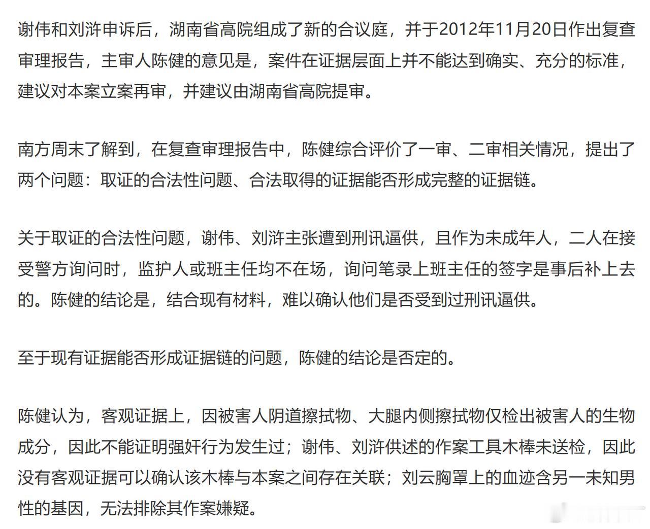 关于“冷水江女老师被奸杀”案,网上看到的疑问 关于“冷水江女老师被奸杀”案。好像两高中生现在都不认罪,所以不可能减刑, 其实,认为这案子应当重审的,还有两名主审人及一名省高院领导。 据南方周末报道,2010年12月3日,湖南省高院法官谭青峰就此事作出二审审理报告。 主审人谭青峰认为,客观证据和鉴定结论不能证明谢伟、刘浒作案,为避免出现冤假错案,他倾向于撤销原判,发回重审。 但合议庭另两名成员则认为,能够证明系谢伟、刘浒作案,且分管副庭长认为,该案情节恶劣、民愤极大,拟同意维持原判。 5天后,湖南省高院作出了驳回上诉、维持原判的裁决。 据了解,包括二审审理报告在内,自2010年12月至2017年3月,湖南省高院就本案是否应该重审、再审,先后形成了4份内部意见。 在谢伟和刘浒提出申诉后,湖南省高院又组成了新的合议庭,并于2012年11月20日作出复查审理报告。 主审人陈健再次提出意见称,案件在证据层面上并不能达到确实、充分的标准,建议对本案立案再审,并建议由湖南省高院提审。 关于取证的合法性问题,主审人陈健认为,谢伟、刘浒主张遭到刑讯逼供,且作为未成年人,二人在接受警方询问时,监护人或班主任均不在场,询问笔录上班主任的签字是事后补上去的。 陈健的结论是,结合现有材料,难以确认他们是否受到过刑讯逼供。 至于现有证据能否形成证据链的问题,陈健认为无法形成完整证据链。 陈健称,在客观证据上,因被害人阴道擦拭物、大腿内侧擦拭物仅检出被害人的生物成分,因此不能证明强奸行为发生过;谢伟、刘浒供述的作案工具木棒未送检,因此没有客观证据可以确认该木棒与本案之间存在关联;刘云胸罩上的血迹含另一未知男性的基因,无法排除其作案嫌疑。 此外,在口供证据上,陈健认为也存在一定的瑕疵。 根据冷水江警方二审补交的被害人内裤照片,内裤中间偏右位置有一处较长的不整齐的裂口,应为人为撕裂,但谢伟、刘浒均未供述曾撕扯刘云的内裤。 复查审理报告还提出,一些关键证据的取得也存在瑕疵。 2012年12月3日,原二审合议庭作出合议庭复查评议报告,同意湖南省高院启动再审。 但之后就没有了下文。 2017年2月28日,湖南省高院作出初查报告,透露了迟迟没有启动再审的原因是“原办案单位负责人不同意启动再审”,初查报告建议依法立案审查,结论是不能排除第三人作案的可能。 2017年3月9日,湖南省高院一领导对初查报告作出批示,意见为“本案客观证据欠缺,关键问题上存在矛盾”。 但遗憾的是,两被告盼望已久的再审仍未启动。
