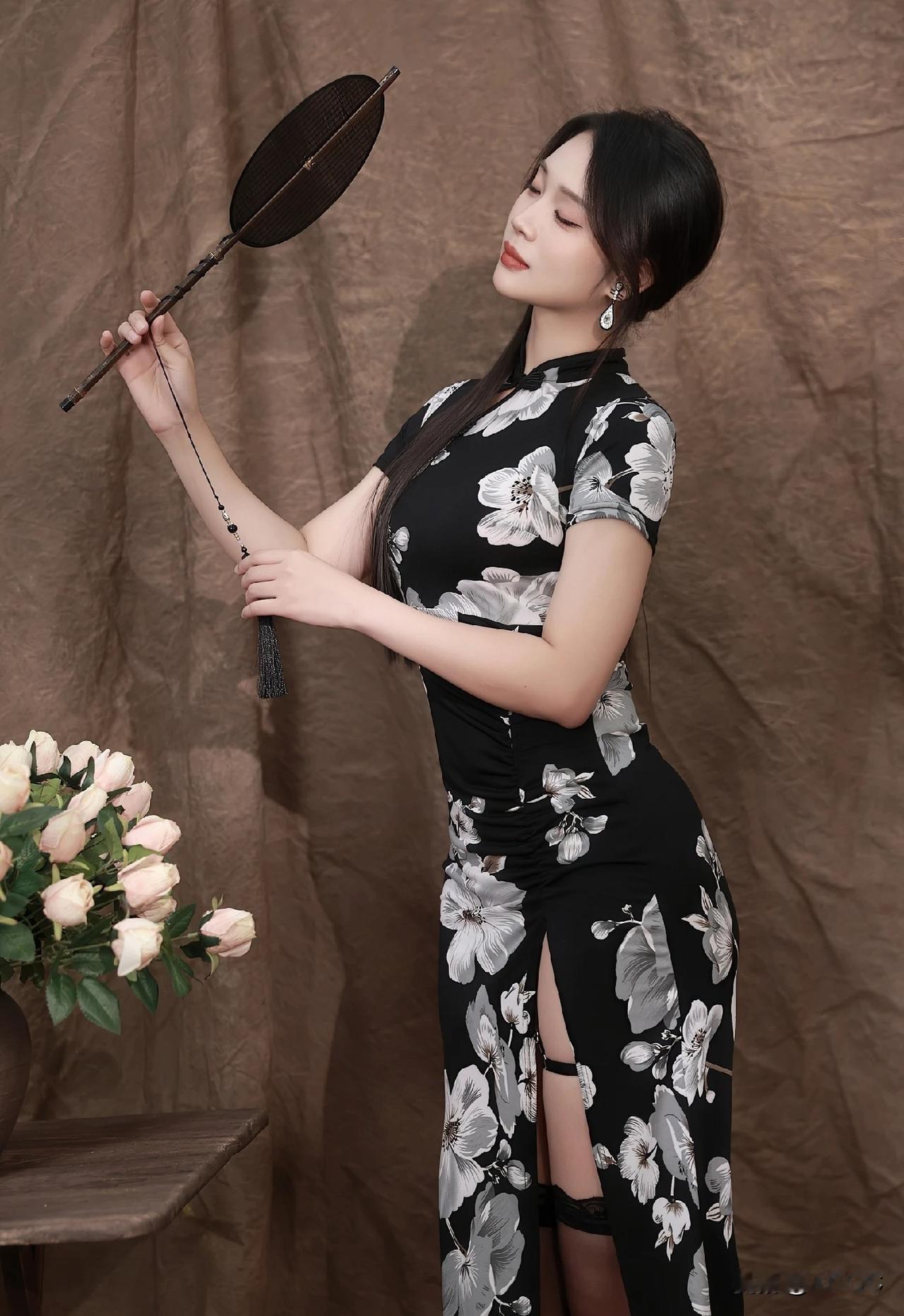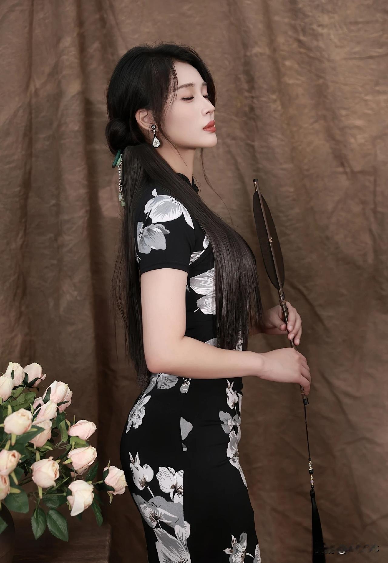 旗袍的配饰有哪些你知道吗?黑裙花影,古韵悠长,一扇团扇,尽显东方韵味。除了团扇