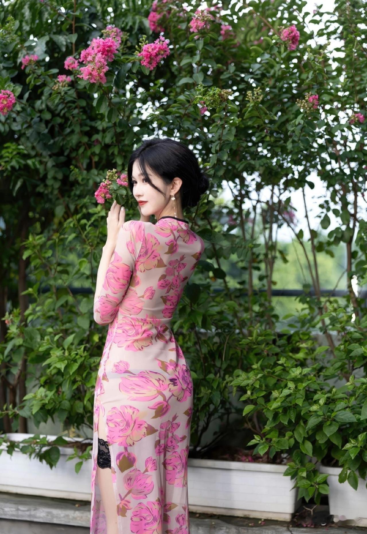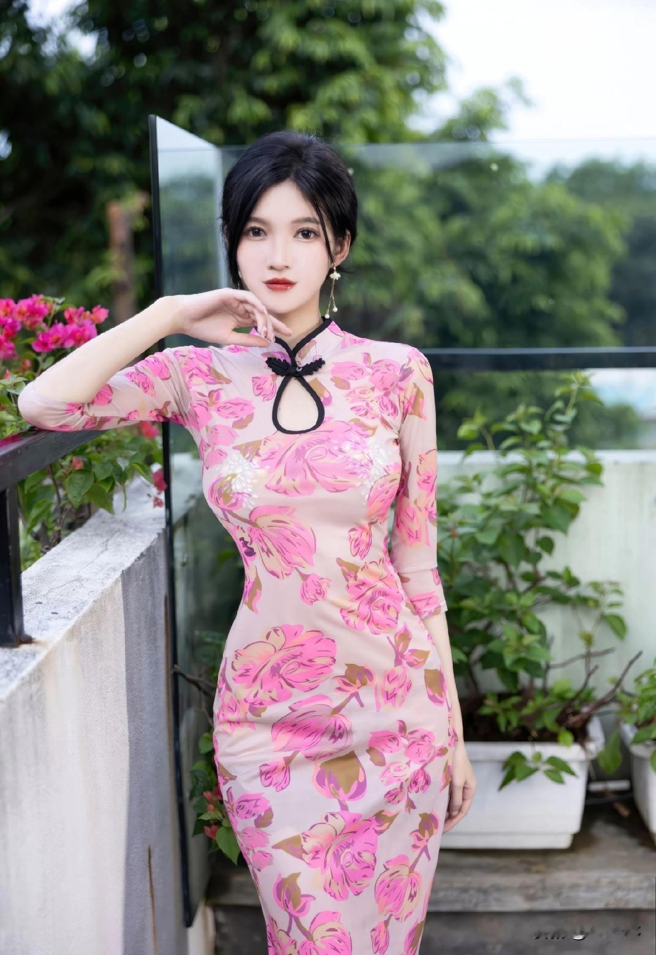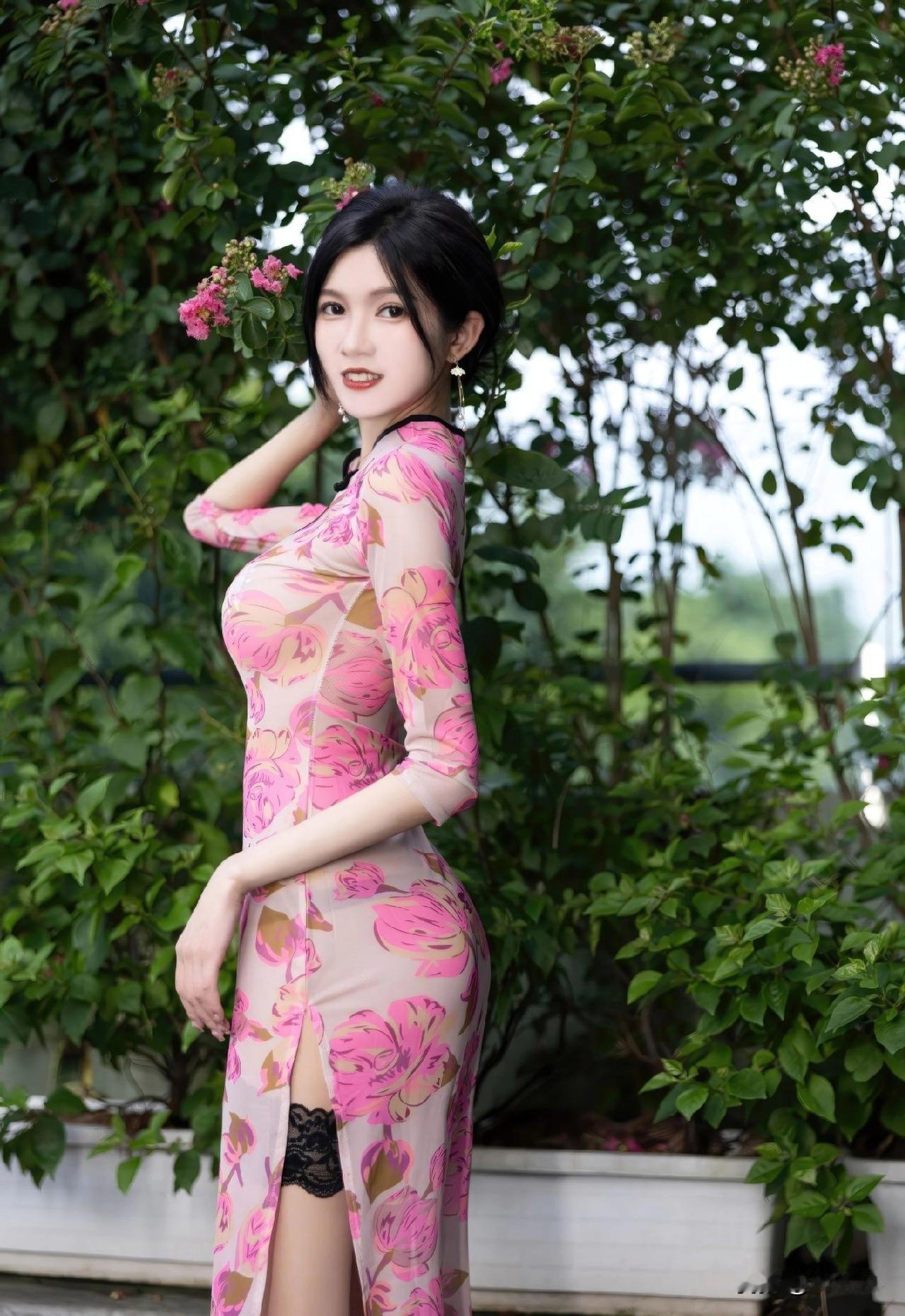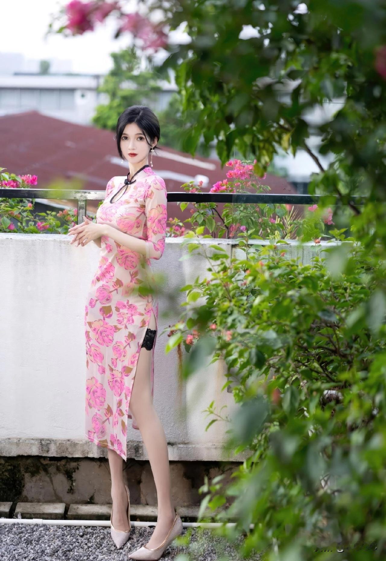 旗袍给予什么样女性美?粉色旗袍是这一系列的主旋律。从淡粉底色的含蓄内敛,到玫红花朵的绚烂绽放,每一件旗袍都诉说着不同的故事。高开衩设计隐约透出的黑色蕾丝,领口精致的盘扣,袖口细腻的滚边,无不体现着东方服饰的匠心独运。旗袍不仅是一件衣物,更是一种文化符号,它将东方女性的曲线美展现得淋漓尽致,却又含蓄典雅。 画面中的女子们或侧身立于石阶,或优雅倚靠围栏,或抬手轻抚脸颊。她们的乌黑短发或盘髻,配以精致妆容和亮眼红唇,在自然光线下熠熠生辉。细长耳饰随着动作微微晃动,为静态的画面注入了灵动的气息。浅色高跟鞋不仅拉长了身型,更与旗袍的优雅相得益彰。 背景环境选择极具巧思。灰白墙面与黑色栏杆构成了简约的几何背景,凸显了旗袍的绚烂色彩。郁郁葱葱的绿植与绽放的粉红花朵则提供了柔和的自然框架,使人物与环境和诸相融。石阶上的落叶,地面散落的花瓣,这些细节为画面增添了静谧的诗意。 特别值得注意的是光影的运用。自然光线柔和地洒在旗袍上,面料的光泽与质感得以完美呈现。在有些照片中,模糊的背景处理使主体更加突出,形成了虚实相生的视觉效果。 这组照片不仅展现了旗袍的外在美,更捕捉到了东方美学的内在精神。端庄而不失风情,典雅中透着时尚,正是现代东方女性的完美诠释。在快节奏的当代社会,这样的影像让我们得以驻足,品味传统与现代的完美融合,感受那份跨越时空的温婉与雅致。 旗袍女子与自然环境的对话,构成了一幅幅动人的画面,它们不仅记录了美丽,更传递了一种生活态度——在喧嚣世界中保持内心的宁静与优雅,这正是东方美学的精髓所在。