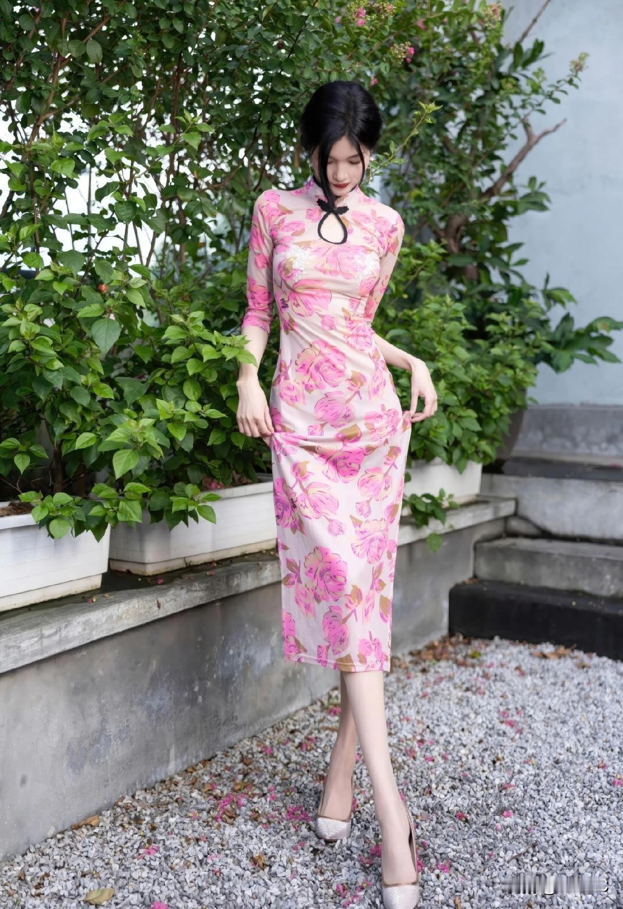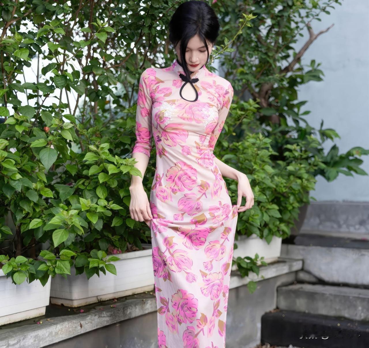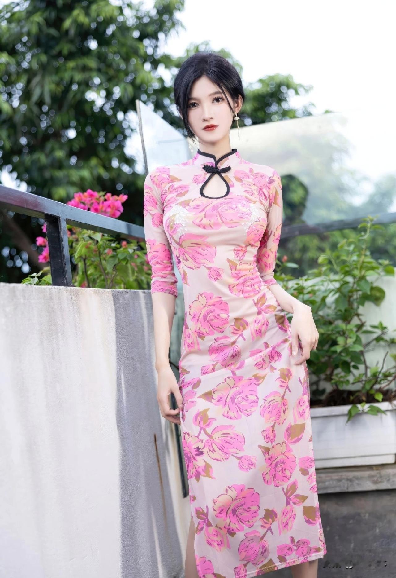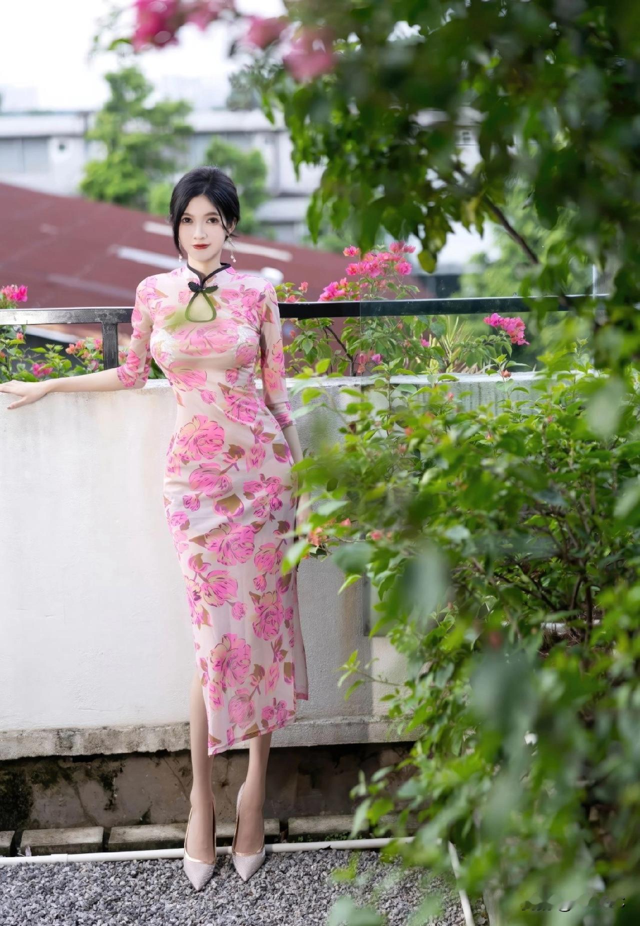 旗袍给予什么样女性美?粉色旗袍是这一系列的主旋律。从淡粉底色的含蓄内敛,到玫红花朵的绚烂绽放,每一件旗袍都诉说着不同的故事。高开衩设计隐约透出的黑色蕾丝,领口精致的盘扣,袖口细腻的滚边,无不体现着东方服饰的匠心独运。旗袍不仅是一件衣物,更是一种文化符号,它将东方女性的曲线美展现得淋漓尽致,却又含蓄典雅。 画面中的女子们或侧身立于石阶,或优雅倚靠围栏,或抬手轻抚脸颊。她们的乌黑短发或盘髻,配以精致妆容和亮眼红唇,在自然光线下熠熠生辉。细长耳饰随着动作微微晃动,为静态的画面注入了灵动的气息。浅色高跟鞋不仅拉长了身型,更与旗袍的优雅相得益彰。 背景环境选择极具巧思。灰白墙面与黑色栏杆构成了简约的几何背景,凸显了旗袍的绚烂色彩。郁郁葱葱的绿植与绽放的粉红花朵则提供了柔和的自然框架,使人物与环境和诸相融。石阶上的落叶,地面散落的花瓣,这些细节为画面增添了静谧的诗意。 特别值得注意的是光影的运用。自然光线柔和地洒在旗袍上,面料的光泽与质感得以完美呈现。在有些照片中,模糊的背景处理使主体更加突出,形成了虚实相生的视觉效果。 这组照片不仅展现了旗袍的外在美,更捕捉到了东方美学的内在精神。端庄而不失风情,典雅中透着时尚,正是现代东方女性的完美诠释。在快节奏的当代社会,这样的影像让我们得以驻足,品味传统与现代的完美融合,感受那份跨越时空的温婉与雅致。 旗袍女子与自然环境的对话,构成了一幅幅动人的画面,它们不仅记录了美丽,更传递了一种生活态度——在喧嚣世界中保持内心的宁静与优雅,这正是东方美学的精髓所在。