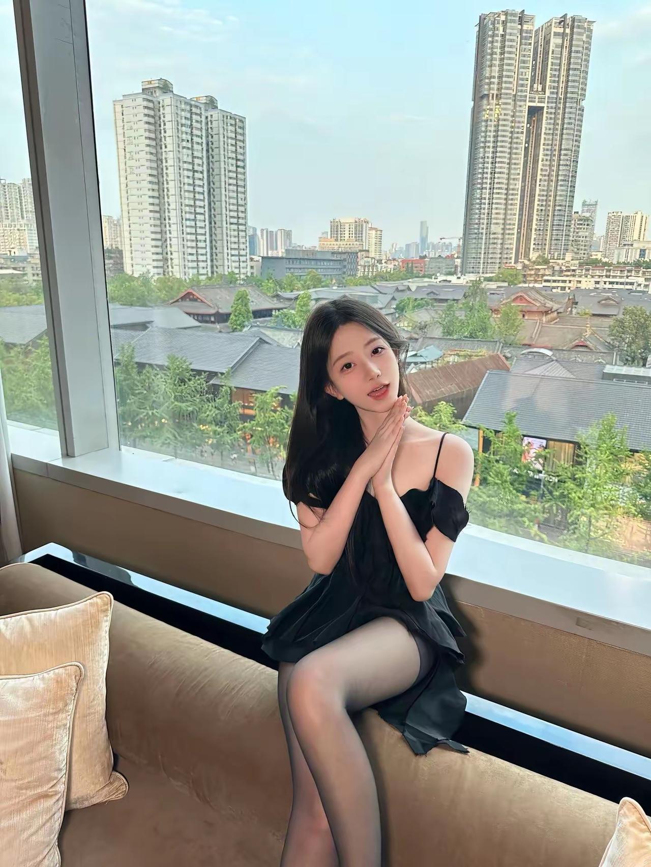 黑裙与城景的优雅协奏 在落地窗前,黑色小裙的灵动邂逅都市建筑的冷峻,一柔一刚