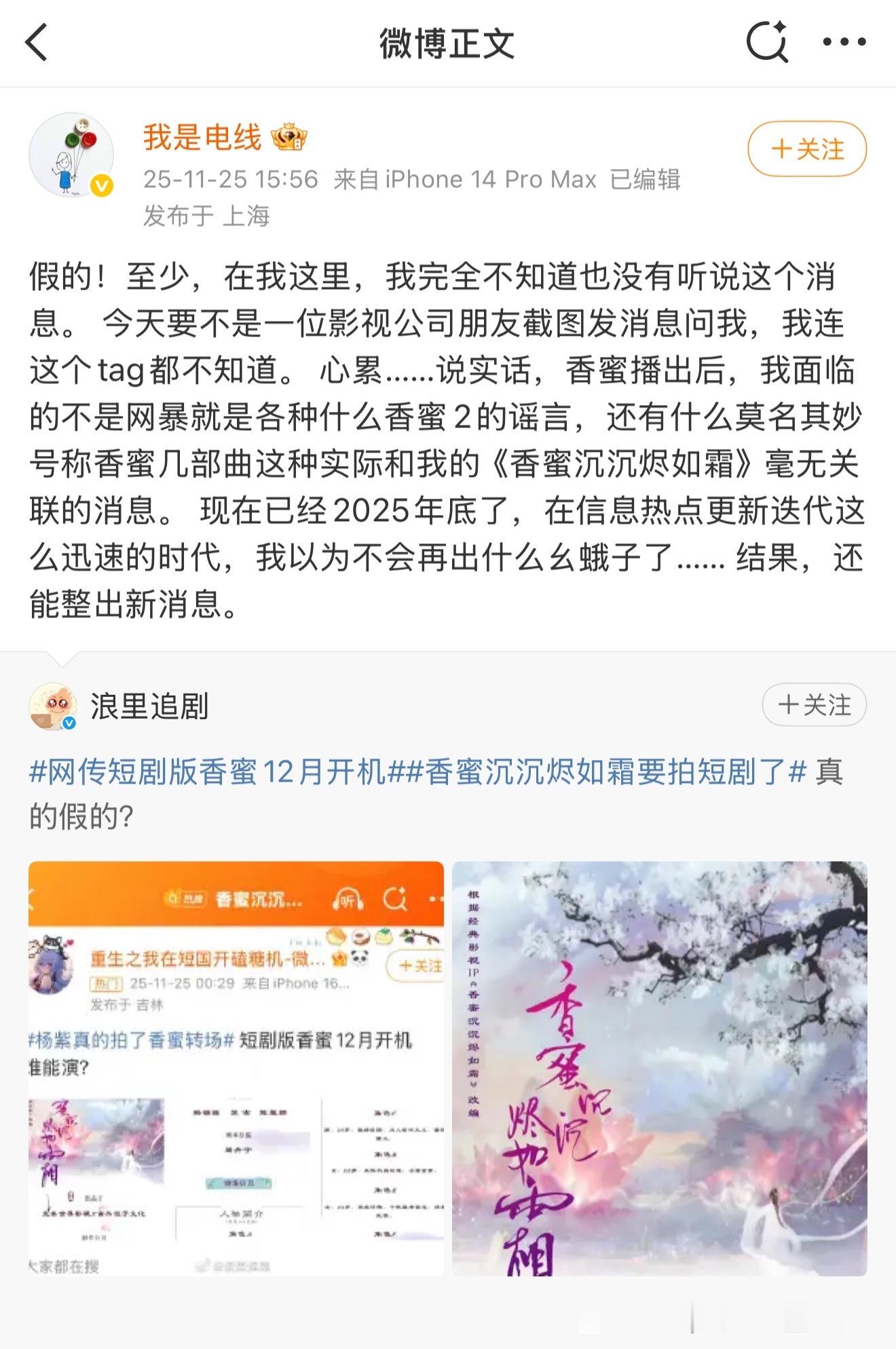 啊香蜜要拍短剧了?制片人发文称决定重启这个故事,还带了香蜜短剧的话题。昨天原著作者曾发文辟谣:“假的!至少,在我这里,我完全不知道也没有听说这个消息。”香蜜要成拍短剧了 香蜜作者称不知道短剧消息