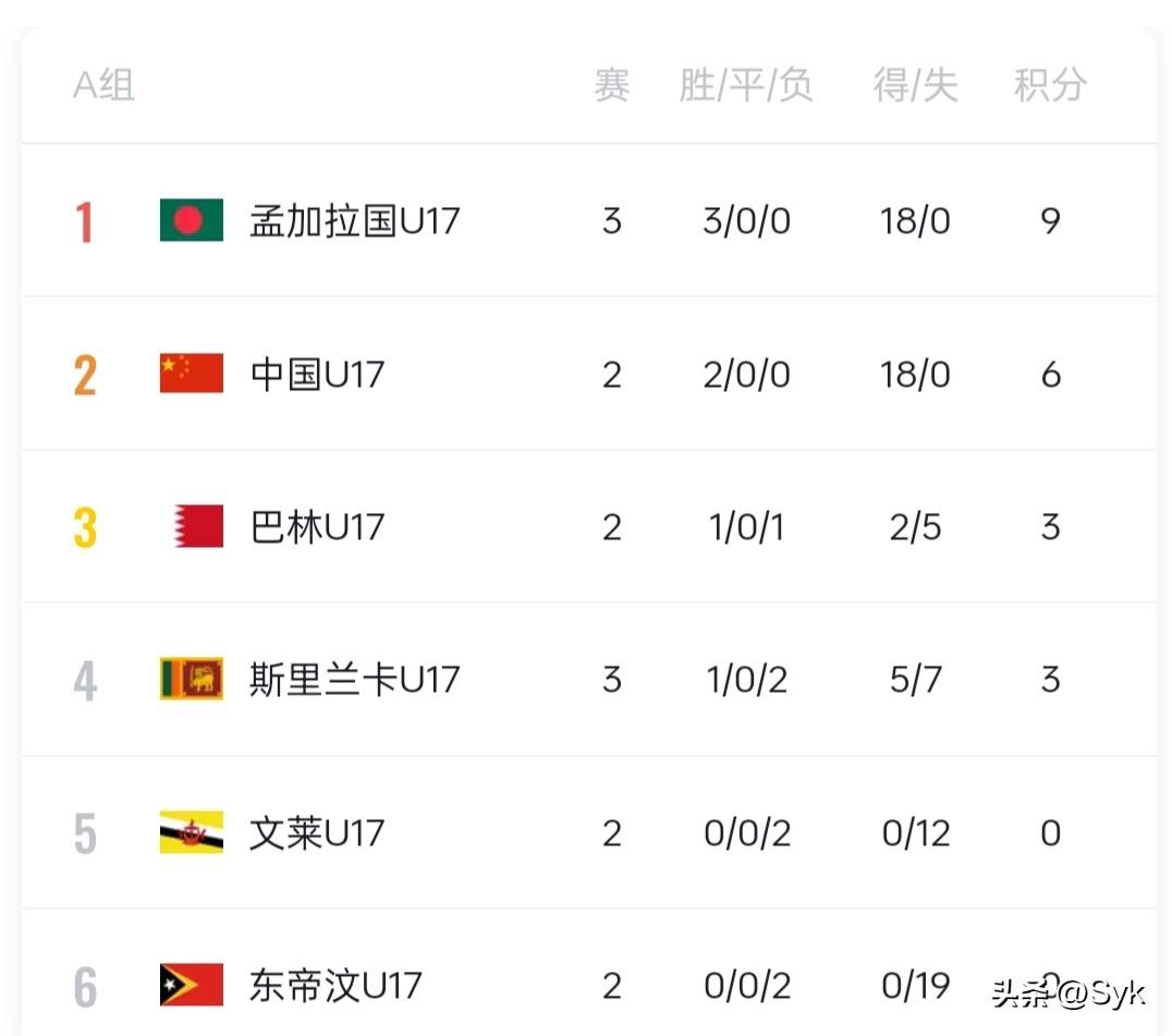 男足亚洲杯预选赛孟加拉国U17又赢球了! 5:0血洗斯里兰卡, 三战全胜狂轰18球还0失球, 23分钟就先拔头筹, 上半场收俩, 下半场补时阶段直接连轰2球, 最终比分定格在5-0。 再看同组的中国U17, 两战全胜同样轰入18球且零失球, 少赛一场暂时排名第二。 今晚对阵文莱, 以中国队这势头, 大概率要火力全开冲两位数比分, 毕竟谁不想把出线优势拉满? 现在A组前两名就是孟加拉国和中国的“双雄争霸”,不过咱中国队状态正盛, 最后一场只要拿下孟加拉国, 就能以全胜姿态锁定小组第一, 稳稳拿到亚洲杯的晋级门票。 看好中国这批年轻球员, 青春对决, 咱有底气,中国队,加油!