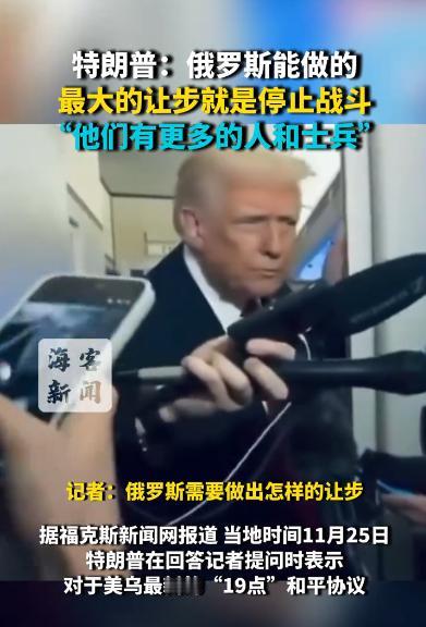 关于俄乌冲突,美国总统说了一句大实话,他说:俄罗斯能做的最大的让步就是停止战斗。因为他们有更多的人和士兵!大家都知道,美国和俄罗斯弄了一个停火的28点计划,但欧盟和乌克兰不同意,希望俄罗斯继续让步。现在美国总统说的很清楚,同意停火,就已经是俄罗斯最大的让步了。我认为这是一句大实话。就目前这个局势来看,俄罗斯其实并不着急停火。继续打下去,对于俄罗斯来说,并不是什么坏事。实际上,美国也知道这个情况。倒是乌克兰和欧盟,还在装睡,不愿意接受现实!