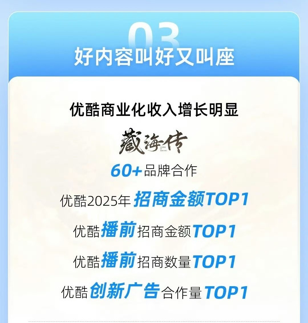 优酷再发战报!Q2又拉肖战藏海传来暑期档撑脸面,再次认证藏海传是: 优酷2025年招商金额TOP1优酷播前招商金额TOP1优酷播前招商数量TOP1优酷创新广告合作量TOP1