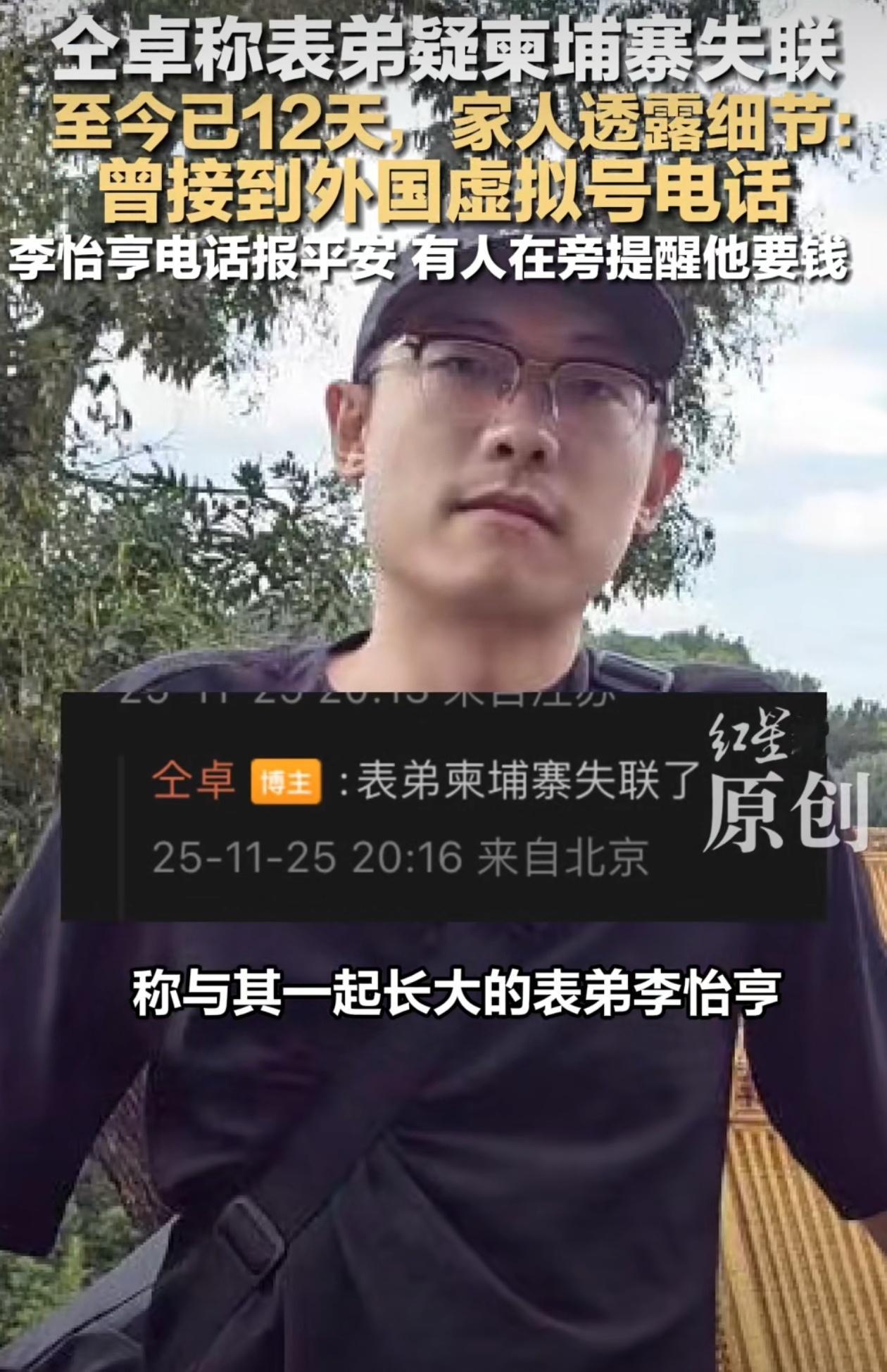 仝卓表弟手机最后定位附近有园区原知名歌手仝卓近日发文求助,其表弟李怡亨以 “南宁展会临时工作” 为由外出后,于11月13号失联,至今已超13天。家人通过手机定位发现,他最后的信号出现在柬埔寨班迭棉吉省 —— 一片电诈园区集中区域,而且失联后曾有外国虚拟号来电,李怡亨声音虚弱且身旁有人指挥要钱,一句“我想回家”让单亲母亲心碎不已。 说一个我一朋友A多年前的真实例子,当时A去南方某市上大学,刚去没两天,宿舍里的固定电话接到一个电话,开头就是“我是你导师,我声音也听不出来了”,然后通过“你名字还挺好有个性”等话术,一步步套取其个人信息,最可怕的是,最后要邀请其第二天在某地见面,说让某某去接等等。我朋友后来反应过来是诈骗,再次来电话时,直接骂了回去。如果当时按照约定去,后果也是不堪设想。 说这个例子的目的就是想说,虽然现在反诈宣传越来越多,但是同时电诈的手段也在同步升级。通过虚假招聘诱骗,甚至是熟人介绍等方式,仍可能让不少人上当受骗。如果某些工作涉及某些敏感国家,就需要提高警惕,提前核查工作真实性、了解当地安全局势,通过正规渠道办理手续,绝不能轻信高薪诱惑贸然前往。 境外安全无小事,放松警惕可能付出惨痛代价。无论是务工还是出行,都要把安全放在首位,充分评估风险、留存应急联系方式,必要时向使领馆备案。愿李怡亨能平安归来,也希望这起事件能提醒每个人,筑牢安全防线才是底线。热点观点
