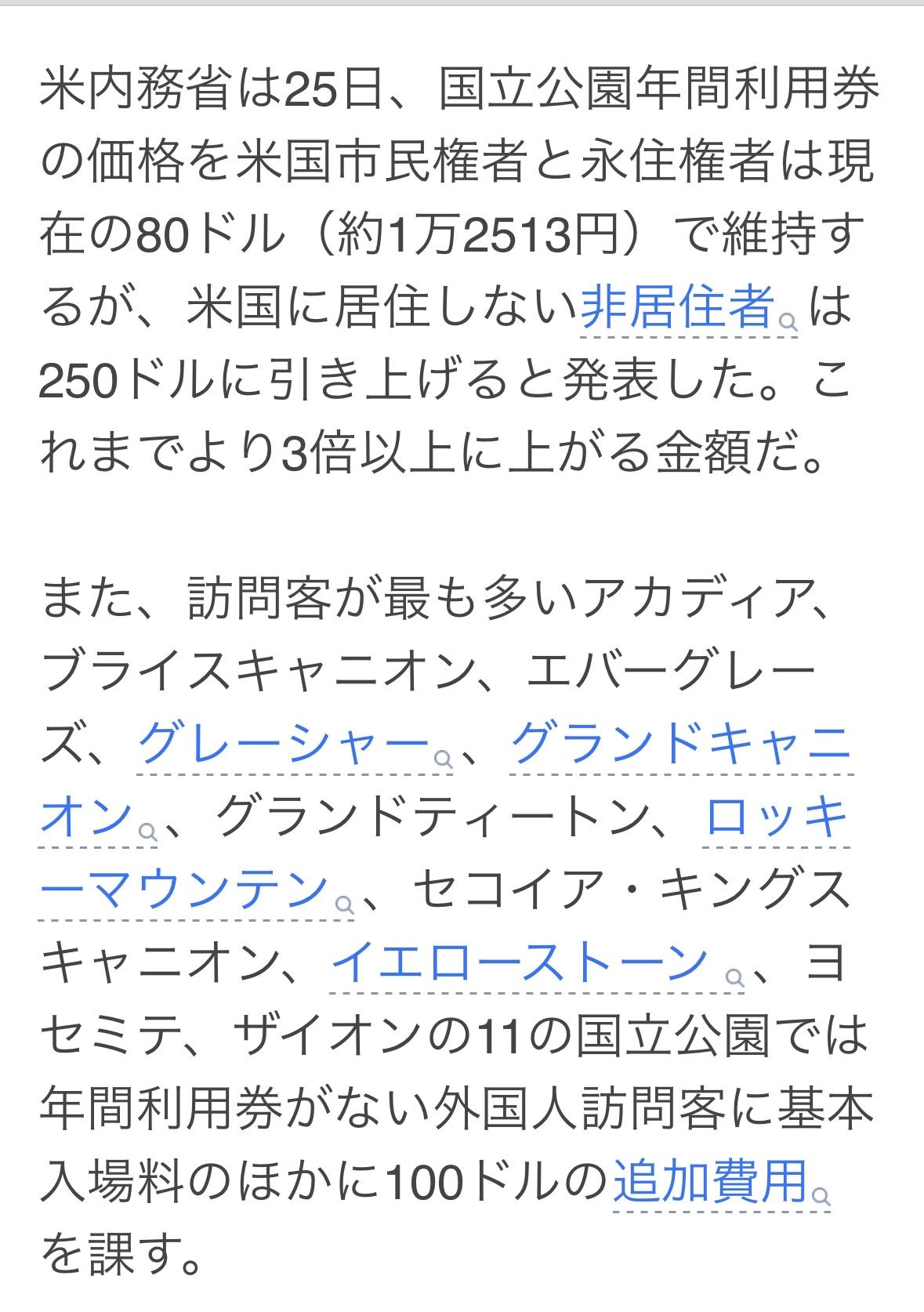 美国内政部25日宣布,明年1月起美国公民和永久居民的国家公园年票价维持在目前的80美元,非美国居民的年票价格将上涨至250美元。 游客最多的11个国家公园——阿卡迪亚国家公园、布莱斯峡谷国家公园、大沼泽地国家公园、冰川国家公园、大峡谷国家公园、大提顿国家公园、落基山国家公园、红杉和国王峡谷国家公园、黄石国家公园、优胜美地国家公园和锡安国家公园——将对没有年票的外国游客在基本门票价格的基础上额外收取100美元。 主要假日的免费入园优惠也仅限美国公民和永久居民。外国游客即使在公共假日也必须支付标准门票价格。向外国游客征收的额外费用将用于保护、维护和改善国家公园。 美国国家公园遍布50个州的433个保护区组成,总面积约344万平方公里。国家公园拥有壮丽的自然风光,每年吸引着众多国内外游客,2024年游客数量已达到331万人次。