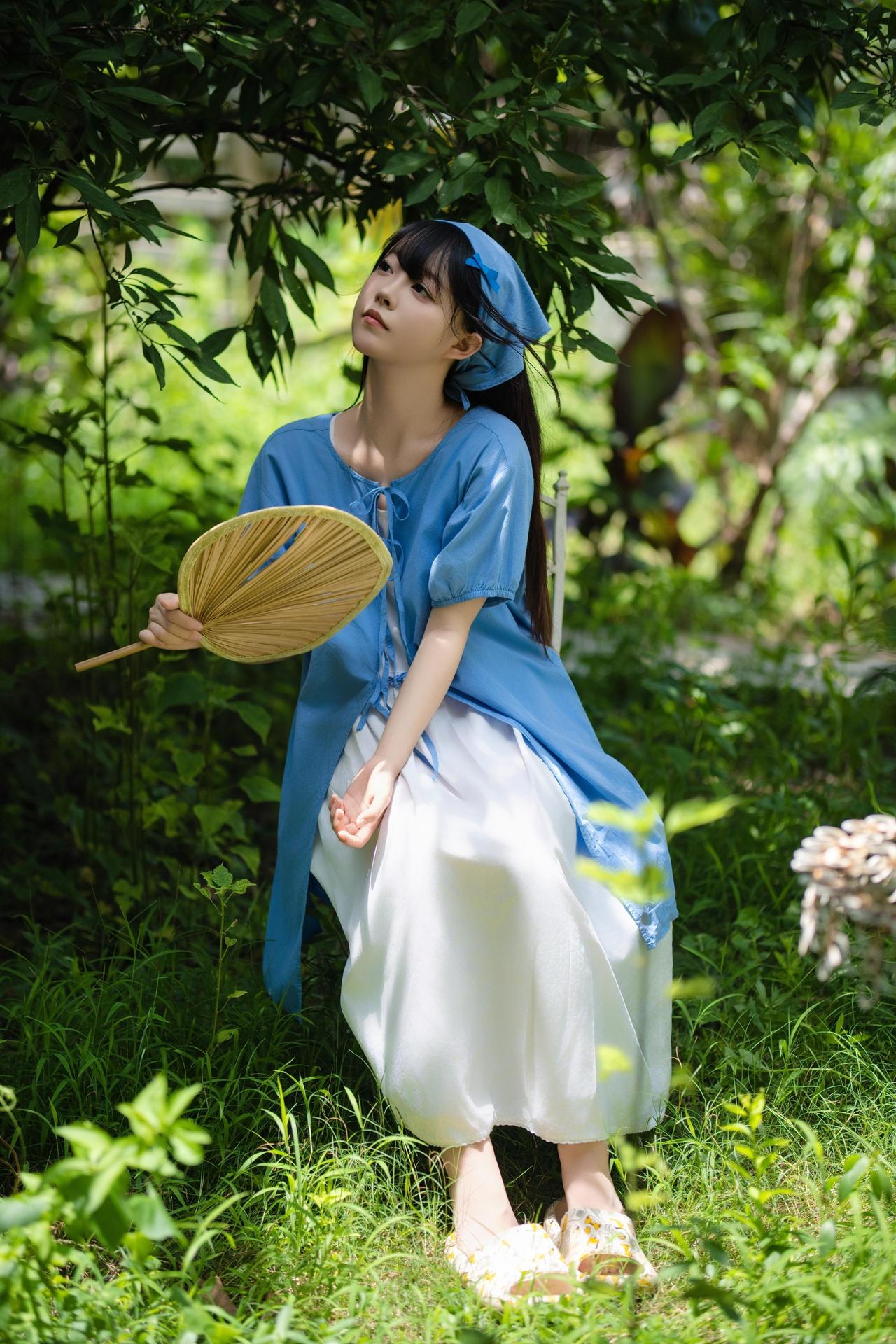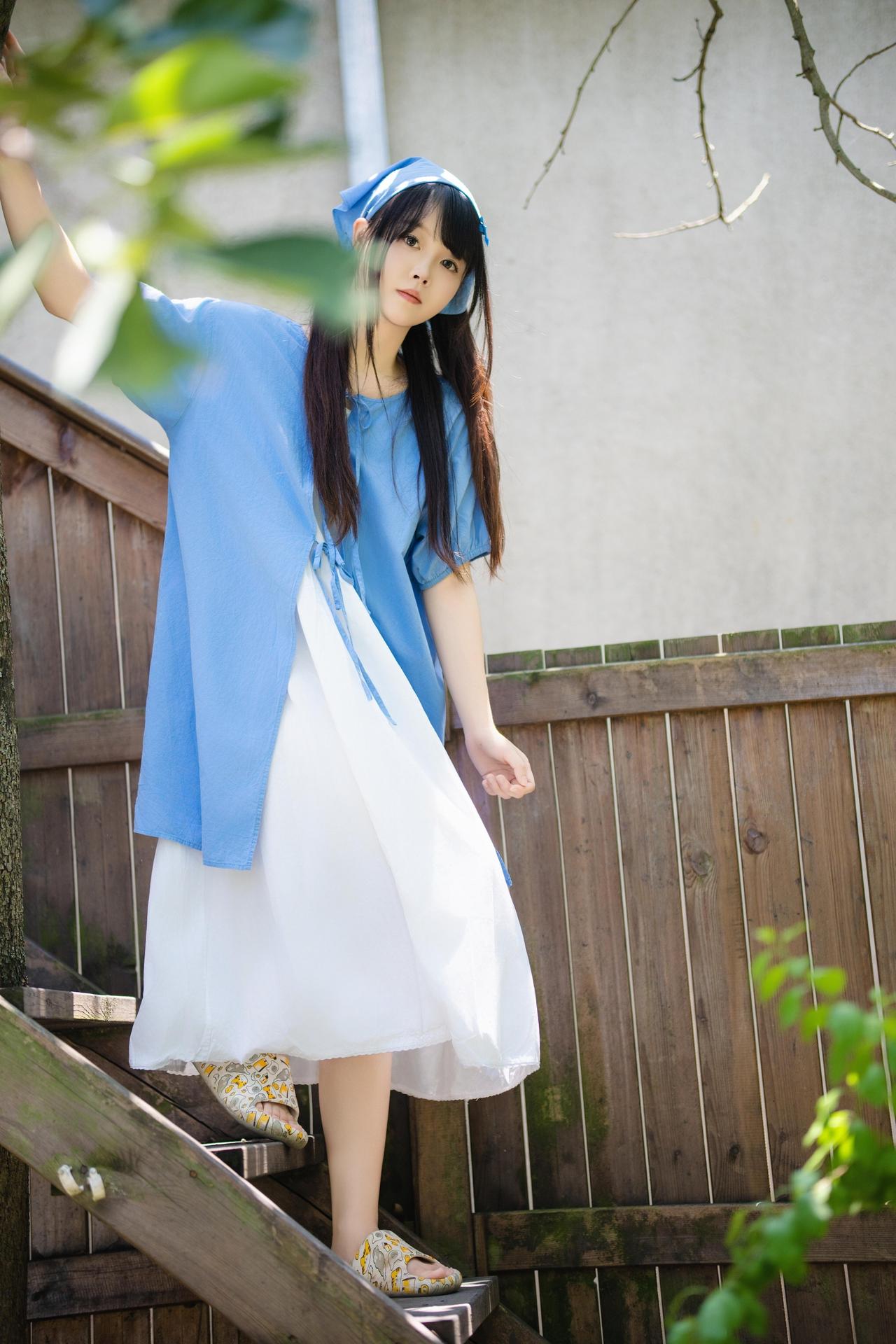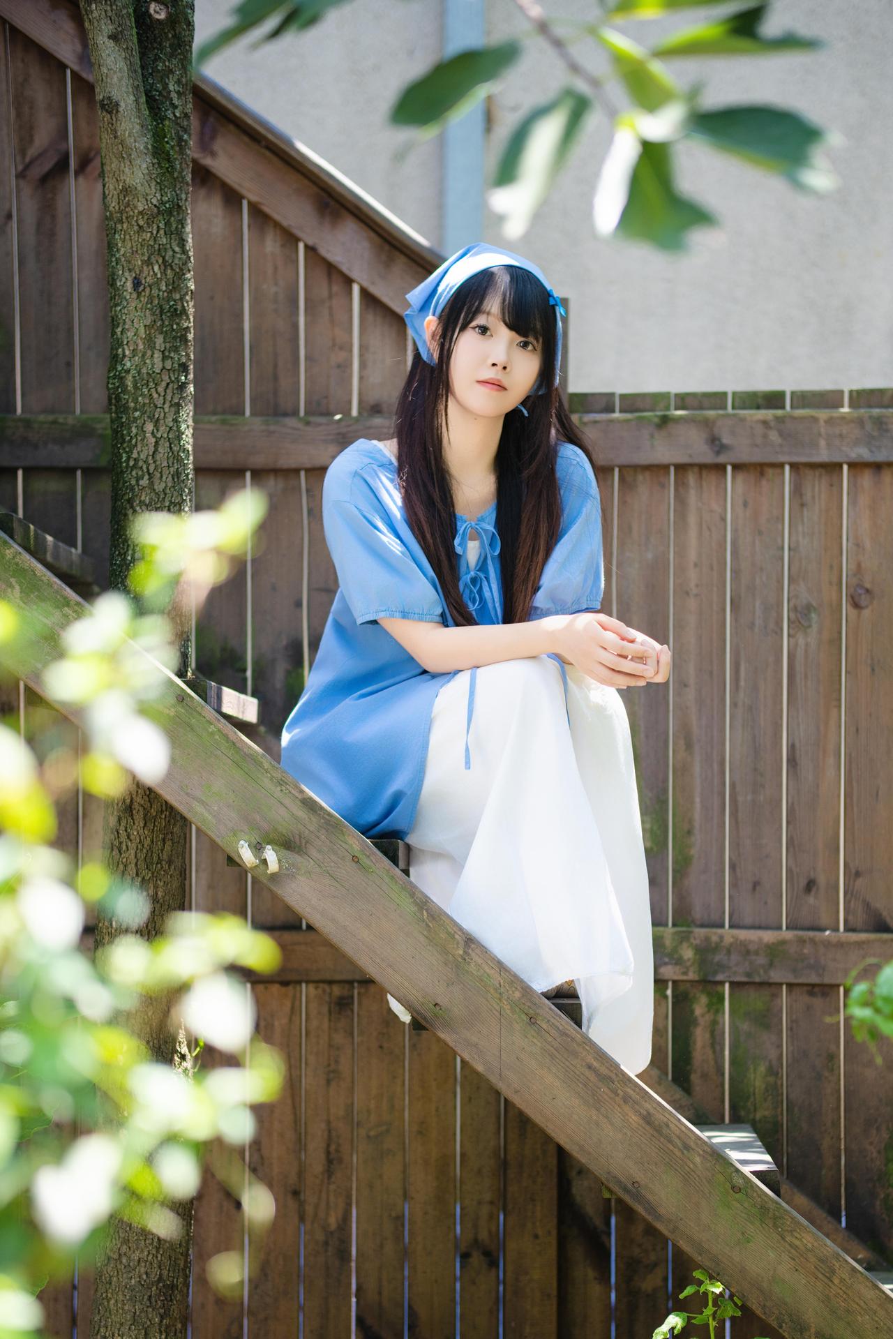 蓝白相间的清新少女,阳光下的温柔瞬间