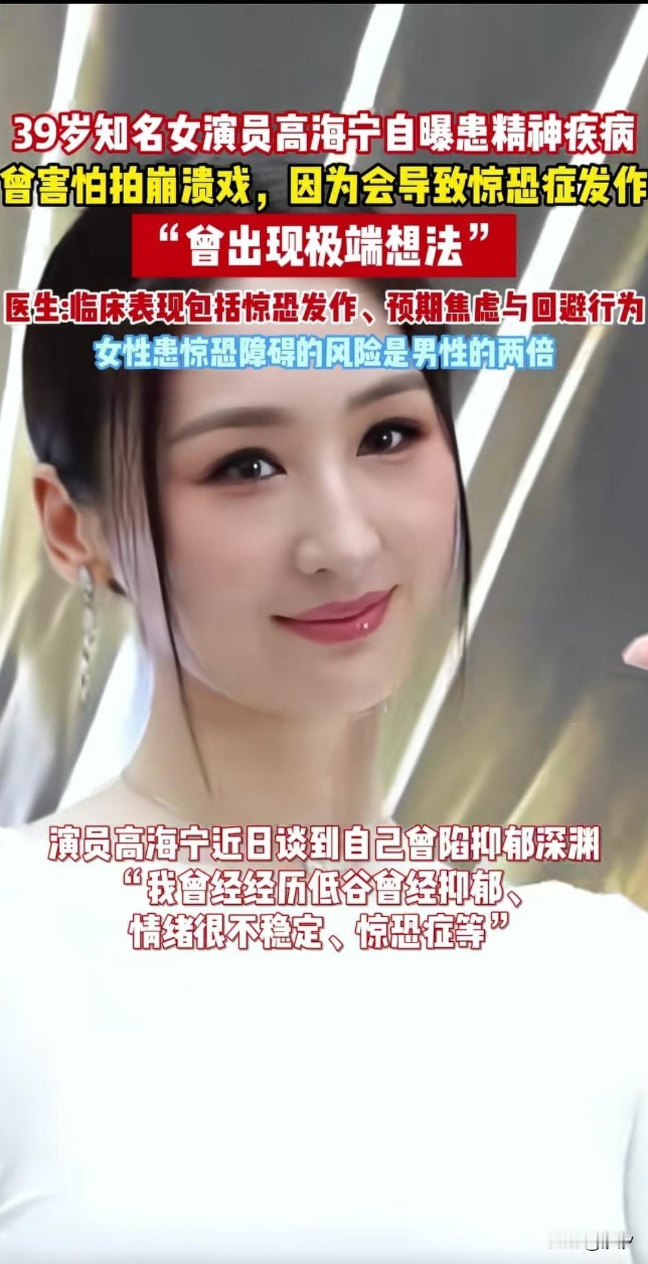 39岁的知名演员高海宁自曝患有精神疾病,她表示自己曾经陷入了抑郁的深渊,情绪非常