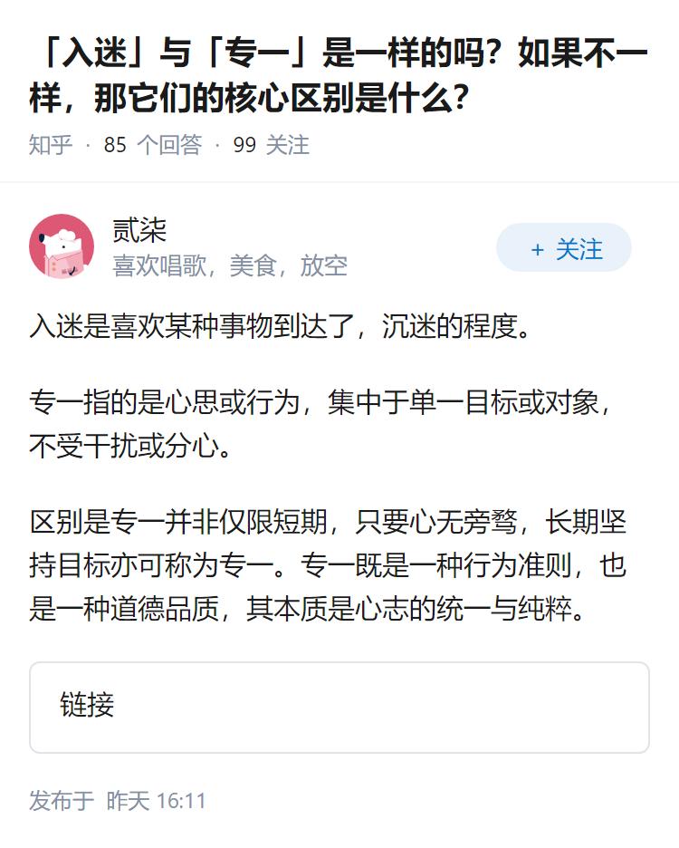 「入迷」与「专一」是一样的吗?如果不一样,那它们的核心区别是什么?