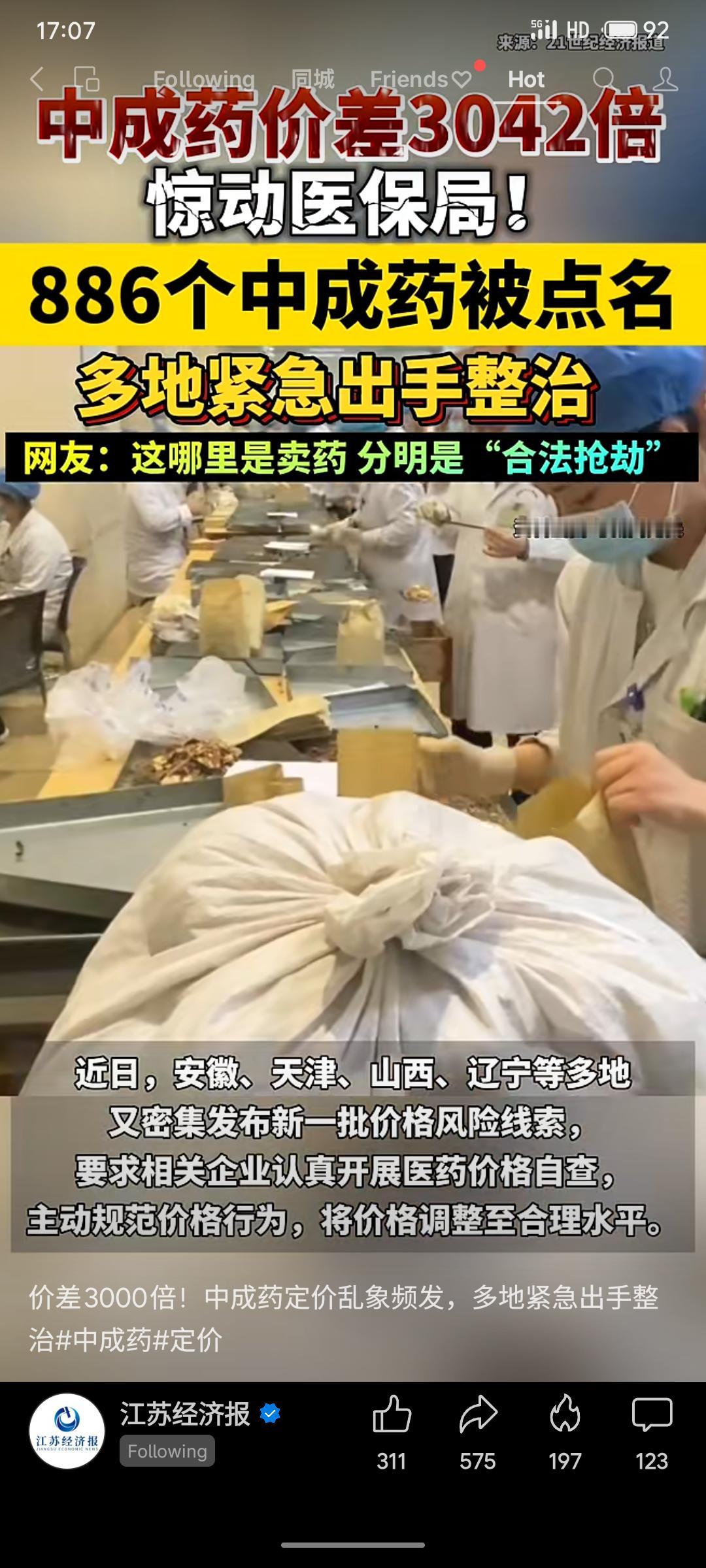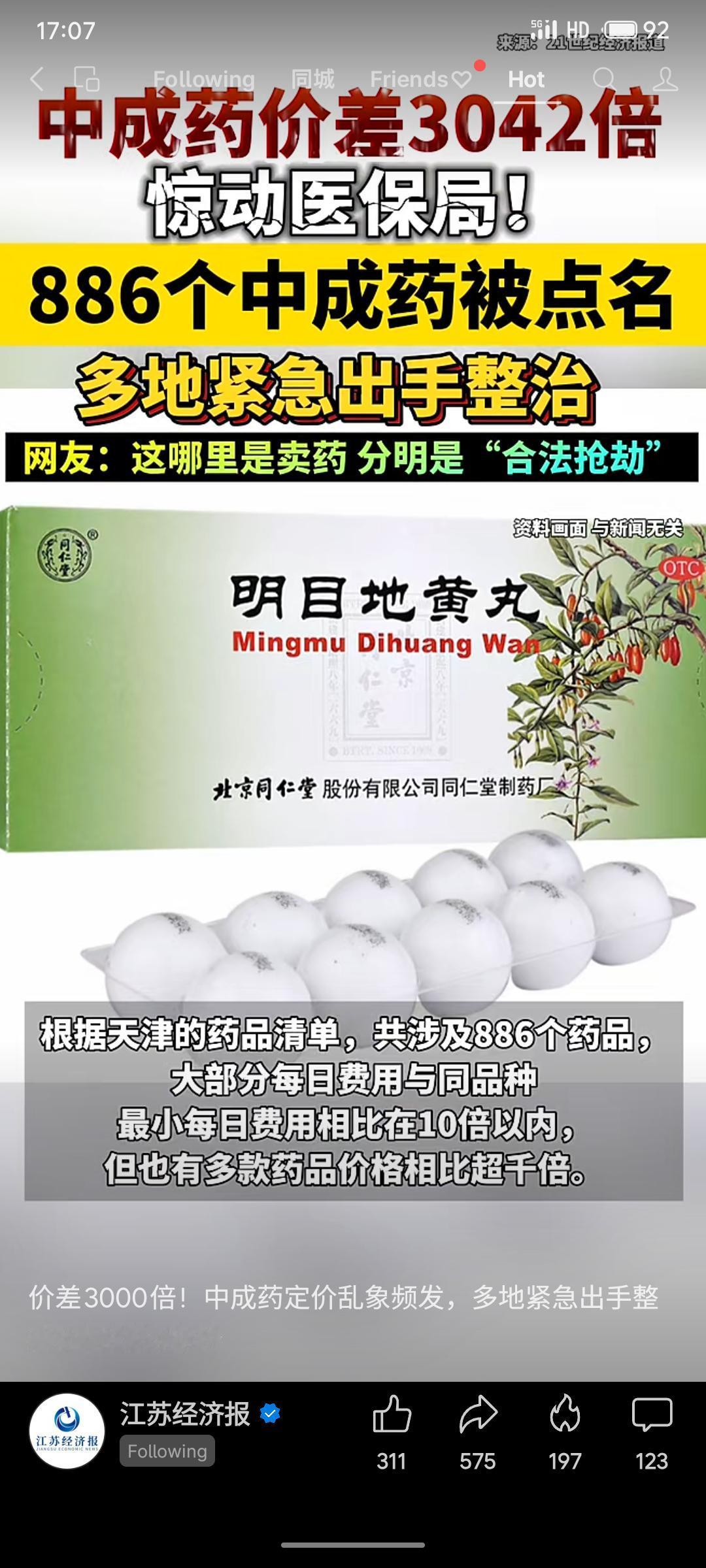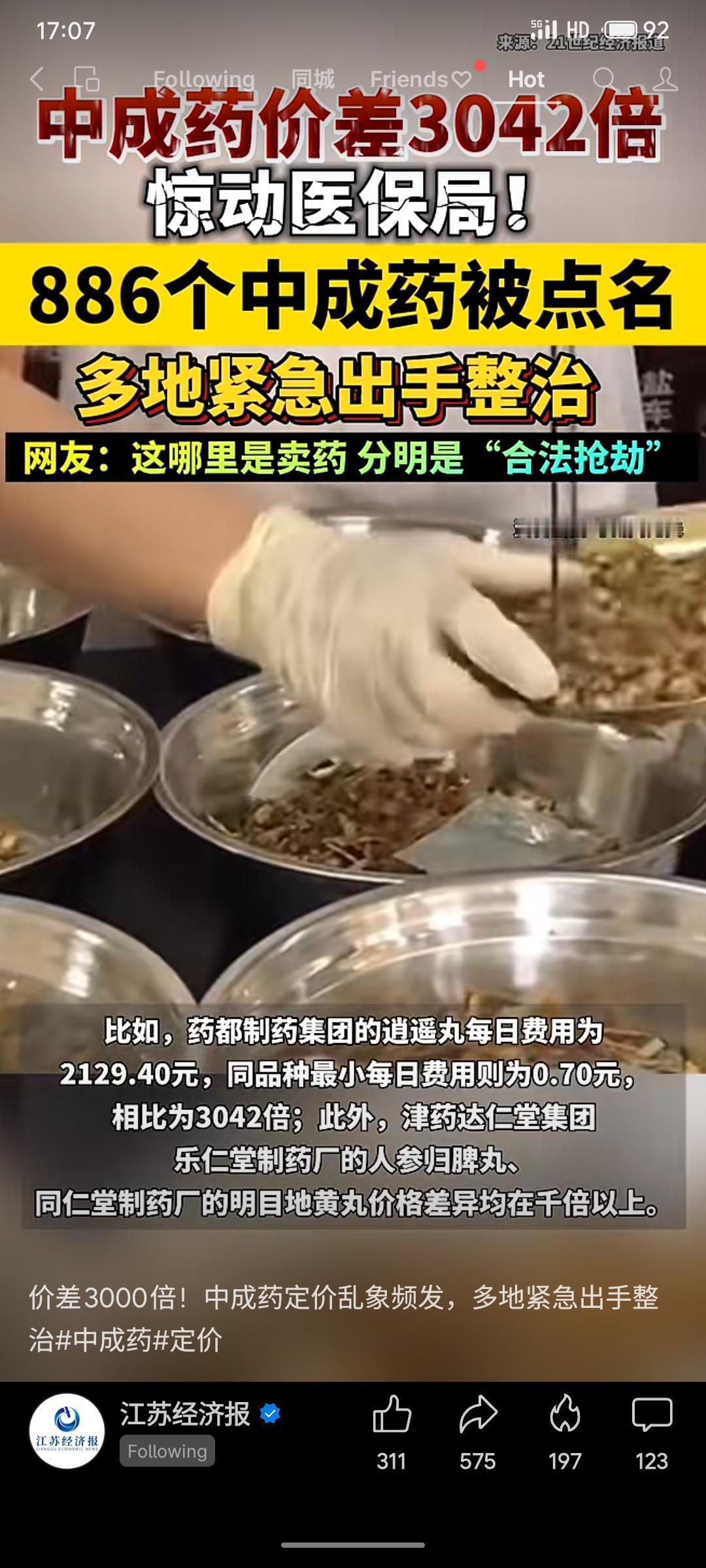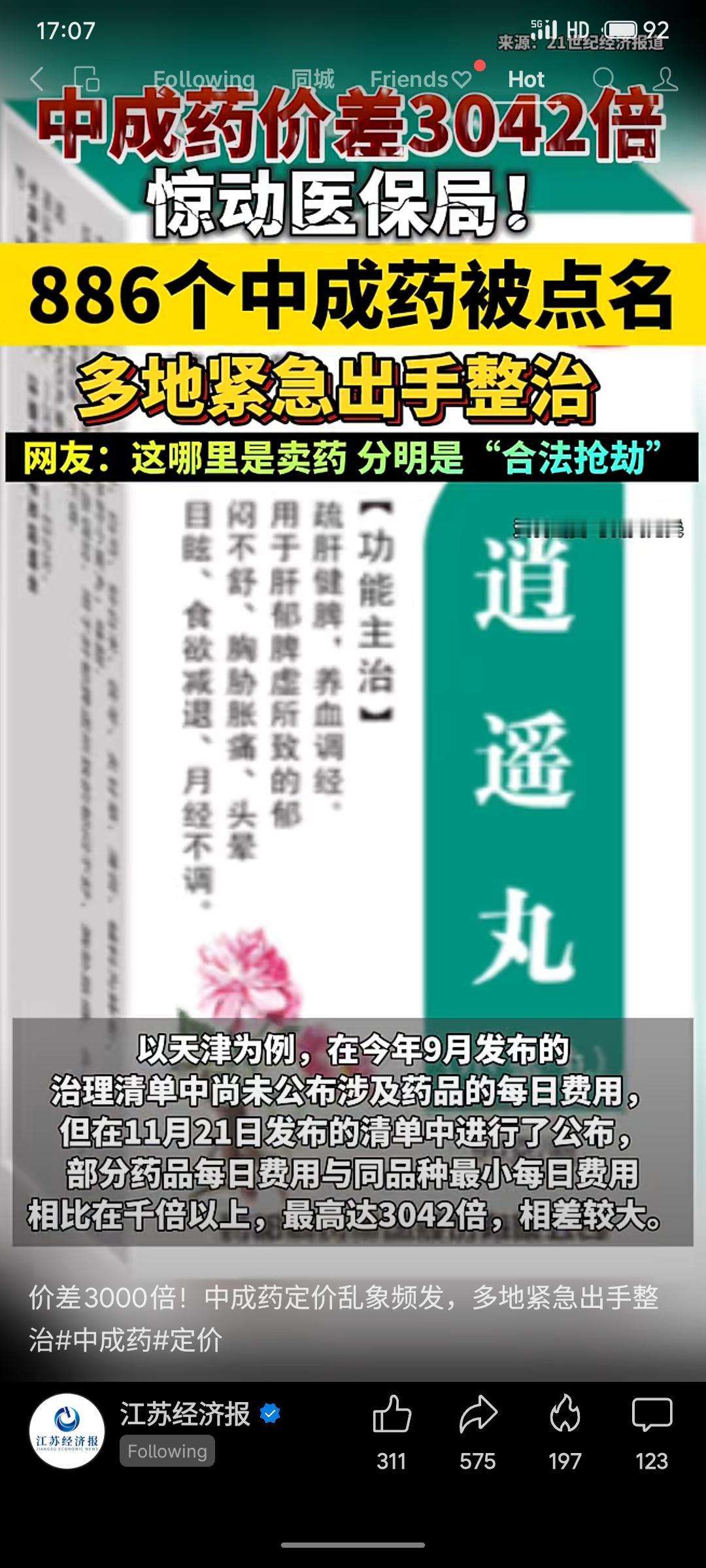 近期,多地医保局对中成药价格乱象出手整治。天津等省市在核查中发现,部分药品存在惊人价差,如某品牌逍遥丸每日费用高达2129.4元,而同品种最低仅0.7元,价差达3042倍。此次共点名886个中成药,官方已要求相关企业开展自查并将价格调整至合理水平。