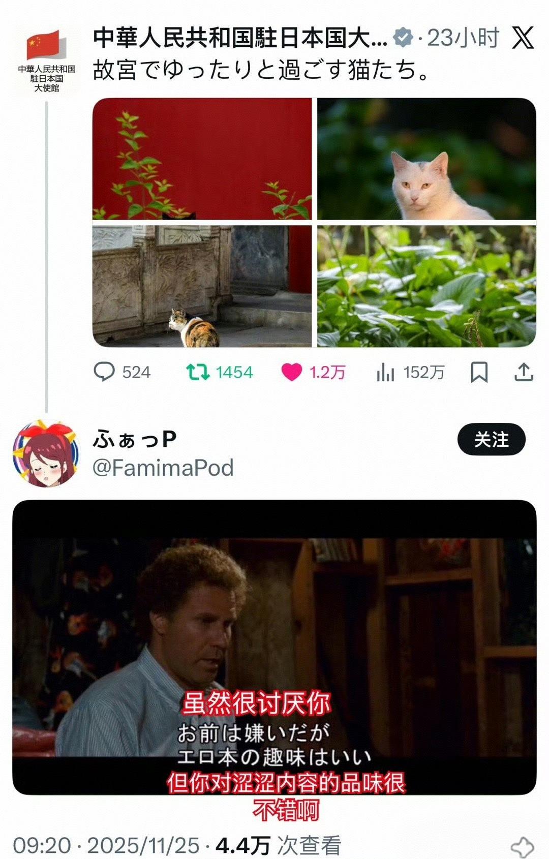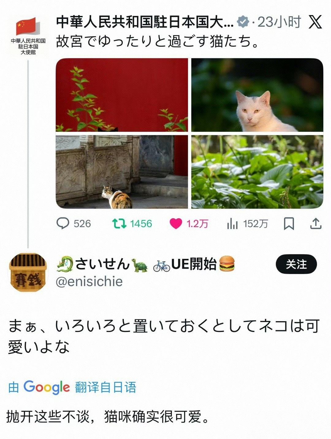中国驻日大使馆中场小憩一下,发了故宫猫咪格格和如意点在照片。估计日本网友这几天也想休整一下,超级喜欢格格和如意。相信如果他们看到帕帕的照片(图五),可能更喜欢。他们说想去故宫看猫咪,我们让不让他们去看呢?