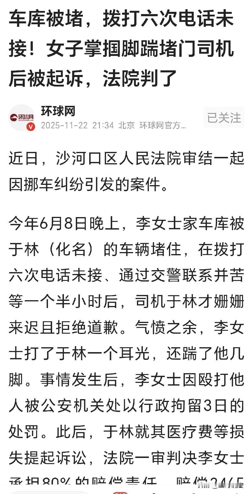 辽宁大连,一女子晚上开车回家,发现一辆车堵在自己家车库门前,她一连打了6次电话,对方不接,女子报警,希望警方联系车主挪开,女子等了一个半小时,车主慢悠悠才来,还拒不道歉,女子急了,伸手就是一个耳光,又踹了他几脚,车主报警,女子被拘留3天,之后,车主告到法院,要求女子赔偿他医疗费,法院的判决令人意外! 6月8号晚上,李女士忙了一天,她收拾东西,立刻开车往家里驶去。 一路上夜幕降临,外面的街灯已经亮了,路上的行人急匆匆的赶路,都是工作了一天忙着回去。 她一路飞驰,很快就来到了自己家的门口,她一踩油门,缓缓开往自己家的车库。 本以为把车一停,就能立刻回到家里,她疲惫不堪,早就想洗漱完赶快休息。 谁知到了车库旁边,她赫然发现一辆车挡在自己家车库门口,这辆车她从未见过,不知道为啥刚好挡在这里。 李女士当时就有点上火,是谁这么没有规矩,外面那么大的地方,停哪不是停,为啥非要堵住别人家的车库? 她围着车子转了两圈,终于在车上找到了电话号码,李女士心想,还算有点良心,她拿出手机就拨打了过去。 可电话里显示,对方无人接听,李女士又打了一遍,结果还是一样打不通电话。 这时候她已经急了,自己又渴又饿,直到现在,早就累的满身疲惫,她耐着心情,又连续打了4次电话。 可是对方,依旧无人接听,每次都是那种机器的回应,你拨打的电话暂时无人接听! 李女士彻底急了,总不能就这么被堵住不能进去,这样一来,后面万一有别的车辆,也会被跟着堵在外面。 李女士忍无可忍,立刻拨打了交警的电话,希望警方能够联系对方挪车。 随后,李女士满怀希望,我的电话你不接,警方的电话你总该接听吧! 谁知她左等右等,等的心情败坏,等的眼皮打架,她时而坐在车里休息,时而又在车下转转。 她也不敢走的太远,怕万一车主来了找不见她人,她在心里憋了好多的话,就等车主来了要说一说他。 谁知这一等就是一个半小时,等的李女士万念都要灰了,她在心里暗自念叨,这车主也太过分,明知道堵住别人家的车库,还就这样不管不顾! 这个时候,李女士看到,不远处一个人慢慢悠悠的往这边走来,这正是车主于林,他满不在乎,晃晃悠悠没一点着急的样子。 李女士等他来到了车跟前,气的几乎说不出话来,她看对方还是不紧不慢的样子,忍不住直接走到他的面前。 李女士以为,自己等了这么久的时间,好歹对方会说句道歉的话,结果于林看都没看她一眼,直接掏出钥匙就要开车门。 李女士心里气愤,忍不住上前要他道歉,谁知于林拒不道歉,他觉得这就是件小事,没有必要向李女士道歉。 李女士顿时忍不了了,积攒的怒气一下冲到了头上,她上去就是一个巴掌,直接删到了于林脸上。 她还不解恨,我要你挡住我的车库!我要你不接电话!我要你姗姗来迟!我要你拒不道歉! 李女士上去就踹了于林几脚,于林愣住,你敢动手打我?今天和你没完! 于林拨打报警电话,警方赶来,对李女士进行了拘留3日的行 政处罚。 李女士后悔莫及,因为自己的冲动了,闯出了祸事,可事已至此,也只能默默接受。 本以为这件事就这么结束,没想到不久之后,她收到法院的传票,于林把她告上了法庭,要求她赔偿医疗费、误工费、营养费等各种费用。 李女士欲哭无泪,明明她才是受害者,却因为一时冲动不但被行政拘留,还被起诉索赔。 有人认为,动手打人的确是欠妥,但六次电话不接,警方出面联系才姗姗来迟,还拒绝道歉,给别人造成实质伤害,人家打他情有可原,这样的人才应该受到处罚! 也有人说,堵门你可以报警,或者找相关部门处理,但不能以此成为打人的理由,因堵门造成的损失,可以起诉堵门者,但动手打人就是李女士的不对。 《民法典》第1165条第1款规定: 行为人因过错侵害他人权益造成损害的,应当承担侵权责任。 于林乱停车虽有过错,但李女士因情绪失控打耳光、踹人,主观上存在故意伤害的过错,客观上造成于林人身损害。 即便于林有错在先,也不能成为李女士打人的免责理由,其需承担医疗费、误工费等赔偿责任。 《民法典》第236条规定: 妨害物权或者可能妨害物权的,权利人可以请求排除妨害或者消除危险。 李女士对自家车库享有合法物权,于林未经允许将车堵在车库门口,属于妨害他人物权行使的行为,已构成侵权。 李女士有权要求于林挪车、排除妨害,若因堵车产生误工、交通费等损失,可依法向于林主张赔偿,但该权利需通过合法途径行使,而非动手打人。 《民法典》第1173条规定: 被侵权人对同一损害的发生或者扩大有过错的,可以减轻侵权人的责任。 于林乱停车、六次拒接电话、姗姗来迟且拒不道歉,是引发冲突的重要原因,存在明显过错。 但李女士动手打人是造成人身损害的主要原因,过错程度更重。 因此,法院判决李女士承担80%赔偿责任,赔偿于林3465元。 关注 @王哥说法 多学法律少吃亏!
