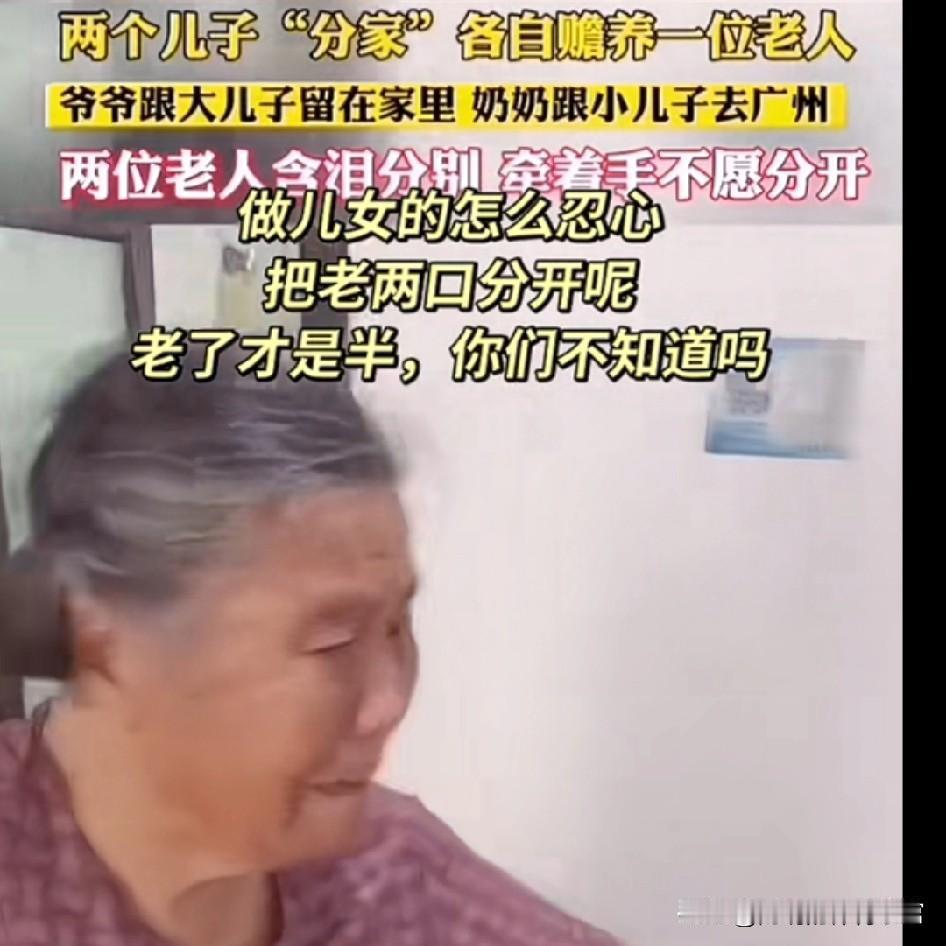 今天刷到两个儿子分家,各自赡养一位老人,爷爷跟大儿子在家,奶奶跟着二儿子去广州 两位老人含泪分别,牵着手不愿分开 做儿女的怎么忍心把老两口分开呢?老伴,老伴老了才是伴 网友说,阎王都没做到的事,两个儿子做到了!两儿子两套房 兄弟分家的恩怨 三个儿子养老 兄弟两分家 分家矛盾 两代人同住 两代人养老观念