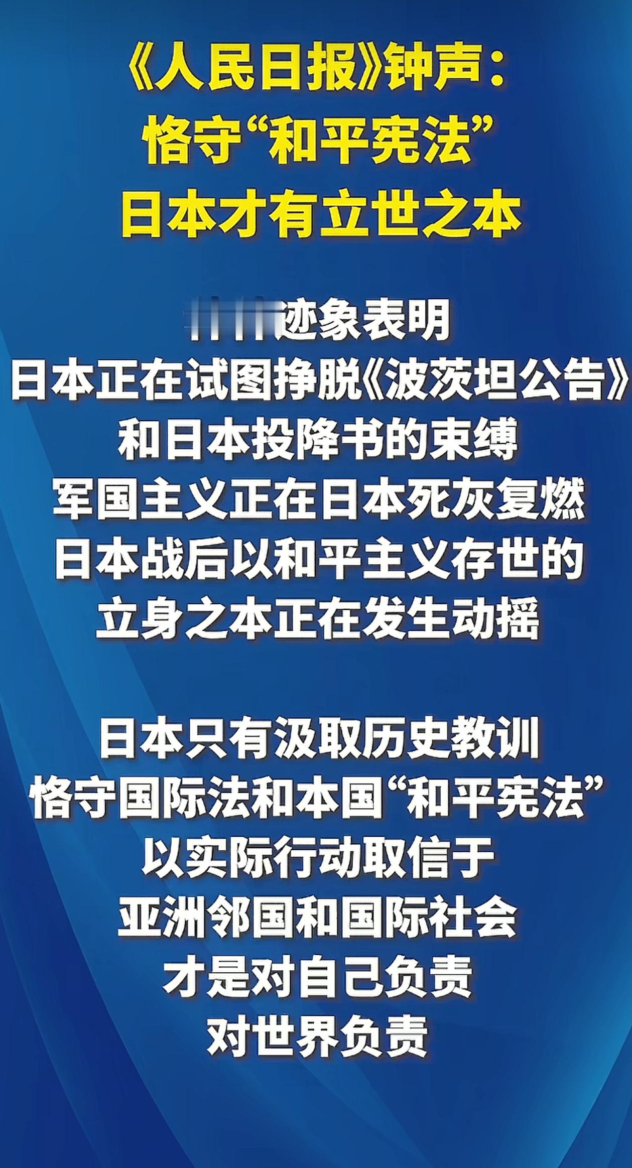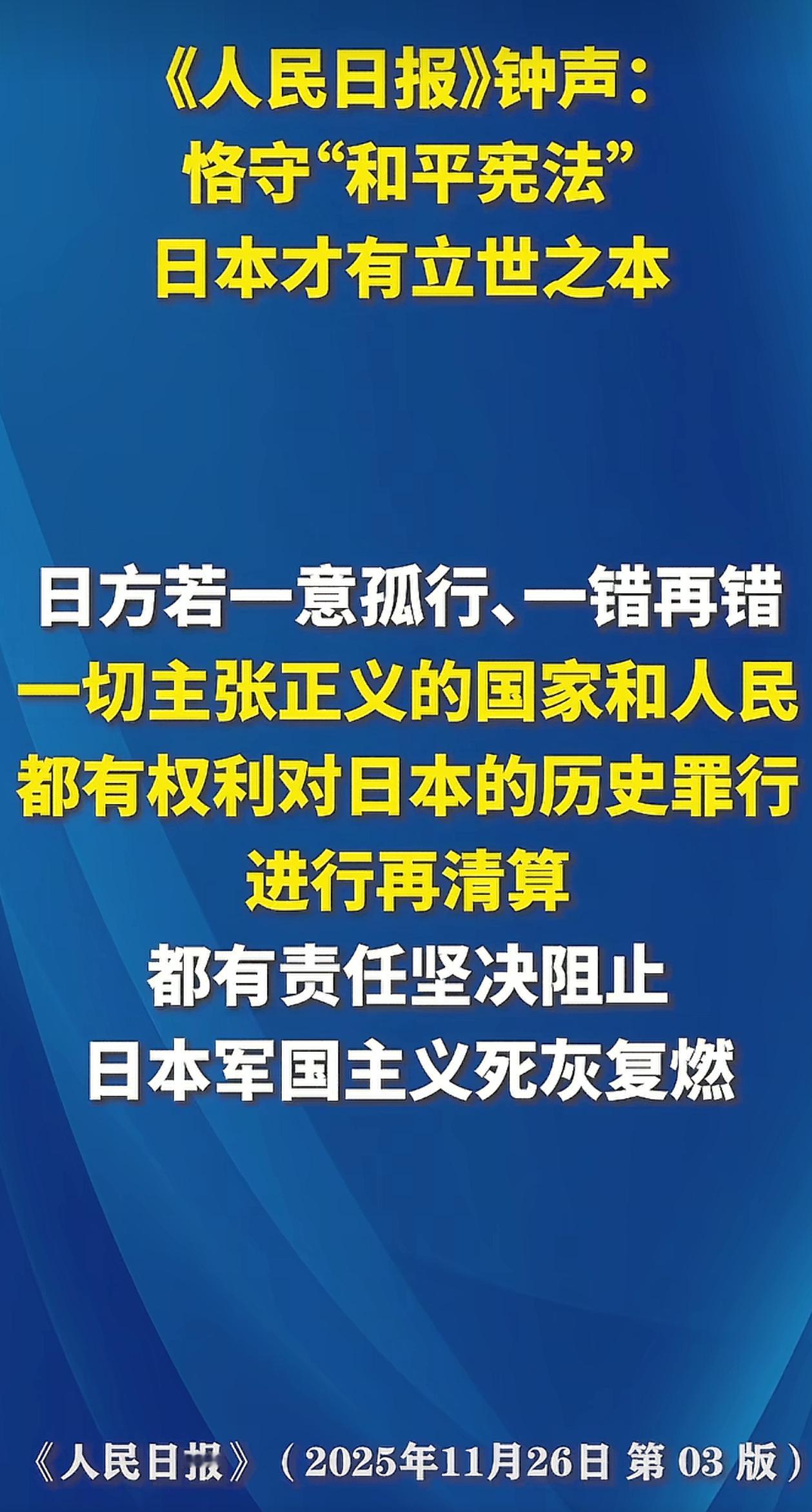 人民日报钟声:日方若一意孤行、一错再错,一切主张正义的国家和人民,都有权利对日本的历史罪行进行再清算。都有责任坚决阻止日本军国主义死灰复燃。热点观点高市早苗现在尴尬了