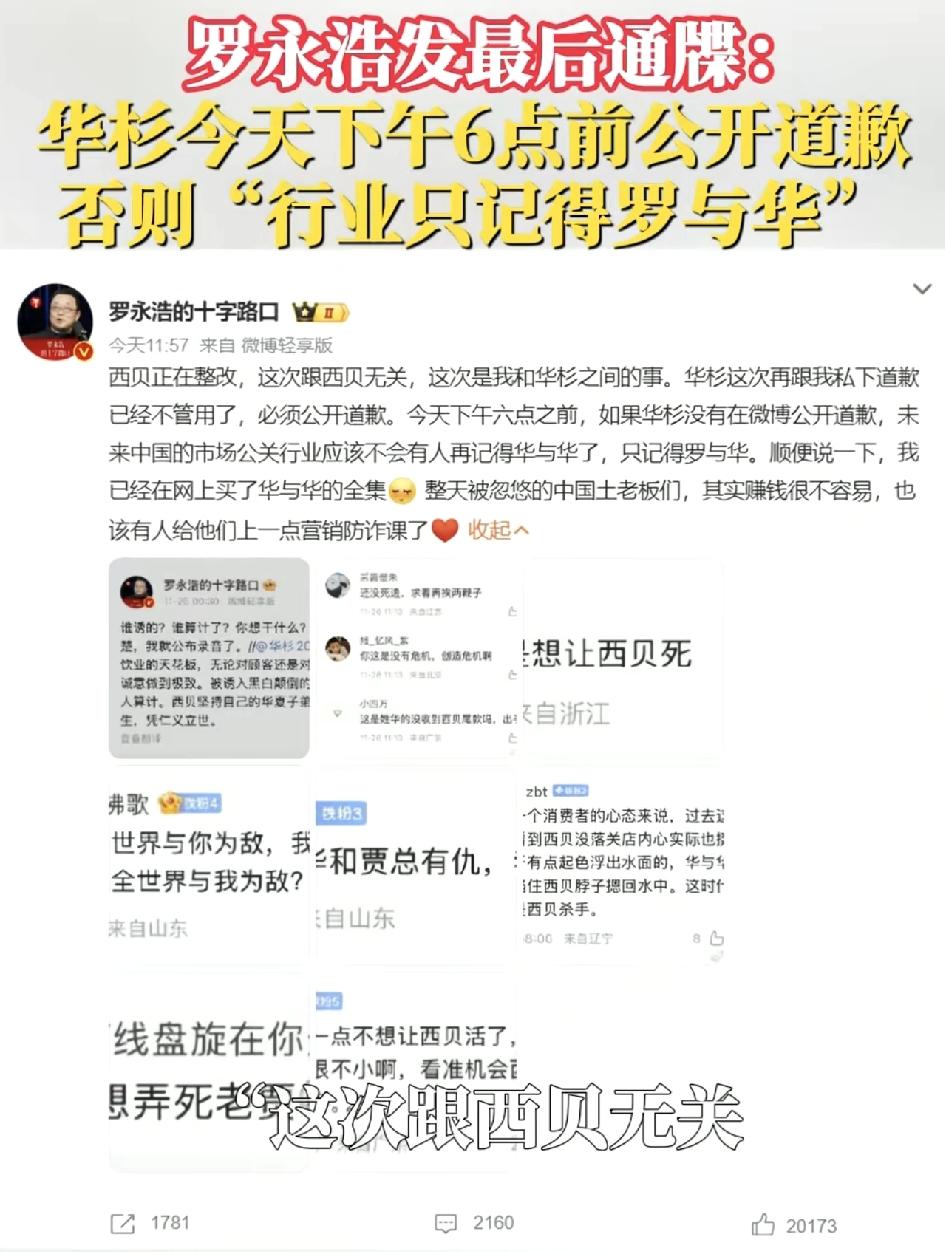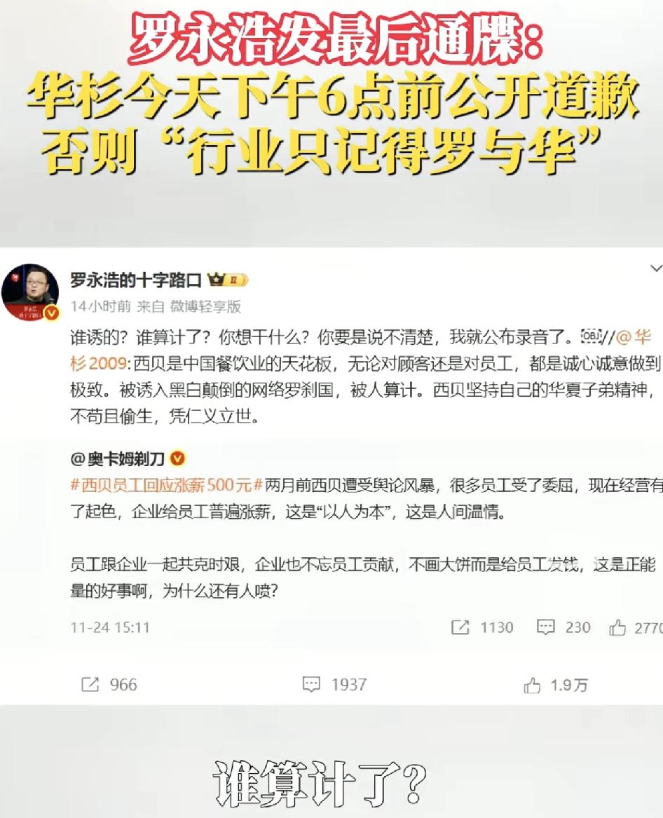 咱就说,惹谁不好,你偏偏惹罗永浩? 华杉这次算是撞到枪口上了! 华杉作为华与华的创始人,前几天发了条微博,大意是西贝是被人算计了,本来商业纠纷各有说辞,但这话落到罗永浩眼里,那是赤裸裸的挑衅! 老罗直接发文开问谁诱的?你想干什么?说不清我就公布录音!见华杉没动静,老罗直接放大招,私下道歉没用!今天下午6点前必须公开道歉,否则未来公关行业只记得罗与华,没人记得华与华,咱就是说,这行业除名也太狠了点~ 网友乐了:这波是“罗怼怼”的常规操作 有人调侃:“华杉怕是忘了老罗的道歉收集者身份吧?” 还有人吃瓜:“就喜欢看老罗这种要么不怼,怼就怼到你服的劲儿!” 甚至有人开始押注:“赌五毛,华杉下午六点前绝对得道歉!” 截至现在,华杉还没回应呢,咱就蹲个后续,看看是华杉认怂道歉,还是老罗真的甩出录音王炸。 你觉得这场商业互怼谁能赢?评论区说说你的押注!