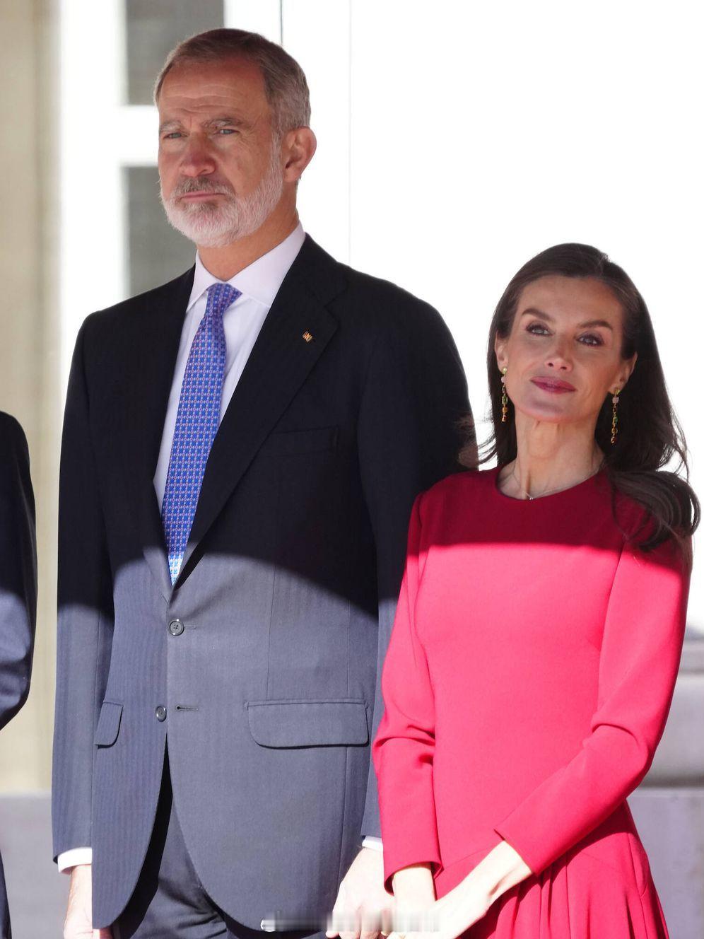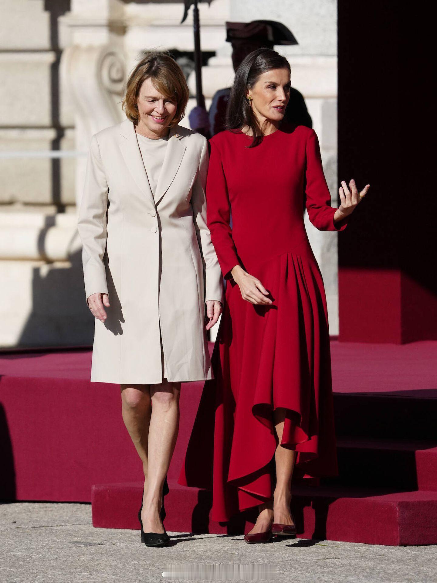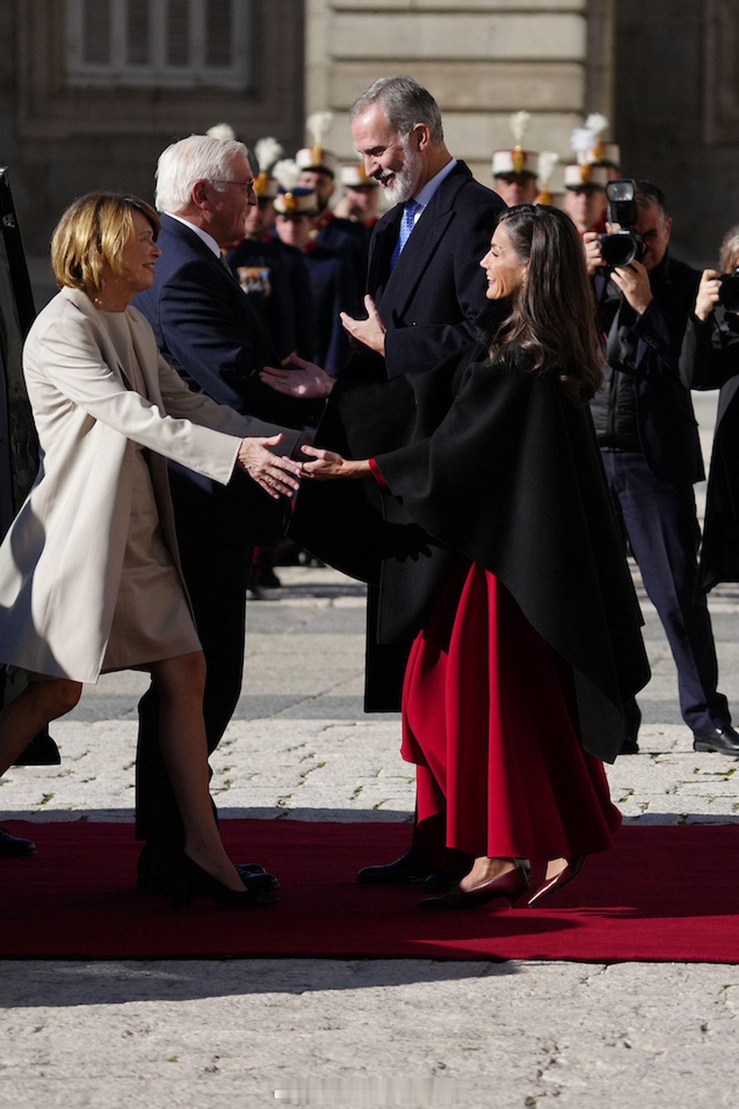 11月26日,西班牙国王和王后在马德里皇宫主持仪式,接待来访的德国boss夫妇。稍后在zarzuela有私人会晤和午餐会,晚上会在马德里皇宫举行欢迎晚宴。莱后红裙子来自The 2nd Skin CO.,黑色披肩Carolina Herrera,耳环是来成都的时候戴过的Dime Que Me Quieres,另外,她貌似还戴了条细细的项链~