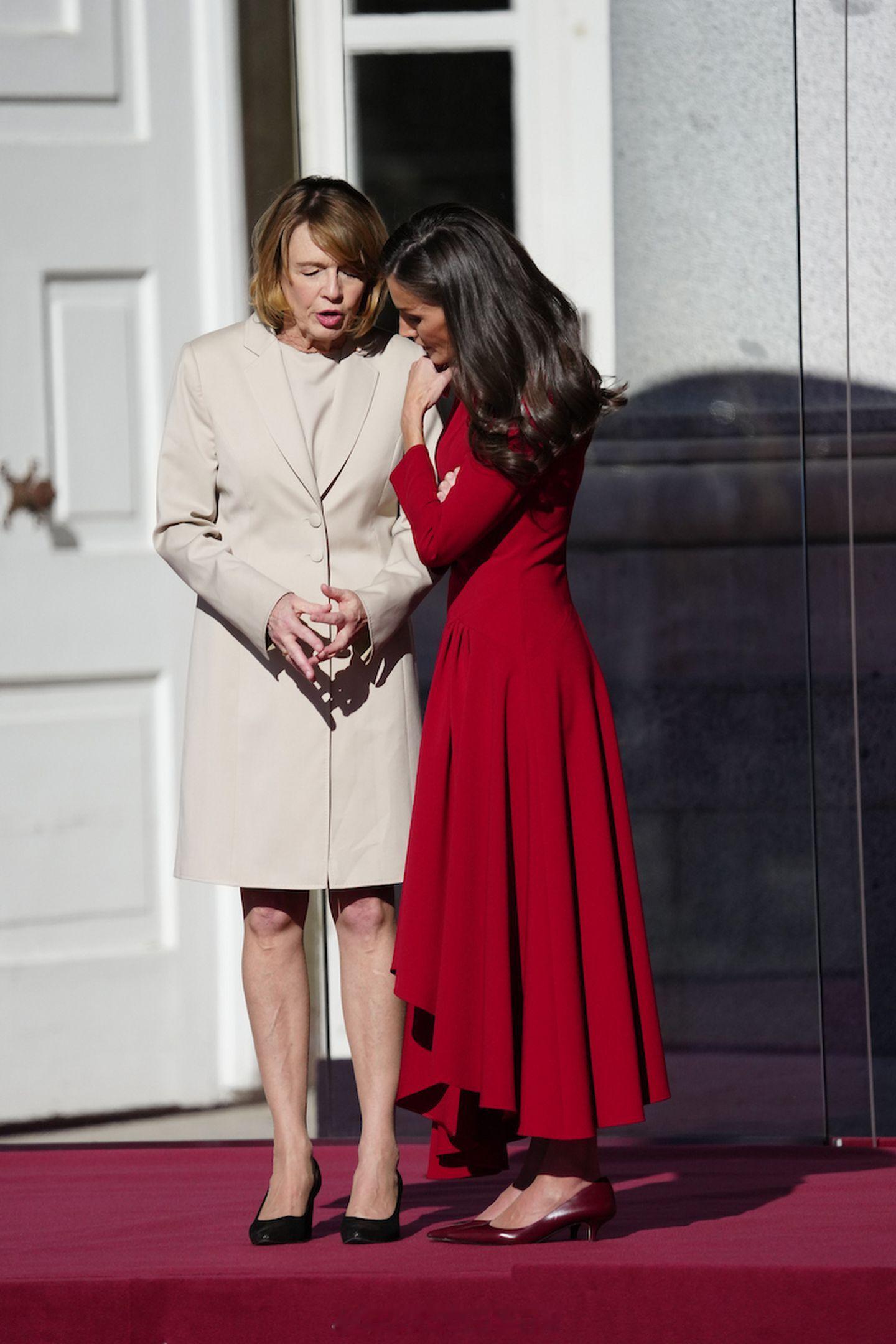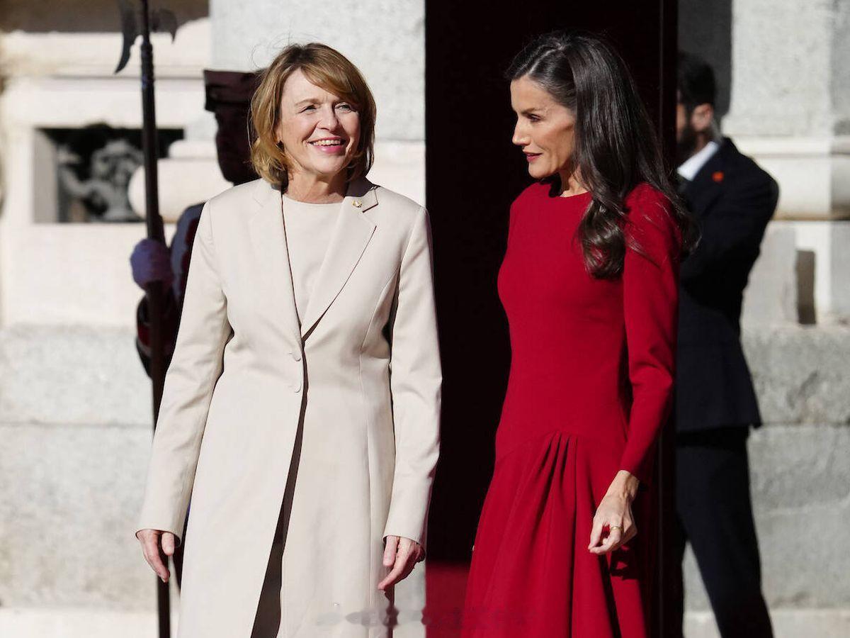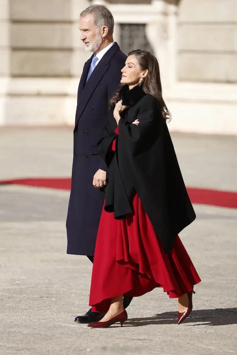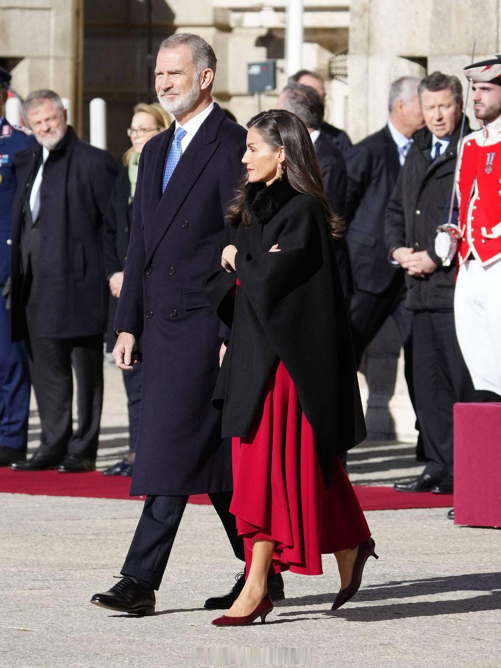 11月26日,西班牙国王和王后在马德里皇宫主持仪式,接待来访的德国boss夫妇。稍后在zarzuela有私人会晤和午餐会,晚上会在马德里皇宫举行欢迎晚宴。莱后红裙子来自The 2nd Skin CO.,黑色披肩Carolina Herrera,耳环是来成都的时候戴过的Dime Que Me Quieres,另外,她貌似还戴了条细细的项链~
