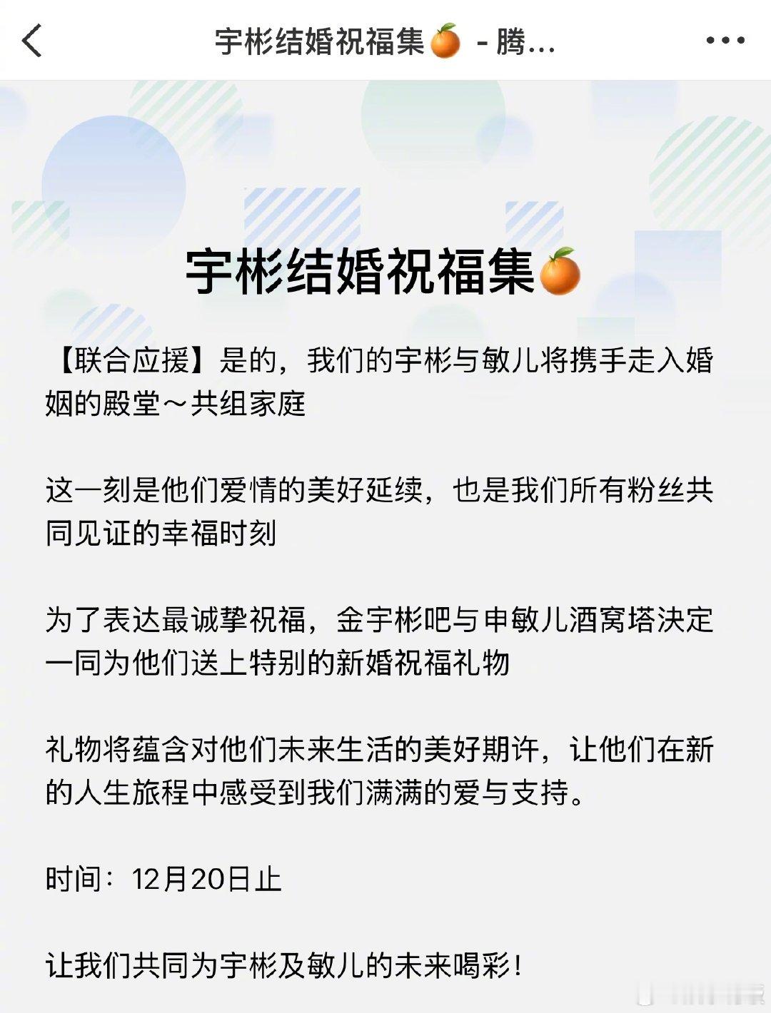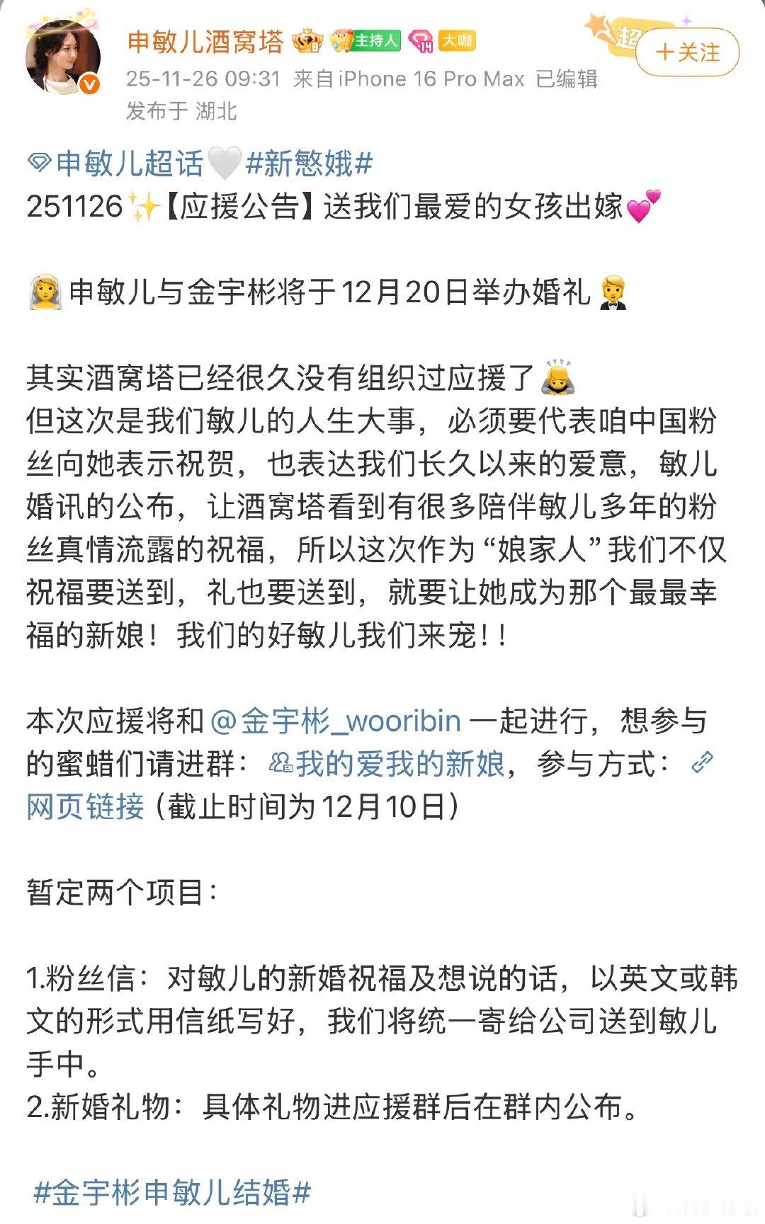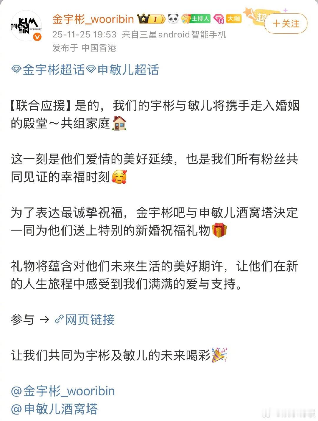 申敏儿金宇彬大吧联合应援 在申敏儿金宇彬公布婚讯之后,两位的粉丝发博宣布为了两位艺人结婚开启联合应援,将共同为申敏儿金宇彬送上新婚祝福!永远会被粉丝对自担的爱所感动祝幸福久久!