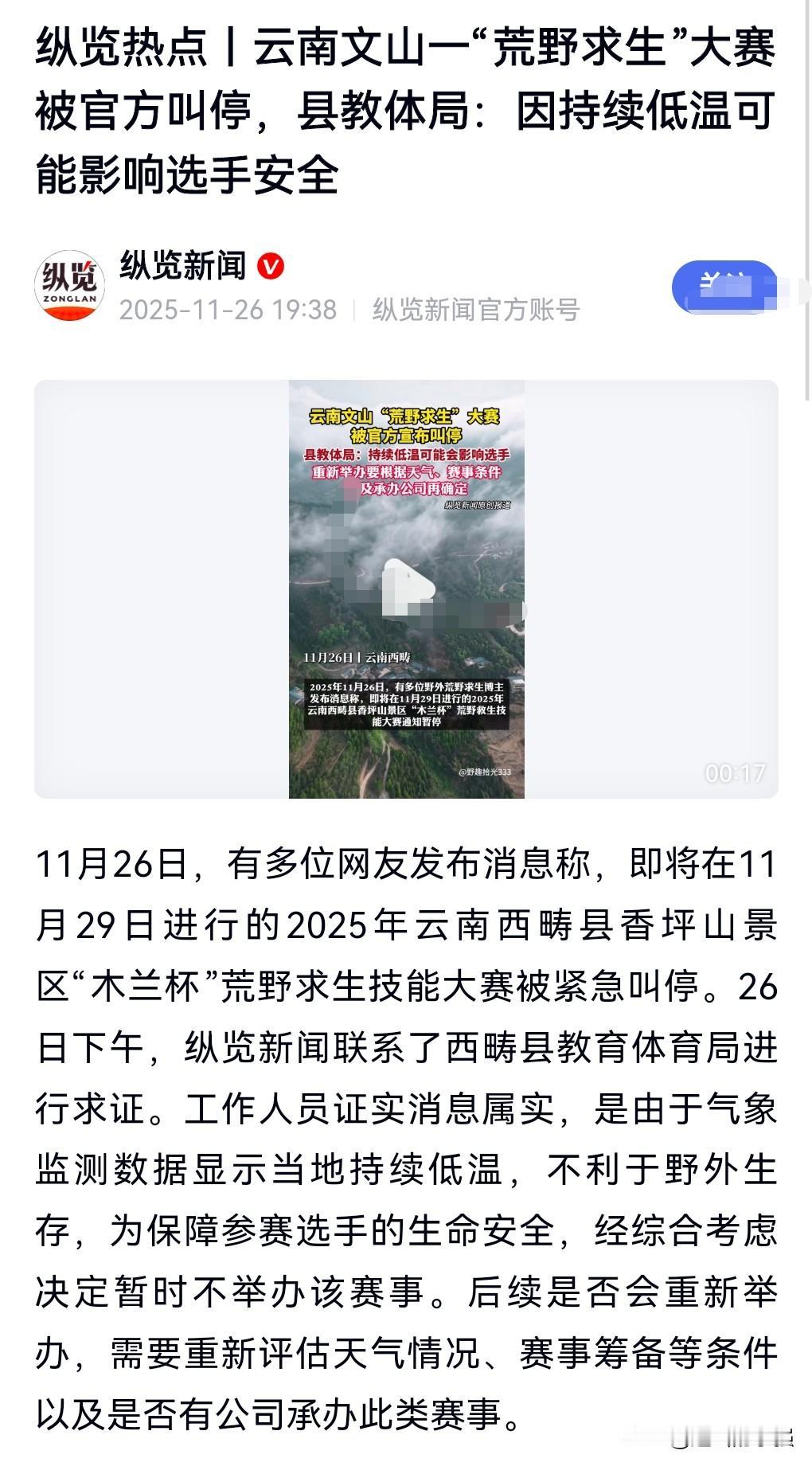 火了一个荒野求生,结果各个地方都开始搞这种求生比赛。 11月26日消息,云南一荒野求生大赛被官方叫停,原因是持续低温影响选手安全。 也确实很莫名其妙。为什么老是在冬天里搞荒野求生?这不是扯淡吗? 荒野求生为什么不在夏天搞?记得2026年在夏天搞。 在冬季里搞荒野求生,简直是拿选手的生命安全开玩笑。