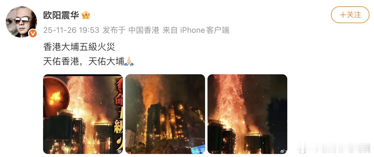 欧阳震华为香港祈福香港火灾,欧阳震华发博祈福。