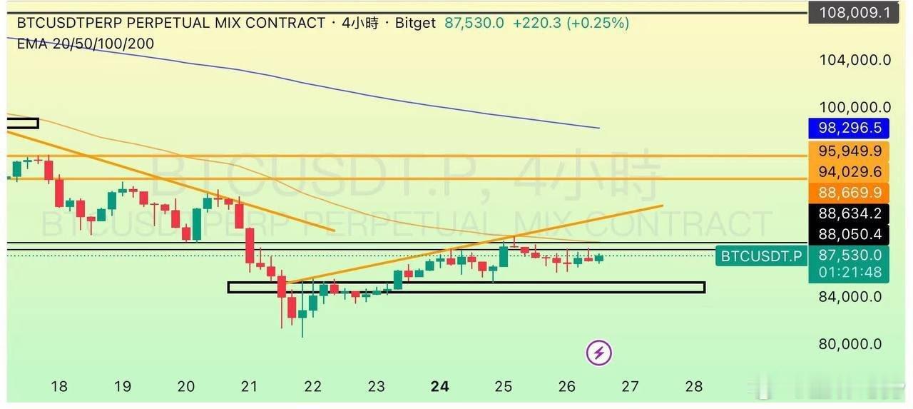 BTC 多次上探88000一線未能形成強勢有效突破,說明上方拋壓重較重,動能不足,當前短期整體呈震蕩偏弱勢,短期支撐放在前期的頂底轉換位85300-84500附近