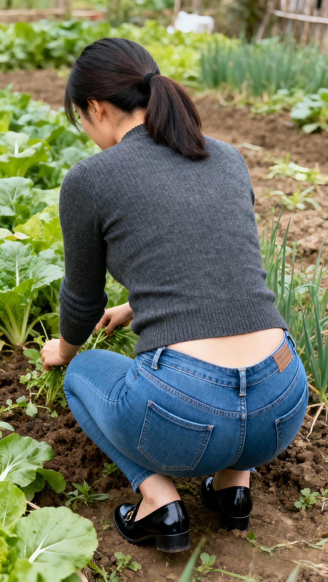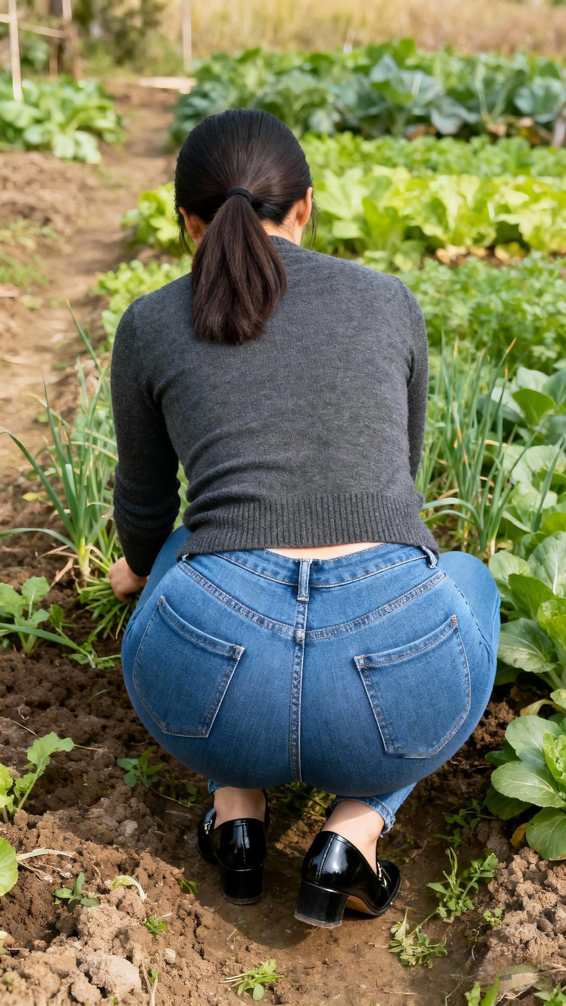 田埂间的泥土混着草木的清芬,深灰针织衫的轮廓伏在绿意里,指尖轻触着脆嫩的菜畦。蓝布牛仔裹着的身形半蹲在土地之上,像是与这片生机相融的一部分。指尖拨开葱郁的菜叶,动作轻缓,似在与自然低语。周遭是肆意生长的青菜与葱茏,泥土的温润漫在空气里,每一个细微的动作,都成了乡野间最温柔的注脚,把琐碎的日常,揉进了田园的清宁里。农村