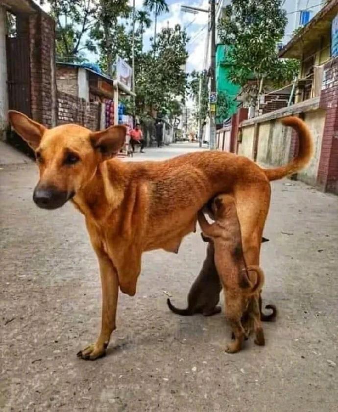 即使失去前腿,依然不妨碍它哺育幼犬。据当地居民描述,该流浪母犬被车轧断腿后,还是会每天到处寻找食物