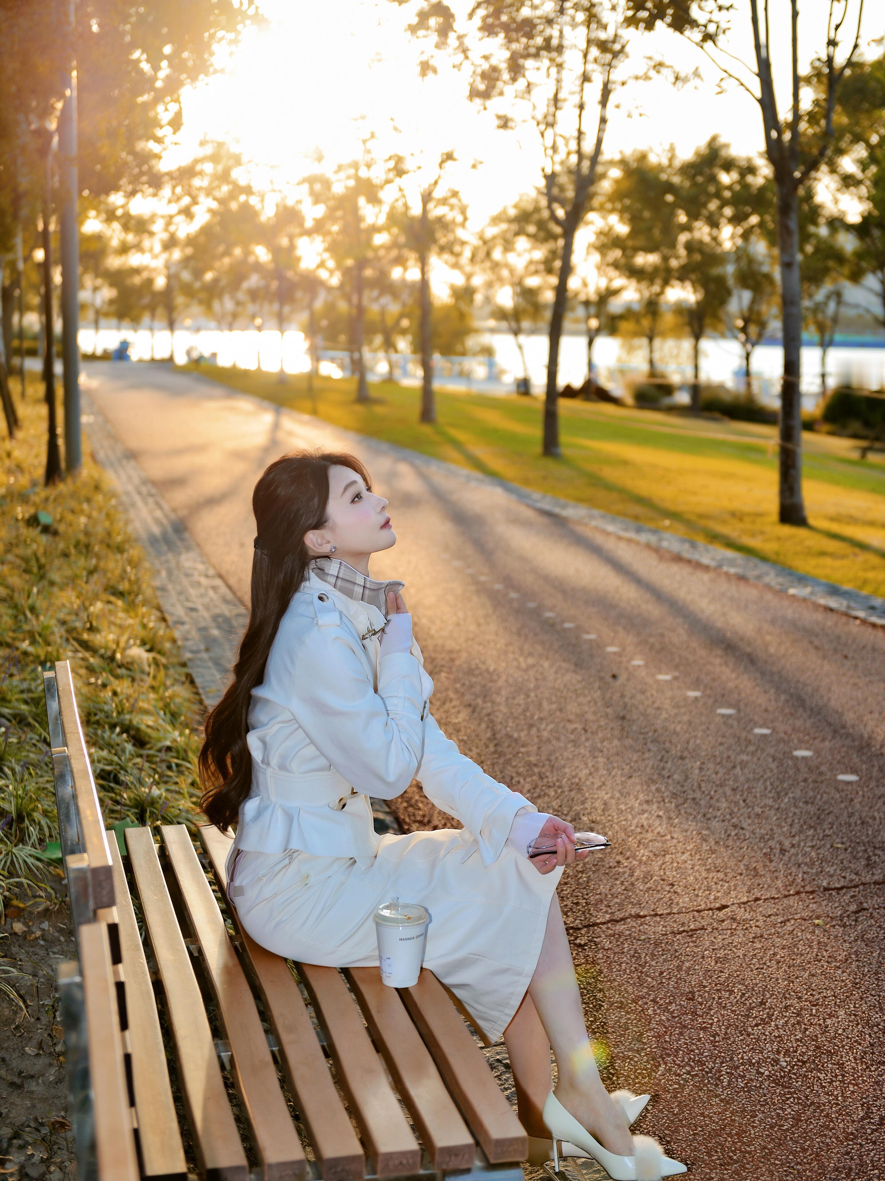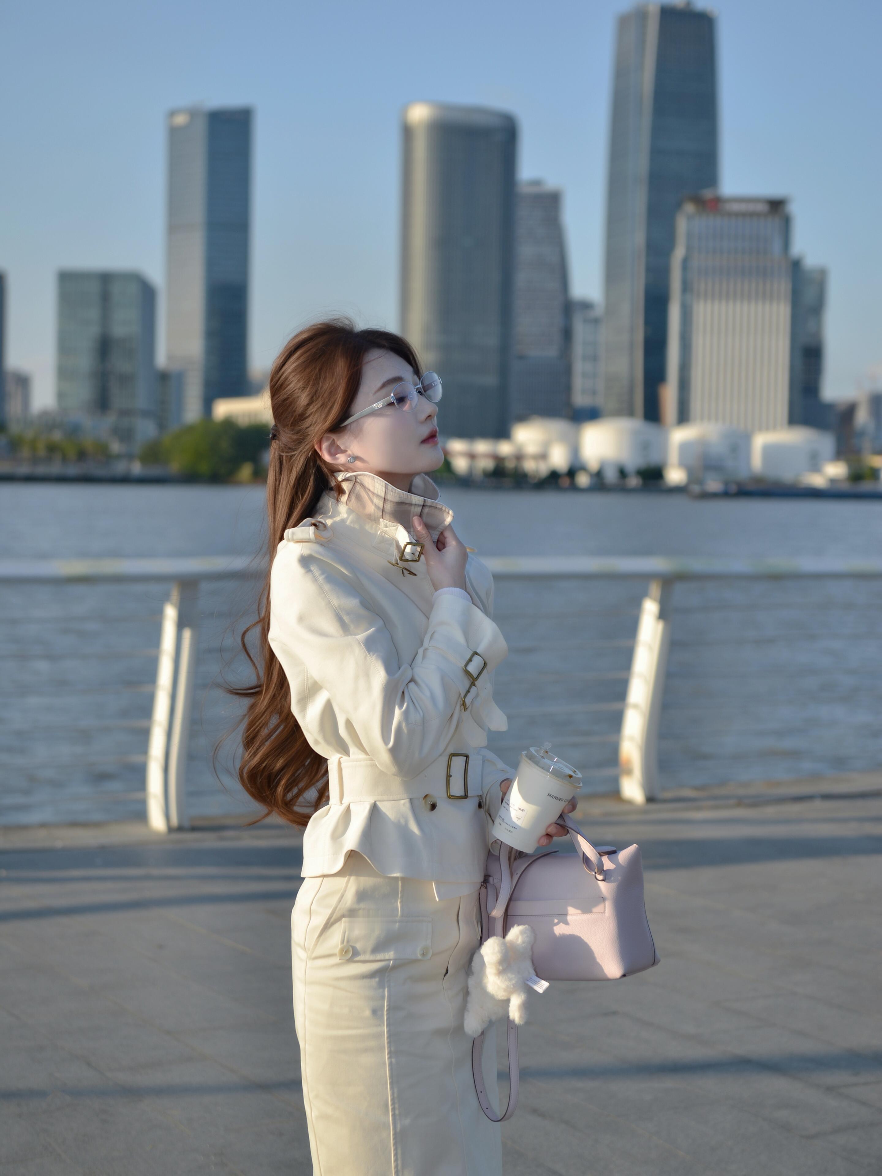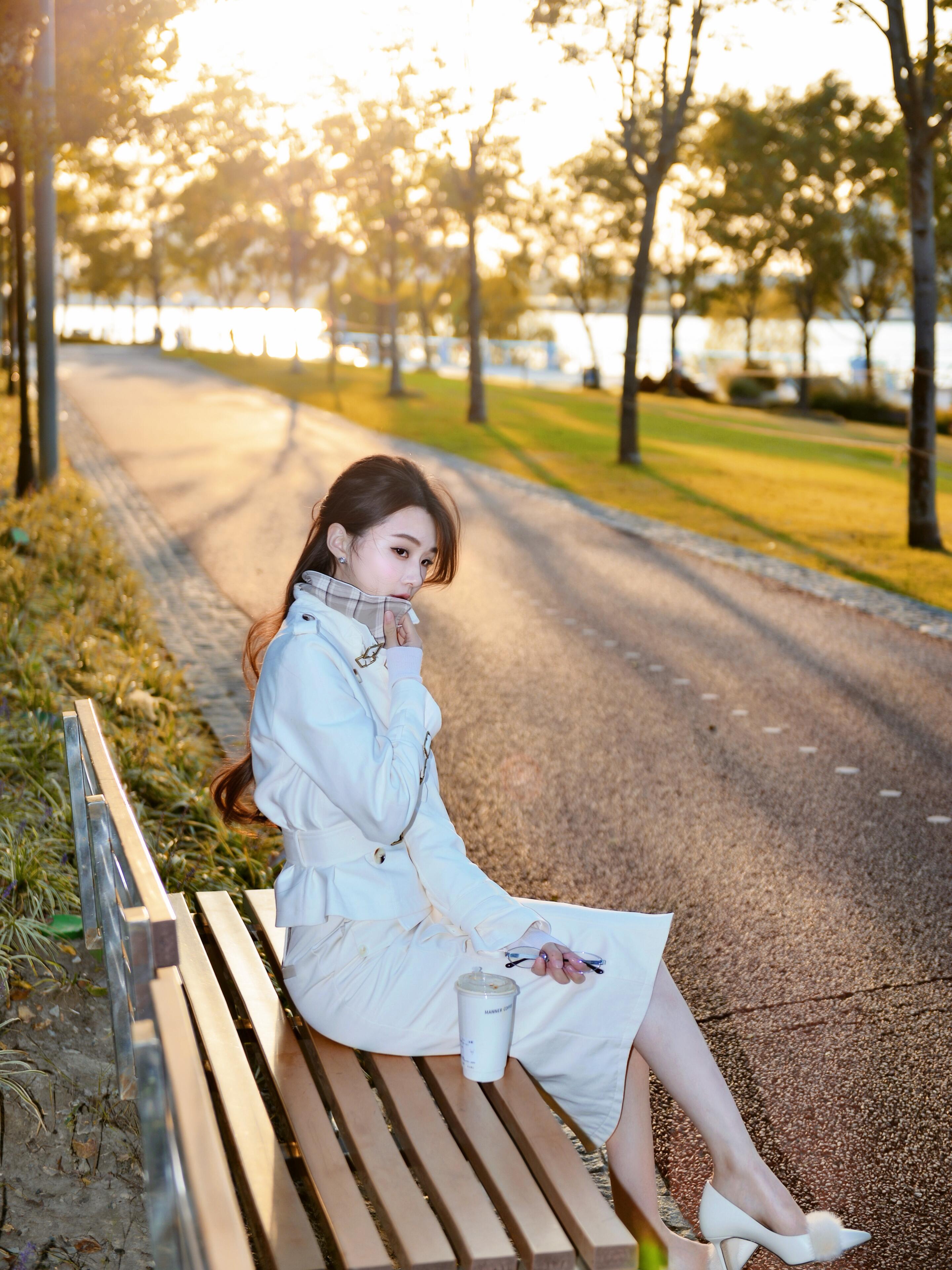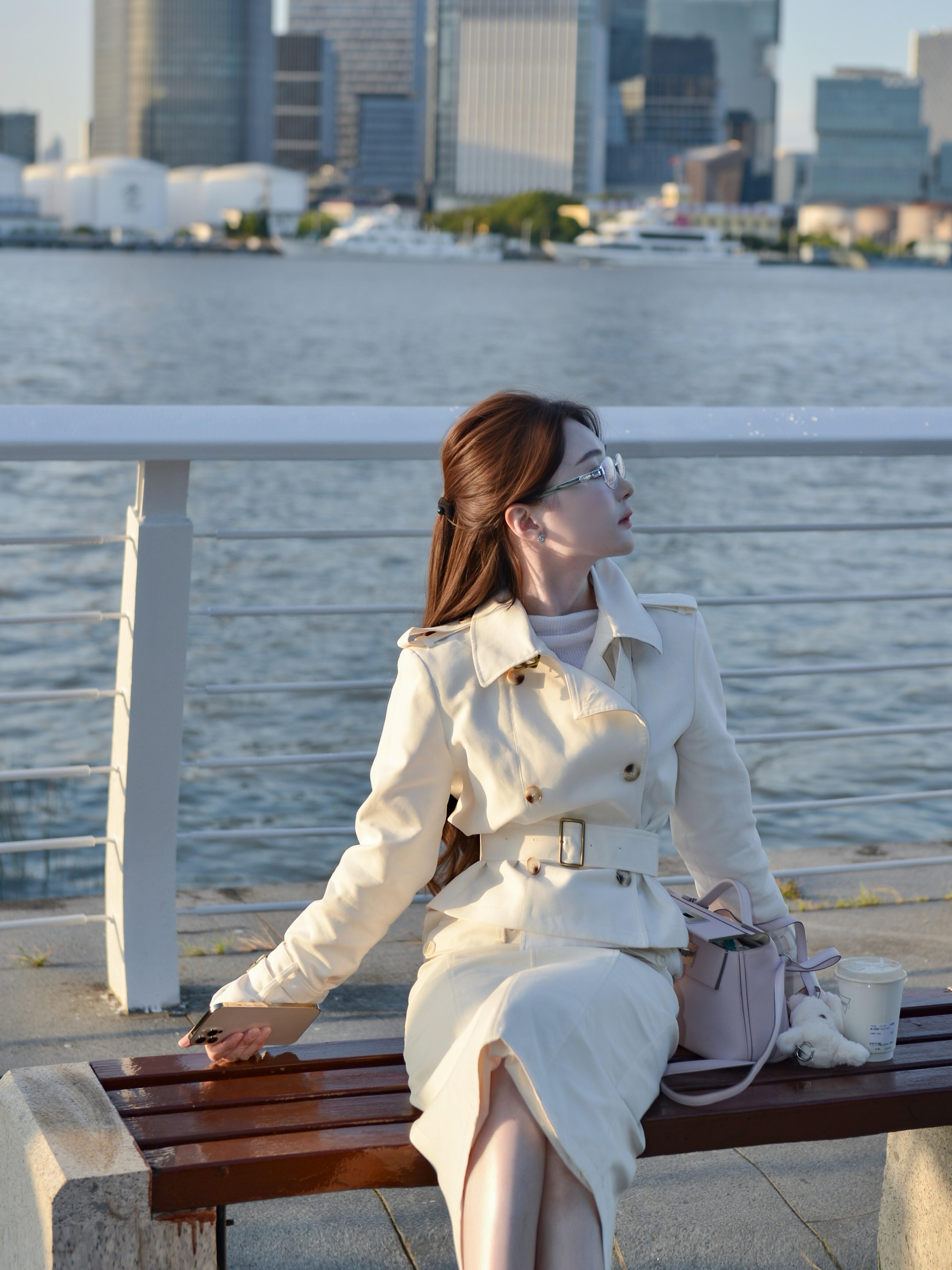 在江边长椅上享受宁静时光白色套装裙与都市背景相得益彰都市丽人穿搭
