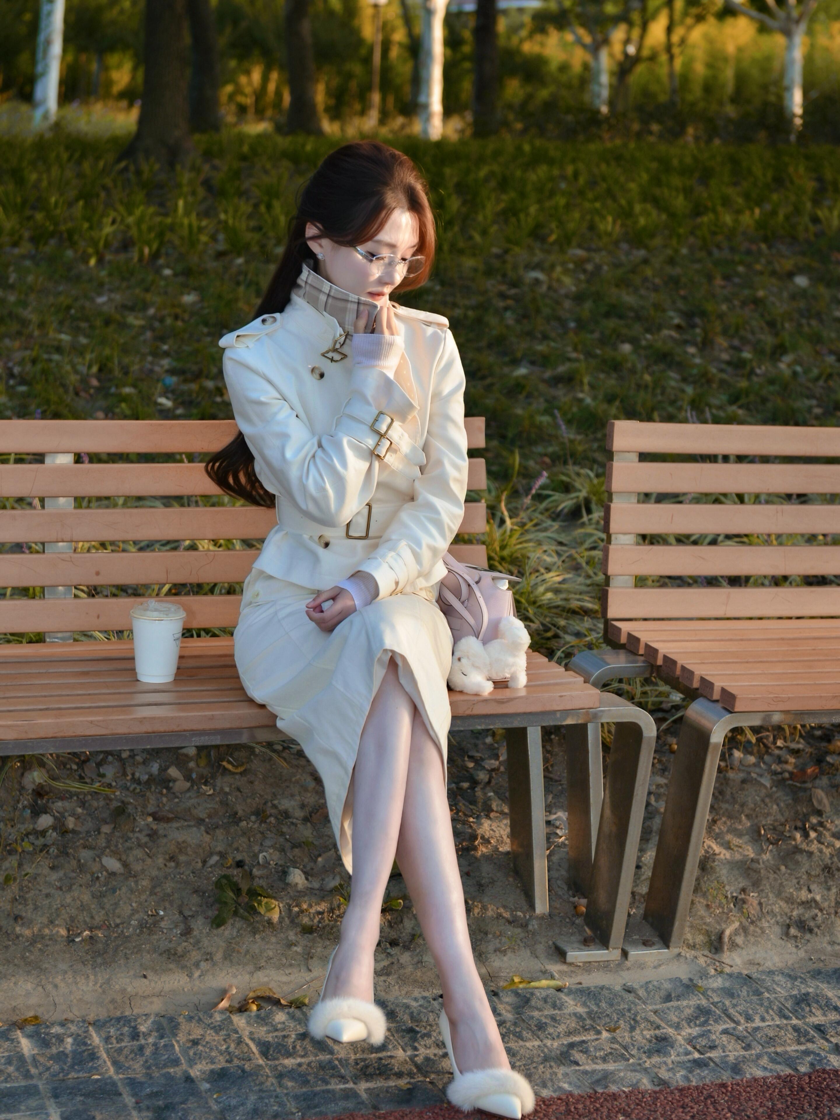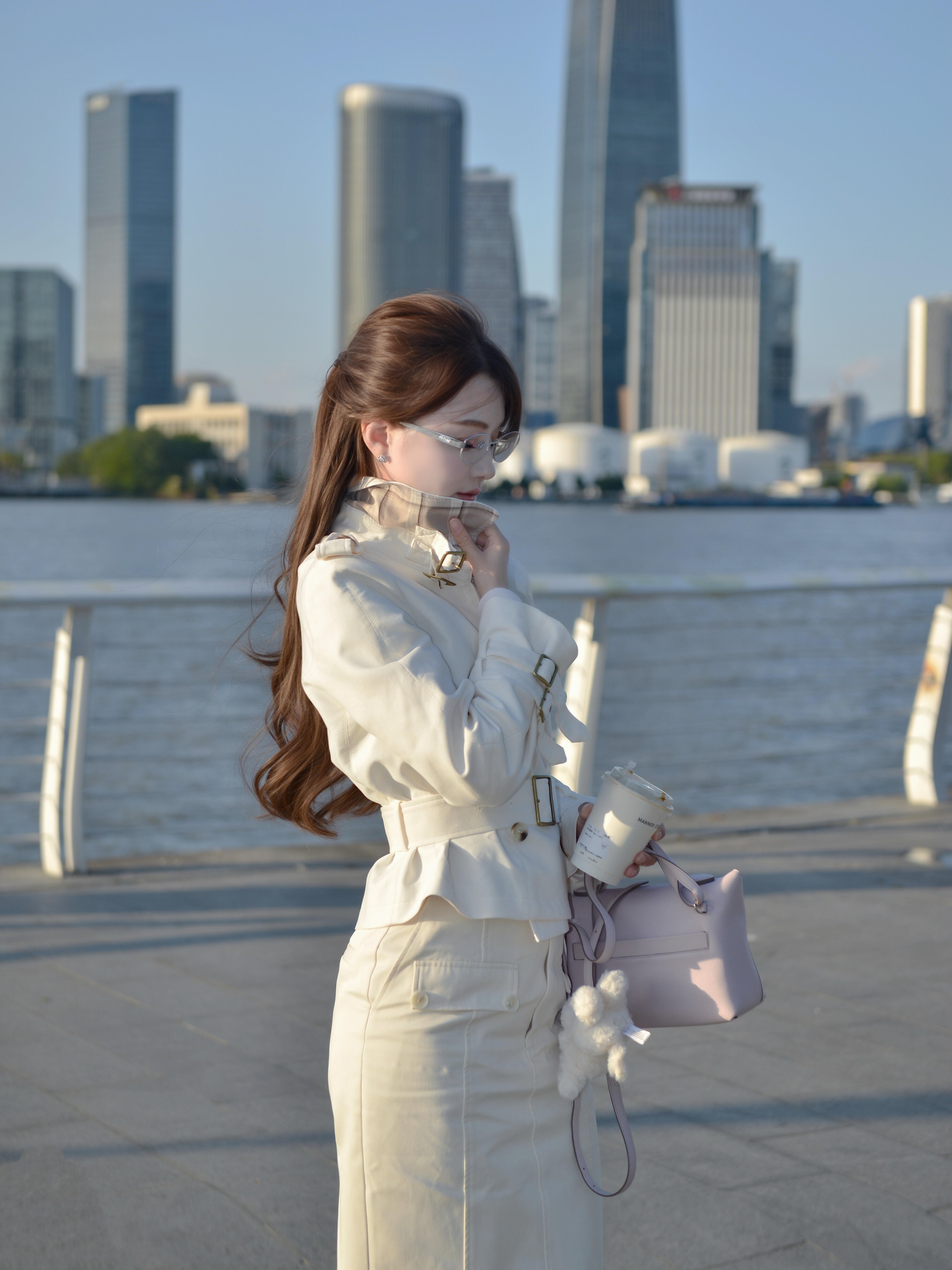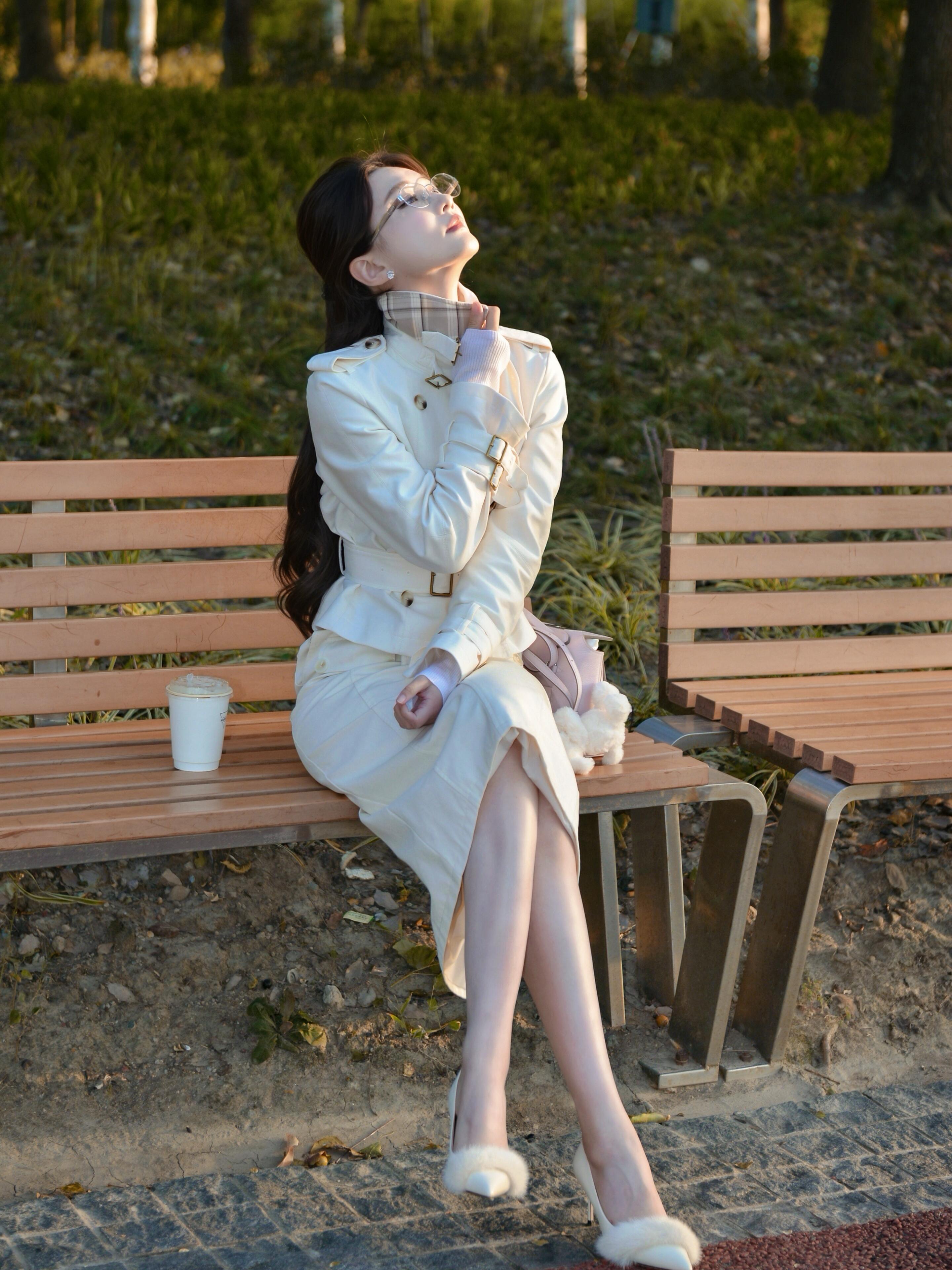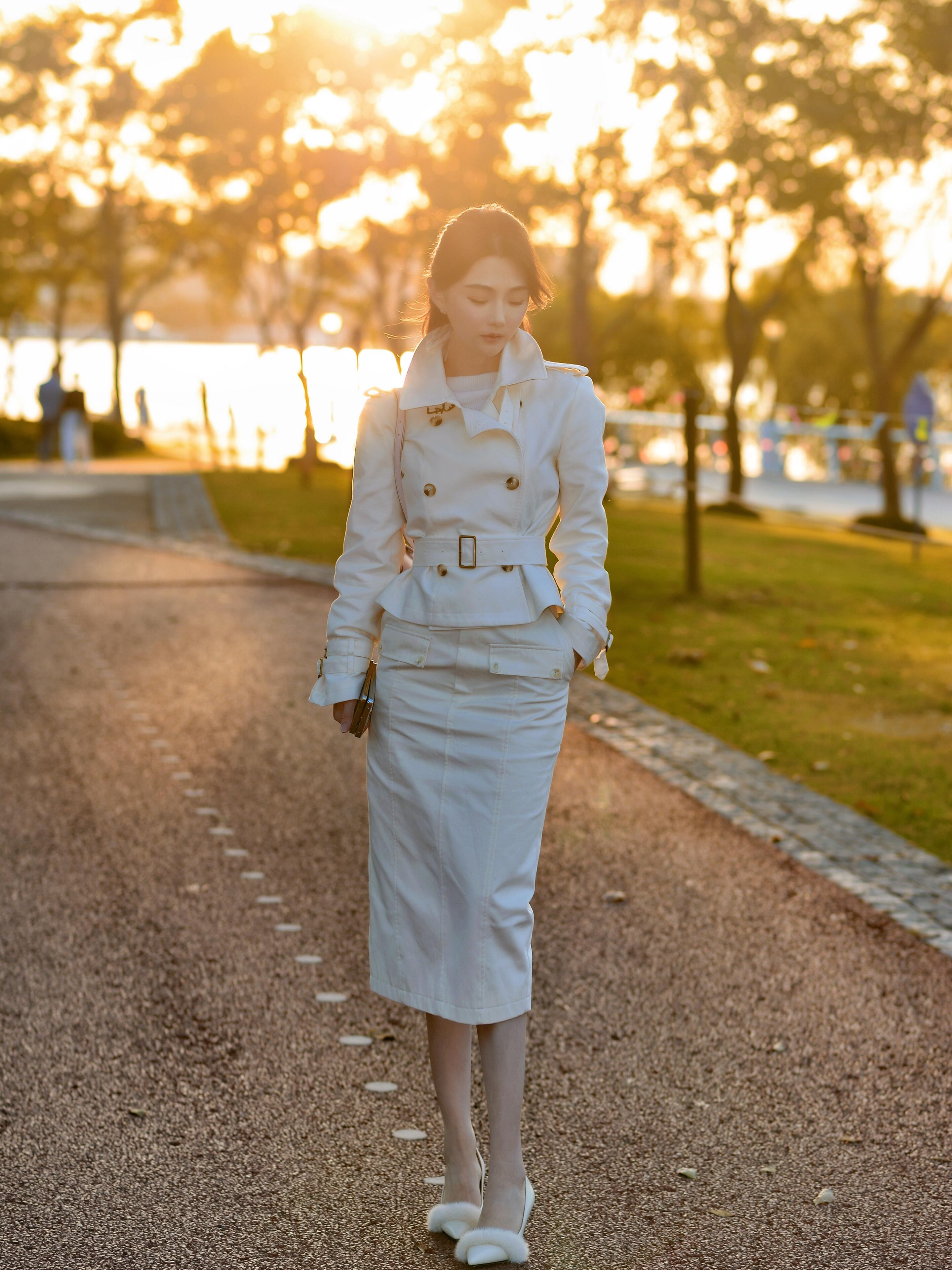 在江边长椅上享受宁静时光白色套装裙与都市背景相得益彰都市丽人穿搭