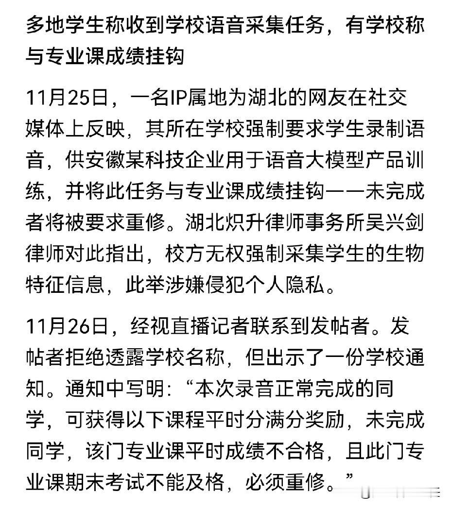 学校现在真的已经成了资本的打手了吗?强制采集学生声音信息,这样的操作让人后背发凉啊! 有多地学生网上反映,学校强制要求采集他们的声音信息,为了完成任务,有的学校竟然把此事和他们的专业成绩挂钩!每个人必须无条件服从! 有强制采集家庭成员信息的、有强制采血的,现在又冒出来强制采集声音信息的,学校到底是什么单位?教书育人的地方怎么变成这样了? 有律师对此评论,声音信息属于个人生物特征信息,学校无权强制采集,企业更是没有资格采集。这绝对是侵犯个人隐私的行为! 采集声音信息的企业说,他们和学校合作,告知学校必须遵循学生自愿的原则,他们也给学校支付了一定报酬,至于有没有给学生报酬,他们并不清楚! 搞懂了,学校都是为了赚钱啊!可是有的钱不能赚你们懂吗?这样的行为是在玷污整个教育行业! 学校非法采集学生信息 痛心!!!