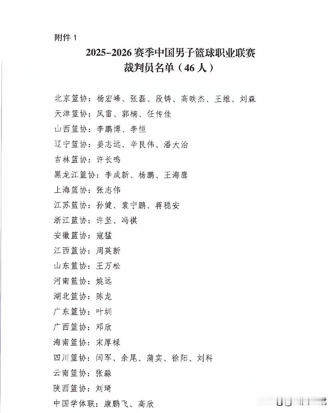 中国篮协又让广东球迷难过了一次!今天,篮协公布了CBA2025-2026赛季裁判员名单。46人中有阎军、段铸等四大名哨。球迷不解的是,这次裁判选用中,北京篮协和四川篮协成为最大赢家,中国篮协使用北京篮协推荐的六位裁判、四川篮协推荐的五位裁判。其次,天津、辽宁、黑龙江、江苏篮协均有3位裁判员。接下来的山西篮协、浙江篮协、中国学体联也幸运地有两位裁判员被选用!吉林、上海、安徽、江西、山东、河南、湖北、广东、广西、海南、云南、陕西篮协仅有一名裁判入选。有个奇怪的现象是,陕西、江西、河南、安徽、湖北、海南等没有CBA球队的省籍,反而选派了裁判员。有CBA球队的省市自治区篮协,反而没有选用裁判员。比如新疆自治区篮协!还有一个特点,夺冠多的篮球强省,比如拿到11冠王的广东省篮协,仅选用了一名裁判员,比平民球队山西汾酒男篮所在的山西篮协还少选用一名裁判员。这让广东球迷多难堪呢?没有裁判员的直接帮助,不知道杜锋指导内心怎么想的?无论如何,不能缴械投降!