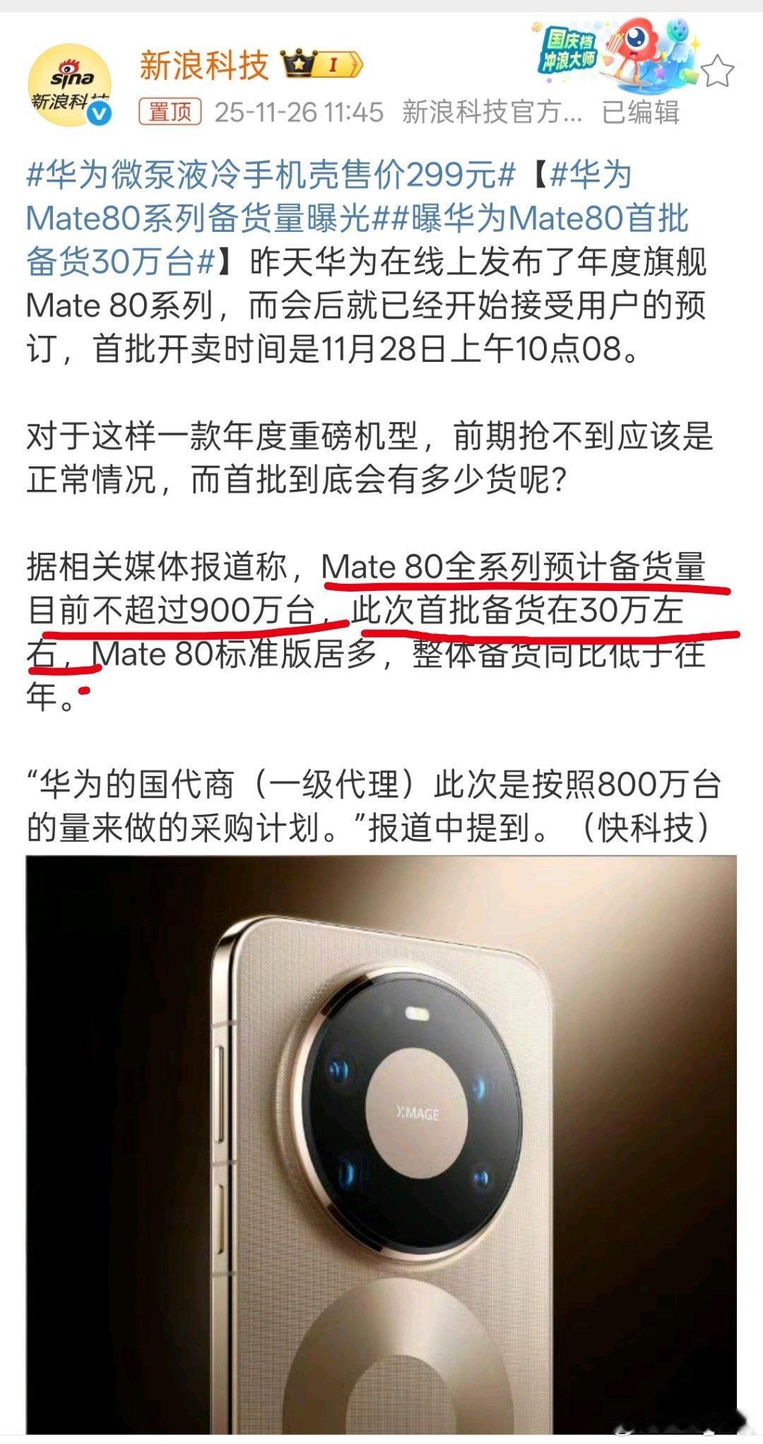 华为Mate80系列备货量曝光明天上午10:08开卖,首批备货30万台,是不是看