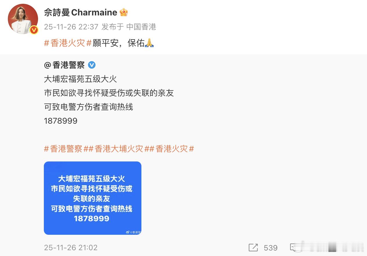 佘诗曼为香港火灾受灾人民祈福 佘诗曼为香港火灾受灾人民祈福:愿平安,保佑🙏🏻