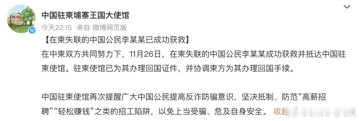 大使馆通报仝卓表弟获救大使馆通报仝卓表弟获救,没事就好!