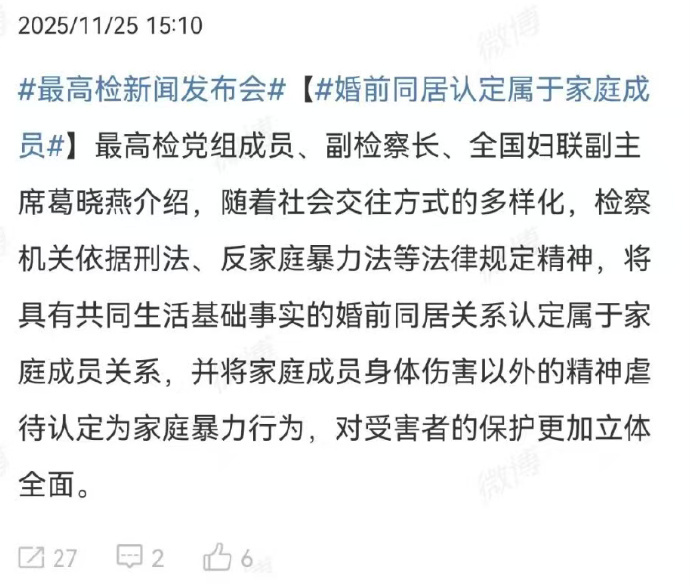 婚前同居认定属于家庭成员前几天全网重提包丽案,就是为这条解释做预热。新的法律标准往往会衍生一系列观念变动,比如情侣关系没救助义务,但家庭成员之间就有了,那么同居情侣如果一方导致另一方自残或自S且不救助,就需要承担法律责任(情侣间不需要),最高检解释初衷是为了防家暴,家暴受害者当然不分男女,比如「经济控制」「情感暴力」和身体伤害一样,同样被视为家暴,现在也适用于同居情侣男女双方了。其实业内人士一看,就知道这是往曾经的事实婚姻的影子靠,尽可能的让接近婚姻的一切关系都纳入责任义务范畴。