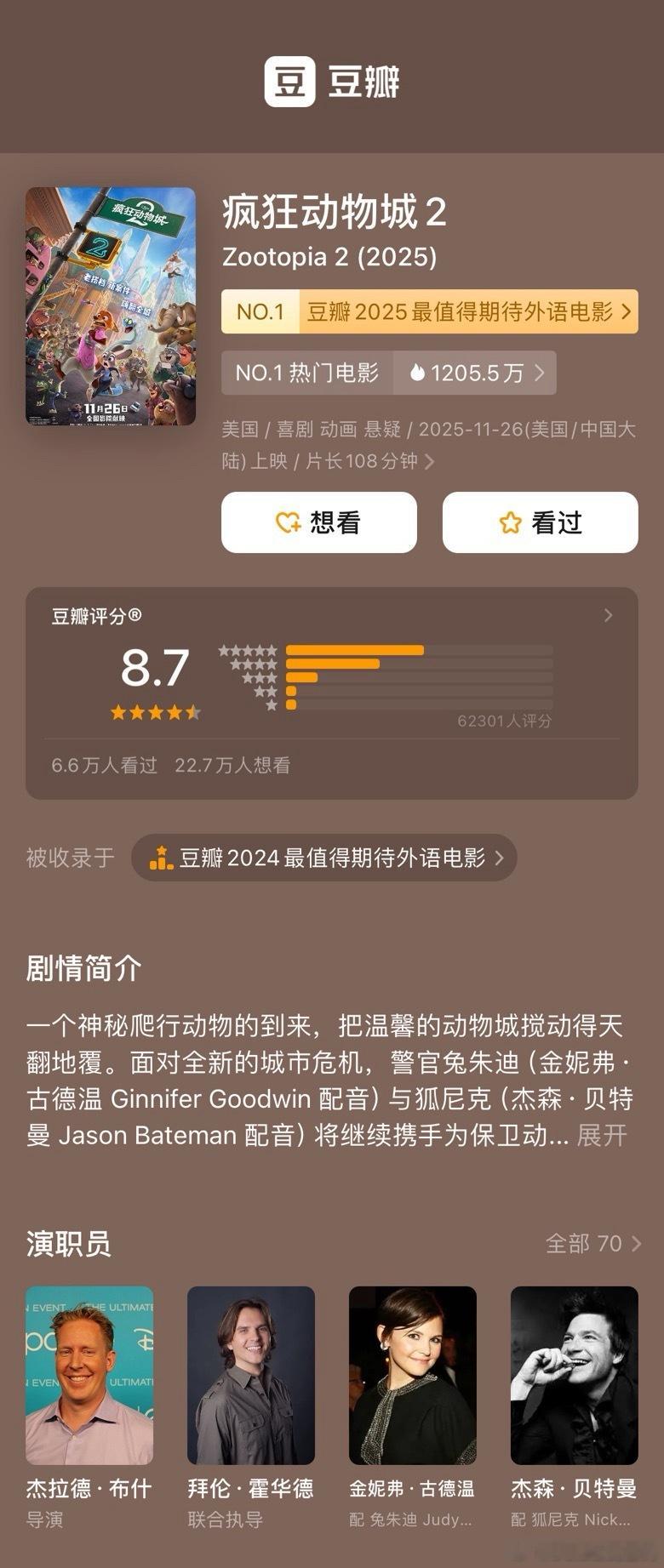 疯狂动物城2开分豆瓣开分8.7果然分高就开得快……上线第一天就火速开了评分是电影必争之地吧首日票房2.3亿动物城第一部9.3