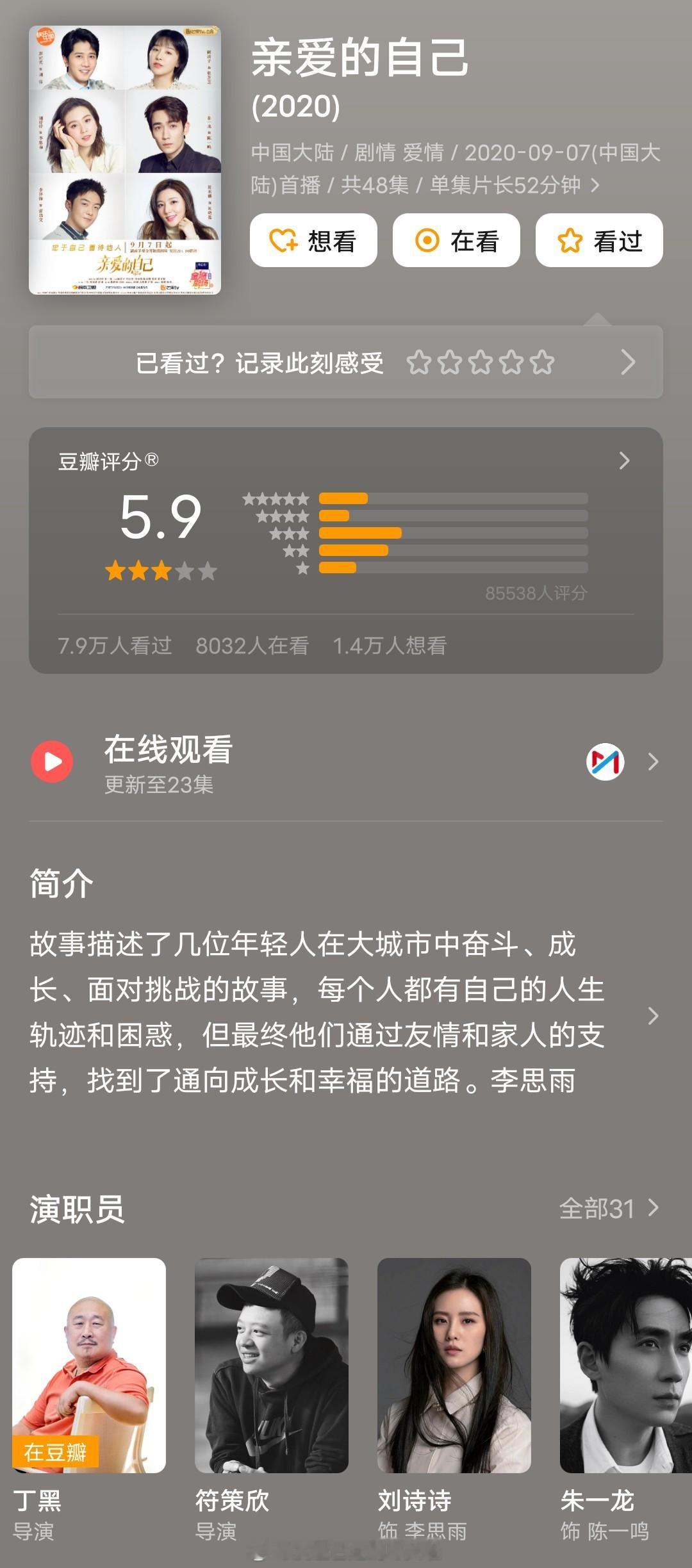 刘诗诗、朱一龙《亲爱的自己》芒果TV总播放量史冠、集均播放量史冠。芒果史冠
