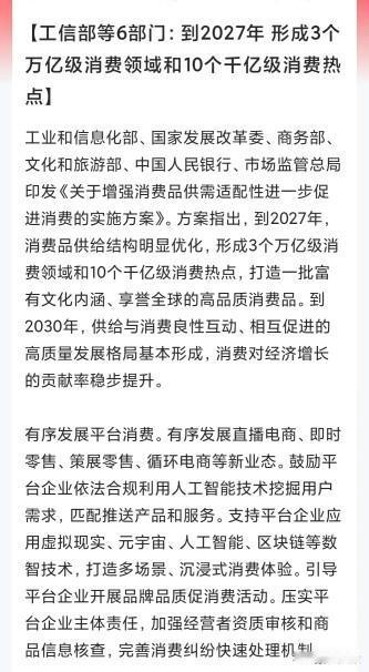 万亿级别的消费利好来了,但是利好出现后市场波澜不惊 昨晚,万亿级别的利好宣布了,将会形成3个万亿级别的消费领域,还有10个千亿级别的消费领域。 这是实打实的催消费政策,就是为了增加消费,以达到内循环的目的。在拉动经济的三驾马车里面,消费是薄弱环节,催消费刻不容缓。 消费确实应该催进,关系到内循环,关系到GDP的增长但促销费跟民众的钱袋子有关,提高薪资水平,国民有钱了才能消费,这也是昨天利好出来后,消费板块并没有什么反应的主要原因。