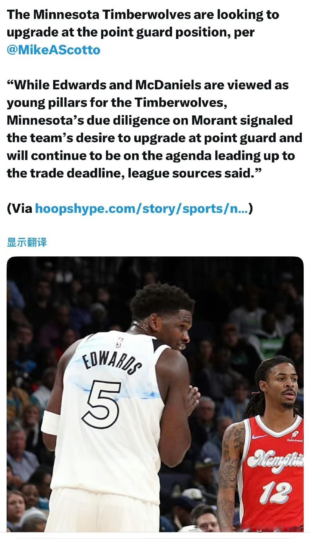 森林狼要升级控球后卫!!!森林狼对莫兰特开展尽职调查! 根据记者Michael Scotto最新消息透露,明尼苏达森林狼有意寻求交易来升级他们薄弱的控球后卫! 我从相关渠道获悉,爱德华兹仍然是森林狼的绝对核心,麦克丹尼尔斯也是他们未来的重要球员,但是森林狼仍然在考虑灰熊的莫兰特,似乎可以看出他们对当前后卫线的不满。 但是考虑归考虑,你考虑谁不好,非要考虑莫兰特呢,这不是好好的一盘棋要自己给自己掀翻了吗。 莫兰特明显是不适合森林狼的,而且他也不适合和华子做搭档,本来华子还有点希望冲击下西部,莫兰特来了直接可以放弃了。 森林狼还是要换个交易对象,可以控球但是不占球权的可以尝试一下,大家觉得谁适合森林狼呢? 灰熊控卫莫兰特 森林狼 爱德华兹森林狼 爱德华兹 莫兰特