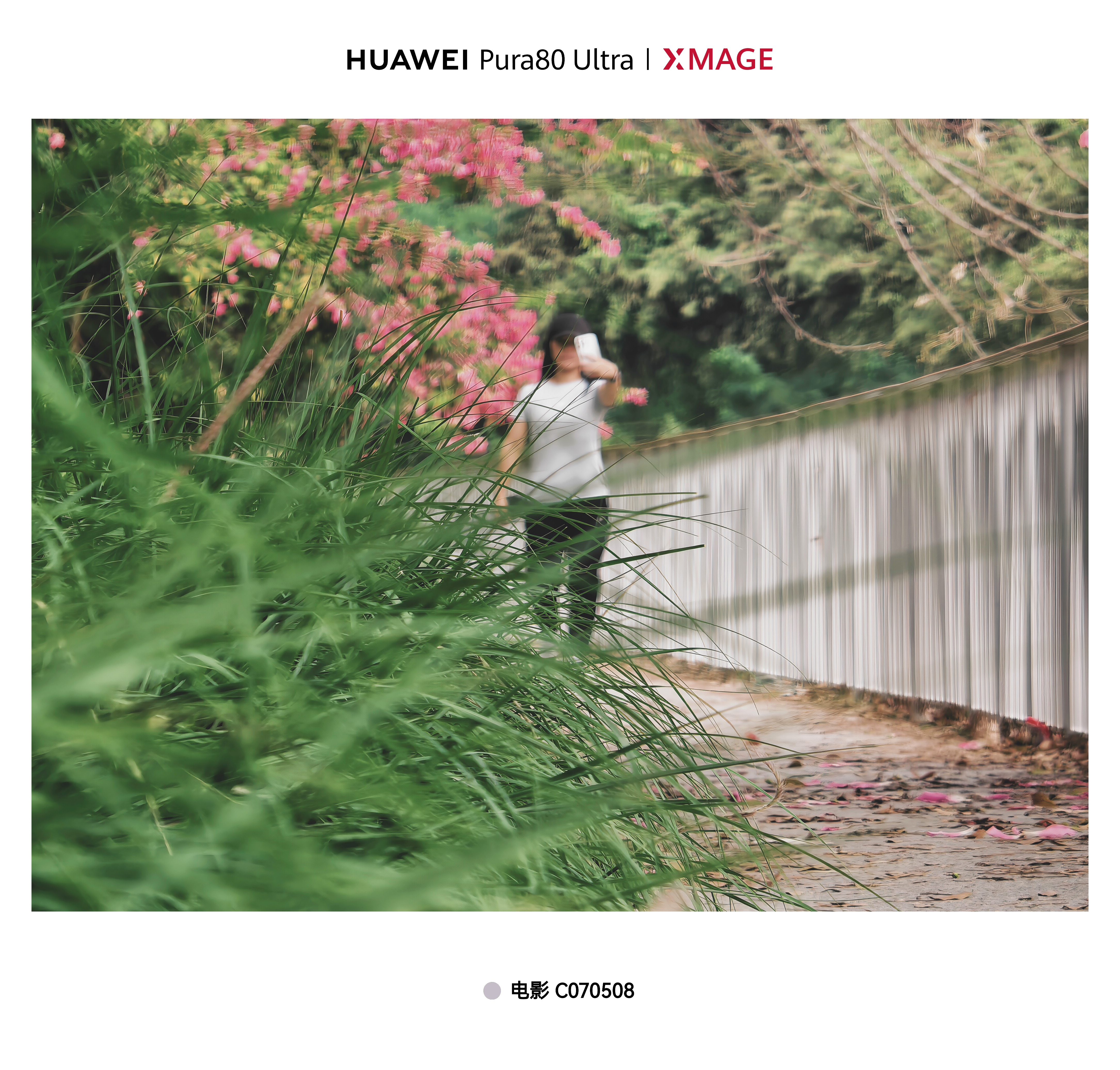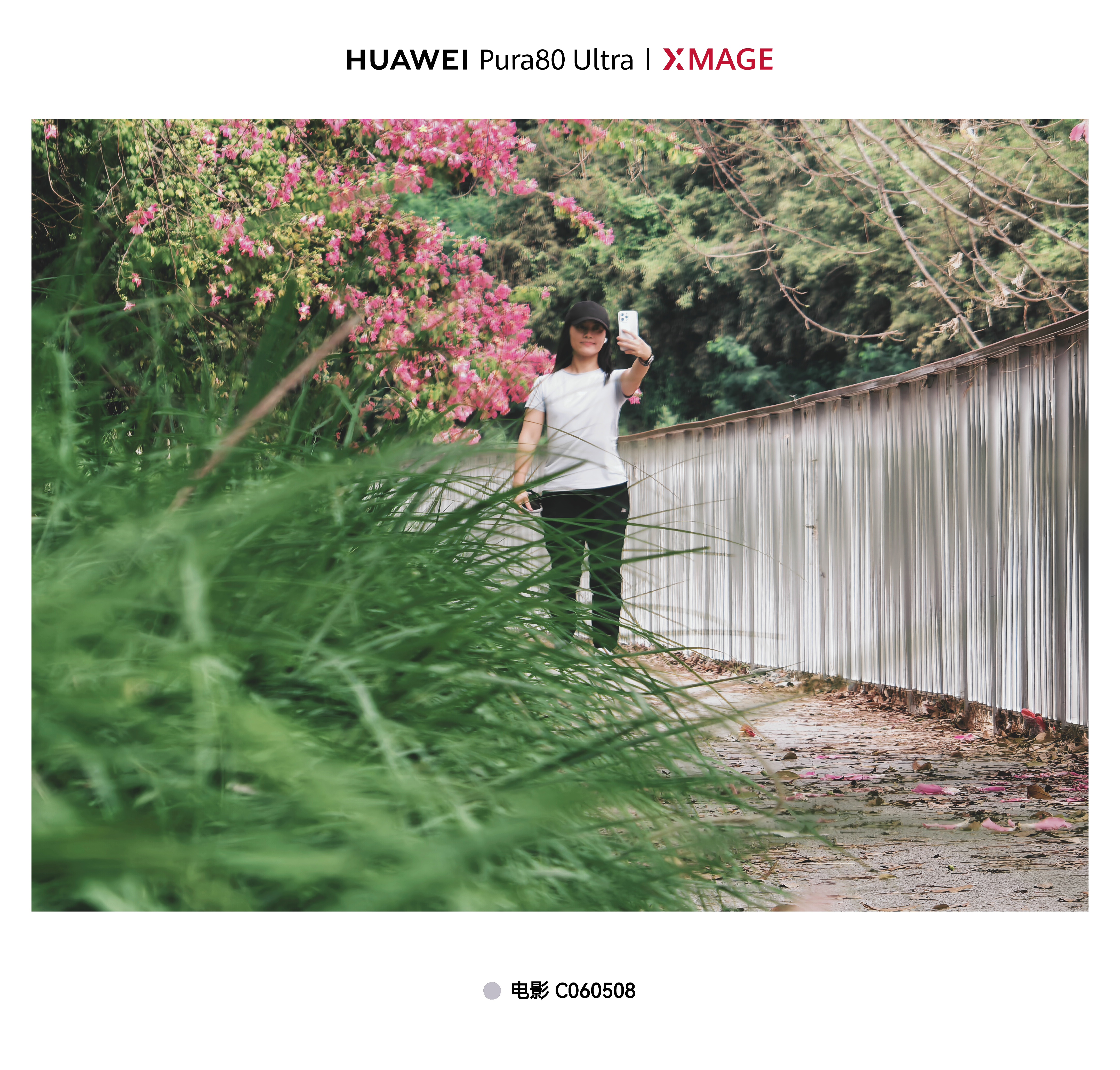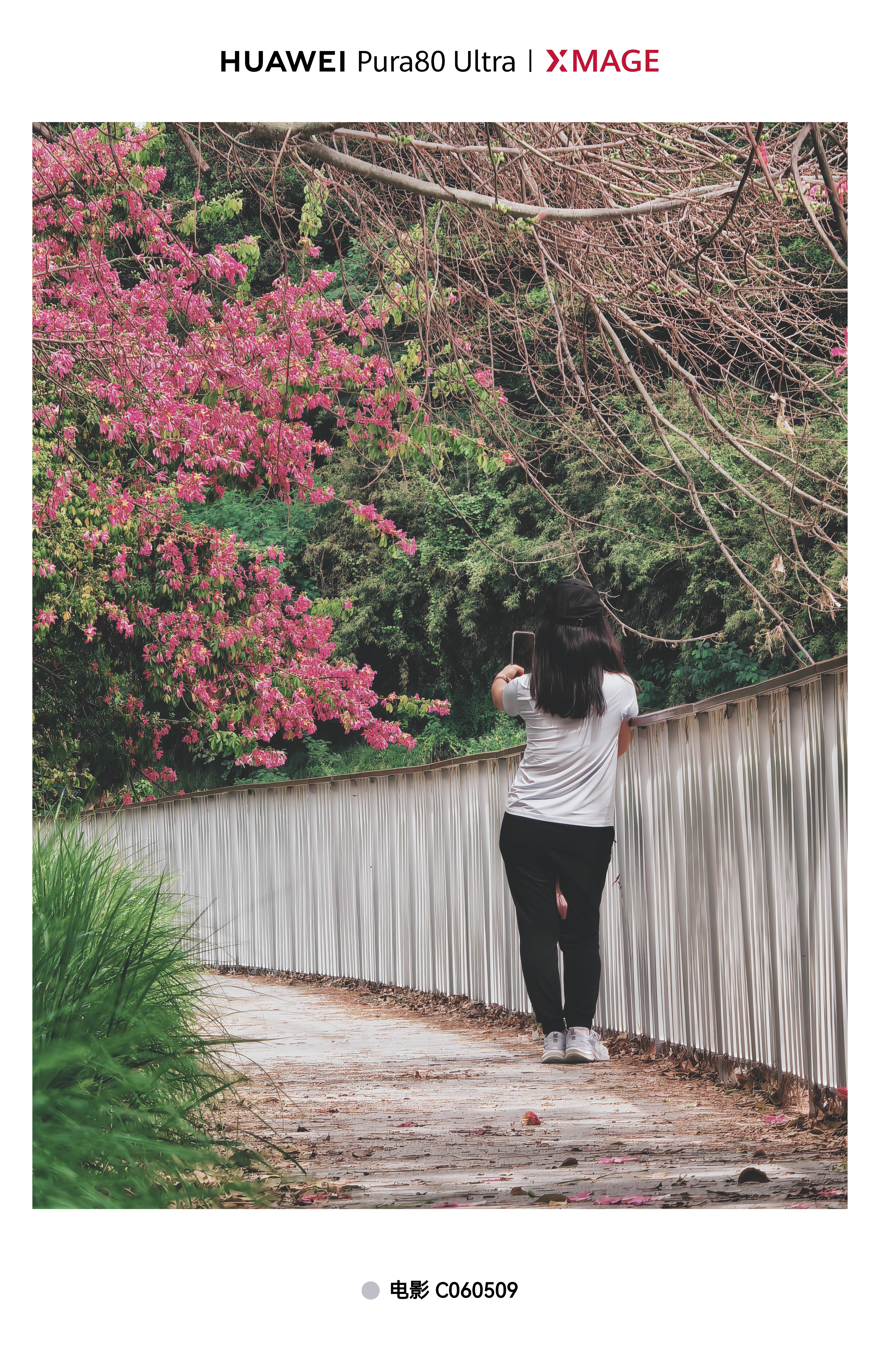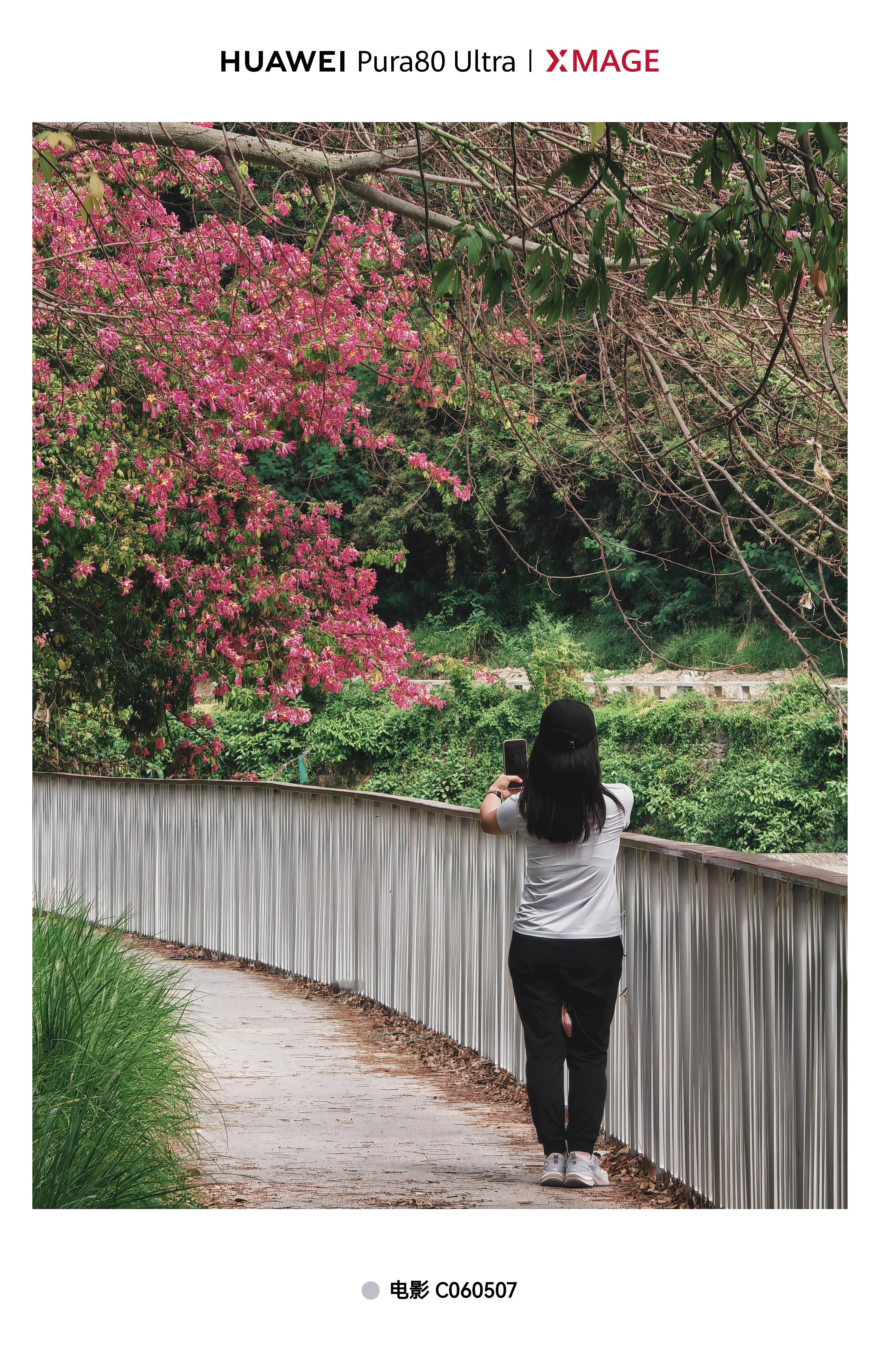 《Pura80ultra模特是靠着护栏拍照的小姐姐》,深圳冬季木棉花: Pura80ultra抓拍记木棉花盛开的观澜河,小姐姐靠着护栏,弯着腰拍照。华为Pura80ultra XMAGE 影像 电影 个性色卡 10倍定焦拍摄