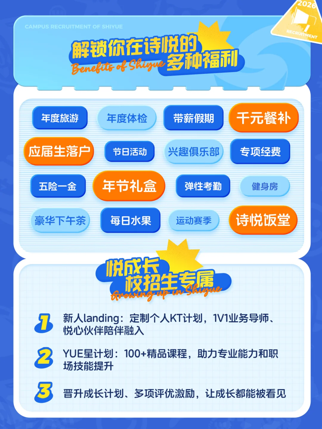 诗悦会为校招生量身定制系统化的“YUE星计划”,包含校招生成长地图、1V1导师、定制KT计划等内容,另有100+精品课程,帮助新人快速提升专业能力和职场技能。