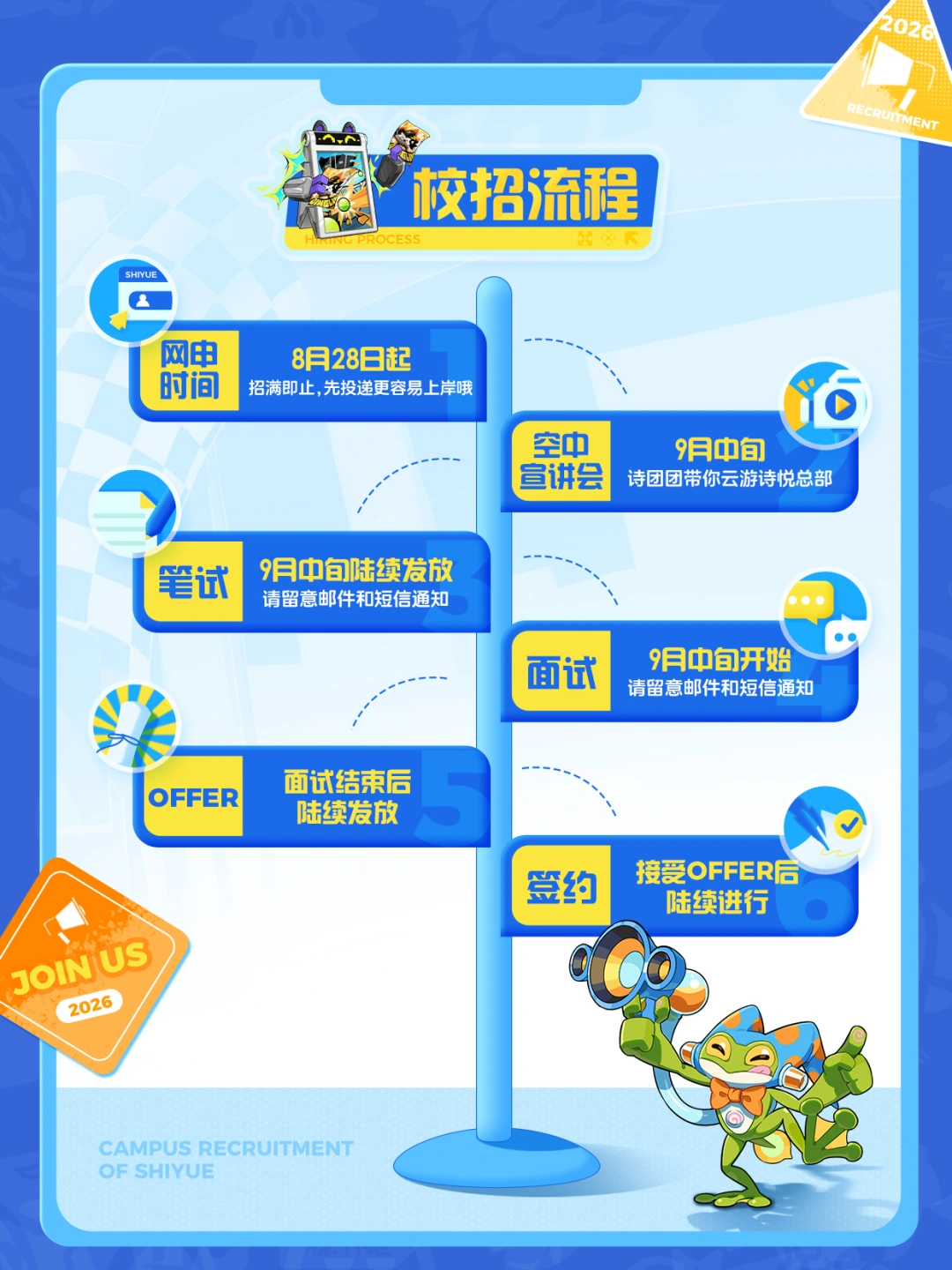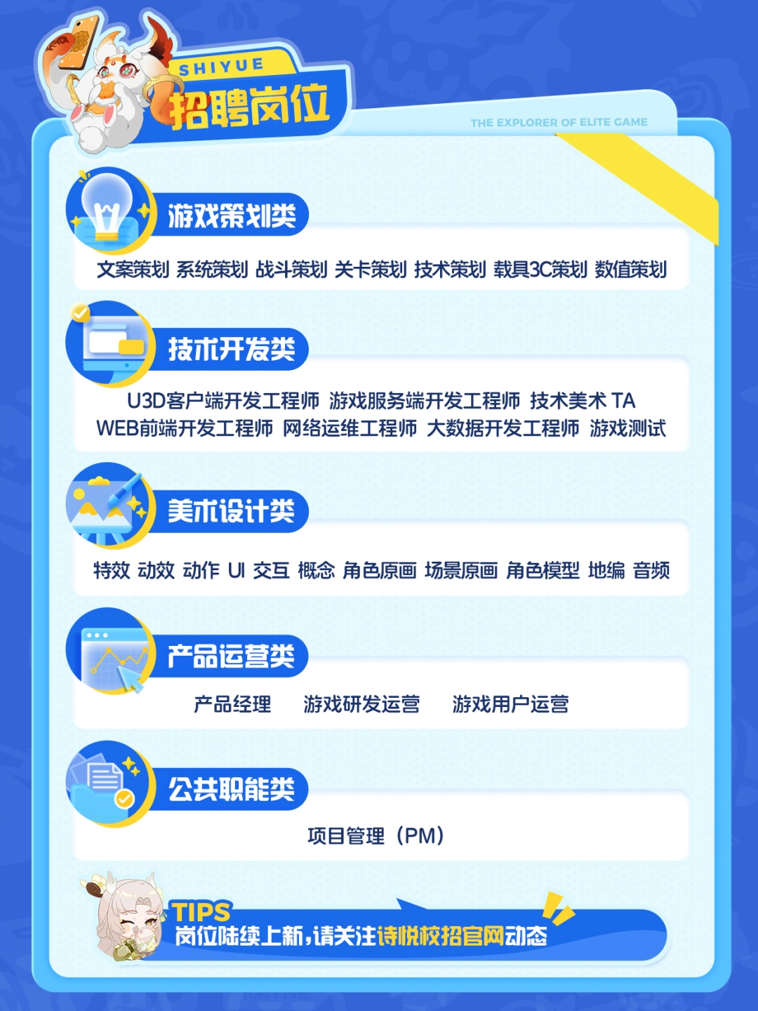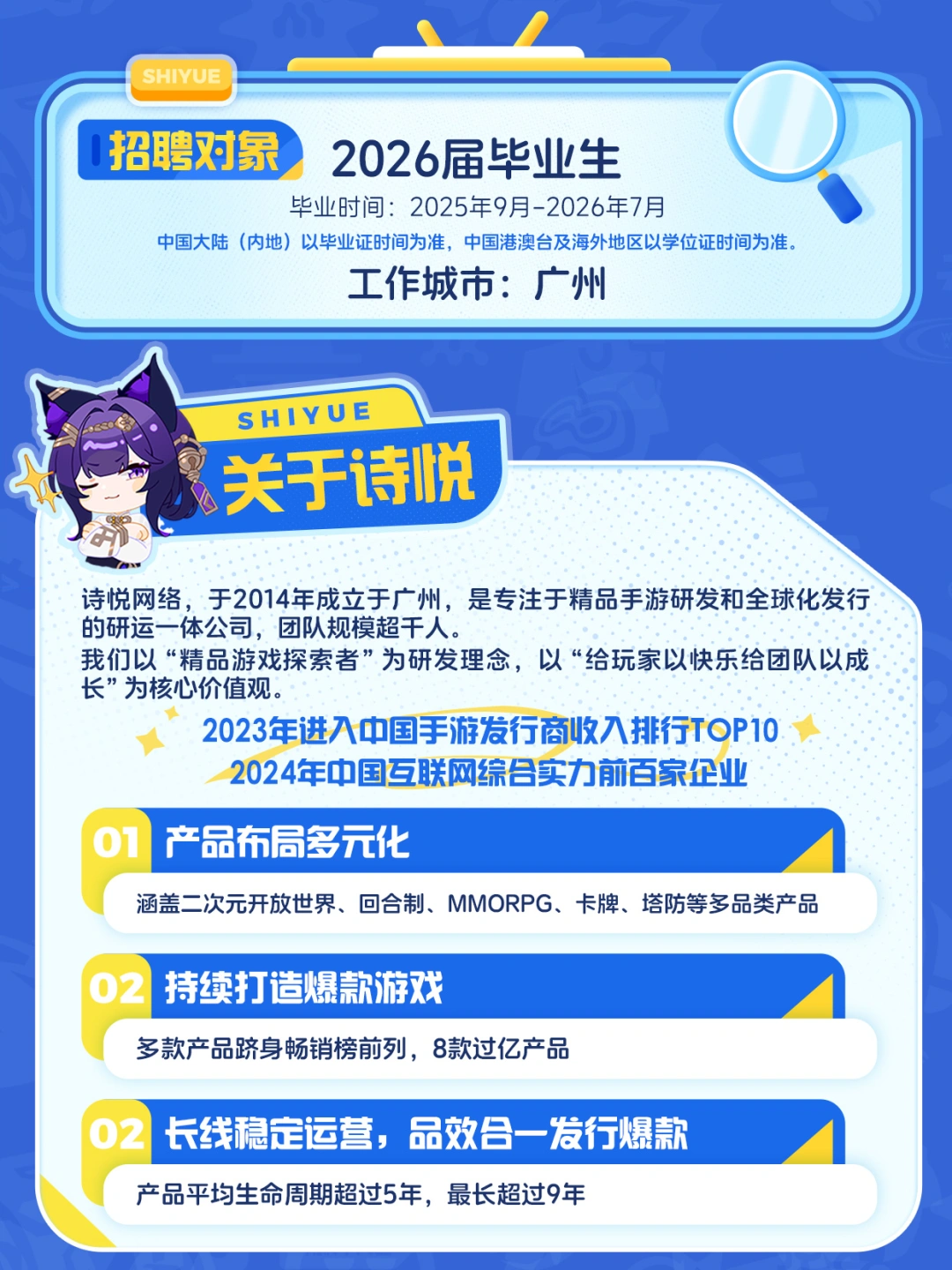 本届校招,诗悦面向26届毕业生开放游戏策划类、技术开发类、美术设计类、产品运营类、公共职能类,五大类岗位。工作地点全部位于广州。