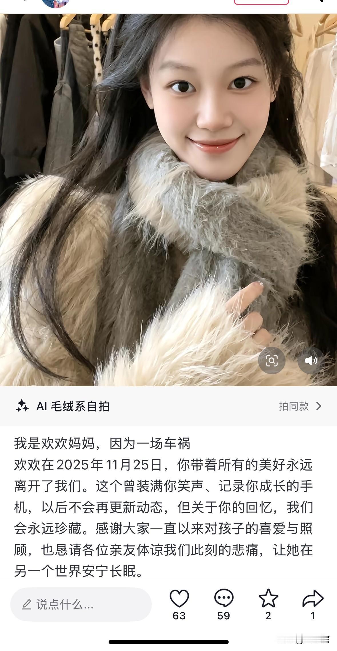 11月26日报道,多漂亮有活力的一个女孩子啊!可是,因为一场车祸,她20岁的生命永远停留在了2025年11月25日。[黑线] 就在几天前,一位网名为“欢欢”的二十岁女孩,因一场车祸不幸离世,她的生命终止在2025年11月25日。 欢欢出生于2005年,在家中排行老大,她常在社交平台分享自己的生活点滴,尤其爱展示厨艺。视频里的她,总是系着围裙,一边翻炒锅里的菜,一边对着镜头笑。 10月31日,她更新了最后一条视频,画面里,她正认真地给家人包饺子,手上沾着面粉,笑容一如往常。 谁也没想到,这成了她与大家的最后一面。11月初,欢欢遭遇严重车祸,经过二十多天抢救,最终没能醒来。 11月26日凌晨,她的母亲用她的账号发布了讣告,这位母亲写道,“你挣脱了世间所有疼痛,化作天上最亮的星,下一世,我们再续母女情。” 这段文字让无数网友落泪,一位失去女儿的母亲,选择用最温柔的方式与孩子告别。 悲剧发生后,我们除了哀悼,更该思考如何避免类似事故,根据交通部门数据,青少年在交通事故中受伤的比例居高不下,很多事故都源于瞬间的疏忽。 比如过马路时,不要只顾看手机,要多留意转弯车辆,司机在路口起步前,最好多观察一眼盲区,这些细节,关键时刻能救命。 夜间步行时,建议穿浅色或反光材质的衣物,骑电动车时,佩戴合格的安全头盔能大幅降低重伤风险,这些看似简单的措施,却是生命的保障。 欢欢的故事让人心痛,也提醒我们,安全不是老生常谈,而是每个人都要时刻牢记的准则,生命如此珍贵,又如此脆弱。 希望大家,都要多加注意自己的安全 “真的太难受了,早上刷到她妈妈发的那段话,眼泪直接就掉下来了,才20岁,人生才刚刚开始啊,老天爷真是不公平。” “和我女儿差不多大,也是整天在家里蹦蹦跳跳的,完全不敢想象这位妈妈现在有多心痛,这种打击真的是一辈子的阴影,愿孩子安息,也希望家人能为了孩子坚强下去。” “看了她之前的视频,多阳光开朗的一个姑娘啊,做的菜看起来也很有食欲,意外和明天真的不知道哪个先来,这句话现在体会太深了。” “十月底还在更新,十一月底就天人永隔生命太脆弱了,大家出门在外,无论是开车还是走路,一定一定要眼观六路,耳听八方,安全第一,这不仅是为了自己,也是为了爱你的家人。” “每次看到这种年轻生命因为意外逝去的新闻,都会给自己敲一次警钟,开车再也不路怒了,过马路也绝对不看手机了,没有什么比平安到家更重要。” “作为一个司机,我想说,在路口真的拜托减速慢行,尤其是没有红绿灯的地方,作为行人,也千万不要以为车子肯定能看到你肯定会让你,双方都多一份小心,可能就能避免很多悲剧。” “她妈妈说的‘下一世再续母女情’,真的破防了,这得是多大的不舍和念想,希望时间能慢慢抚平他们心中的伤痕吧。” 关于道路安全法规的具体细则和事故预防数据,我们可以参考哪些权威信息来增强意识呢? 信源:红星新闻